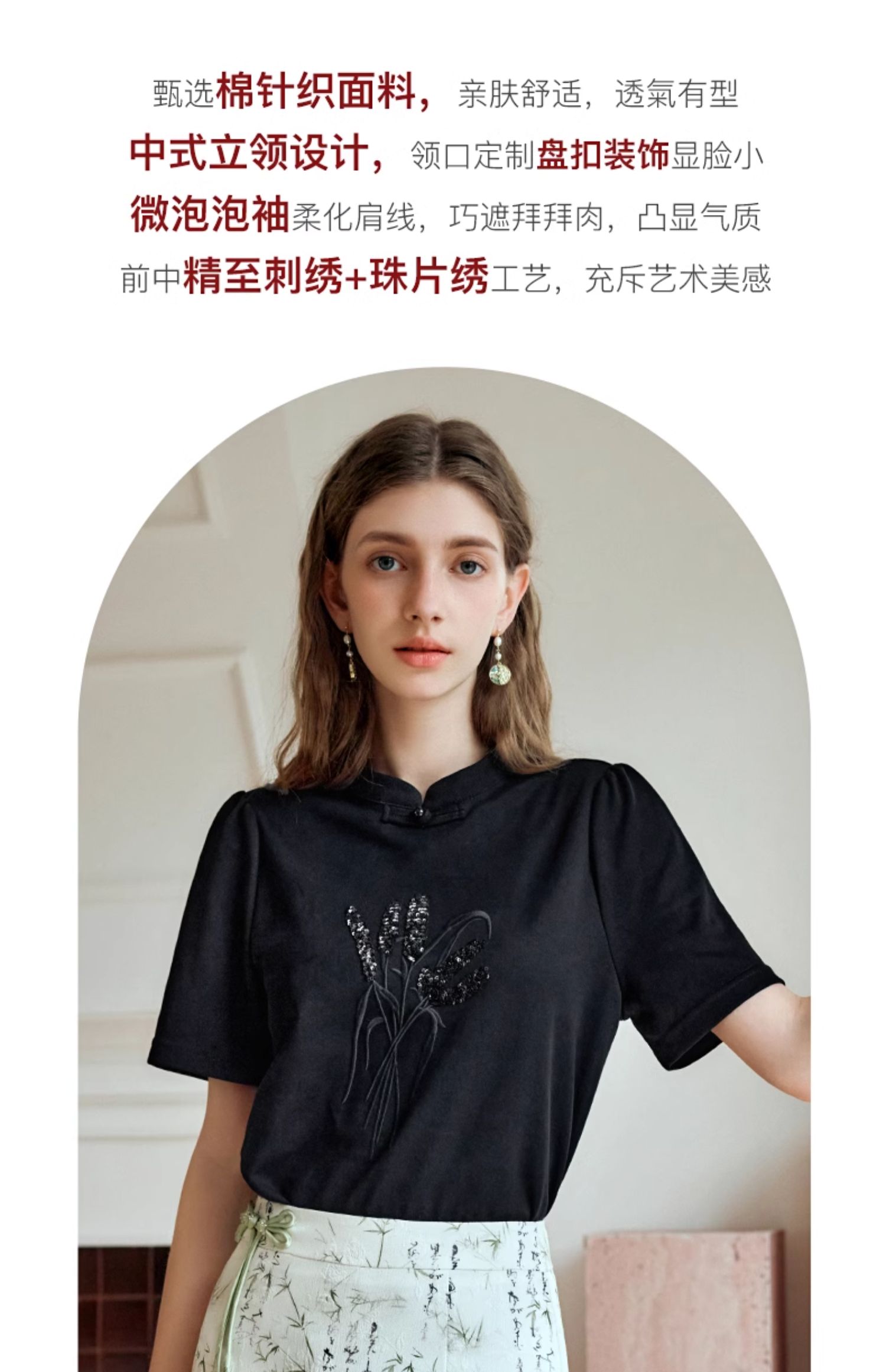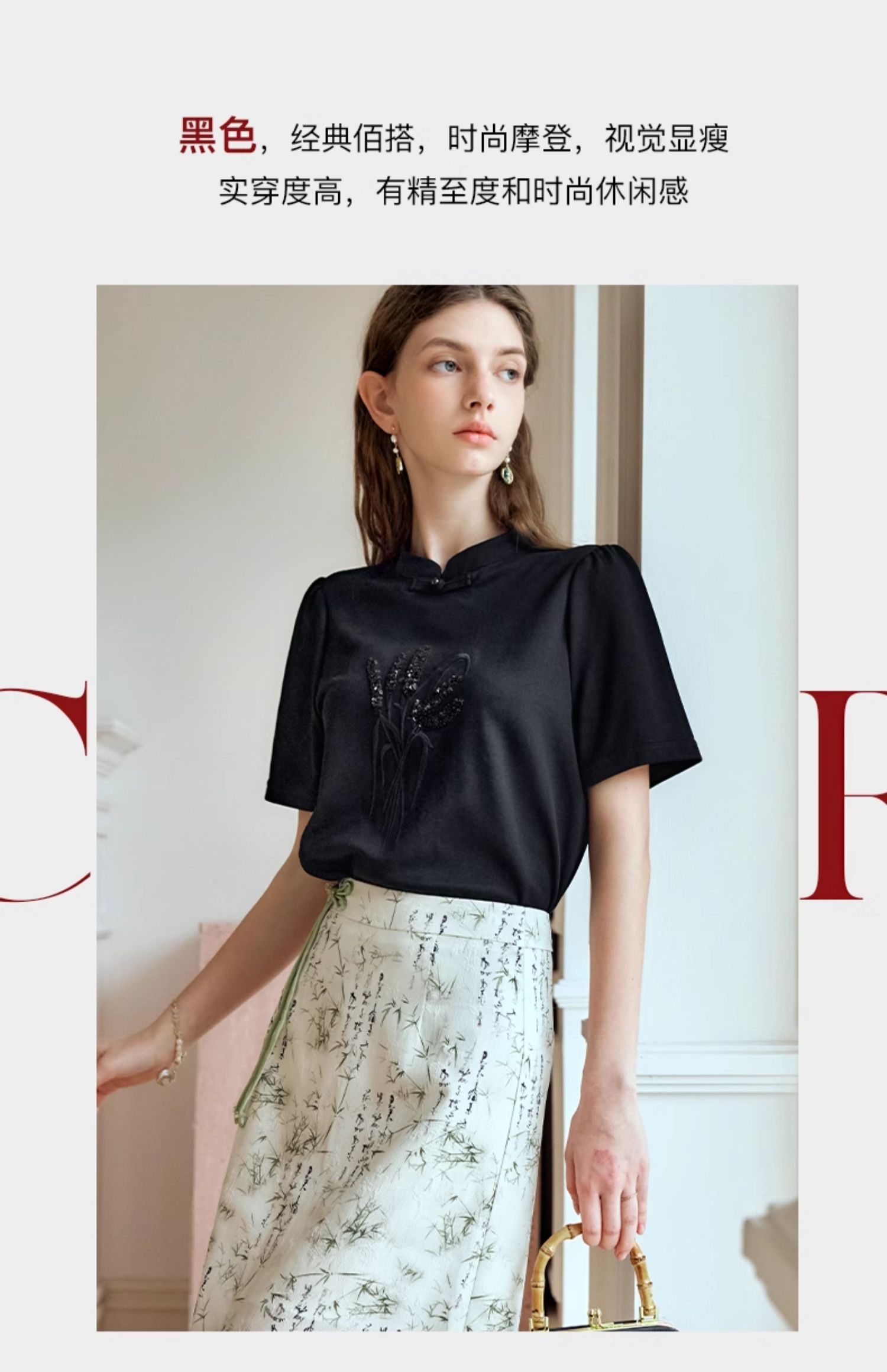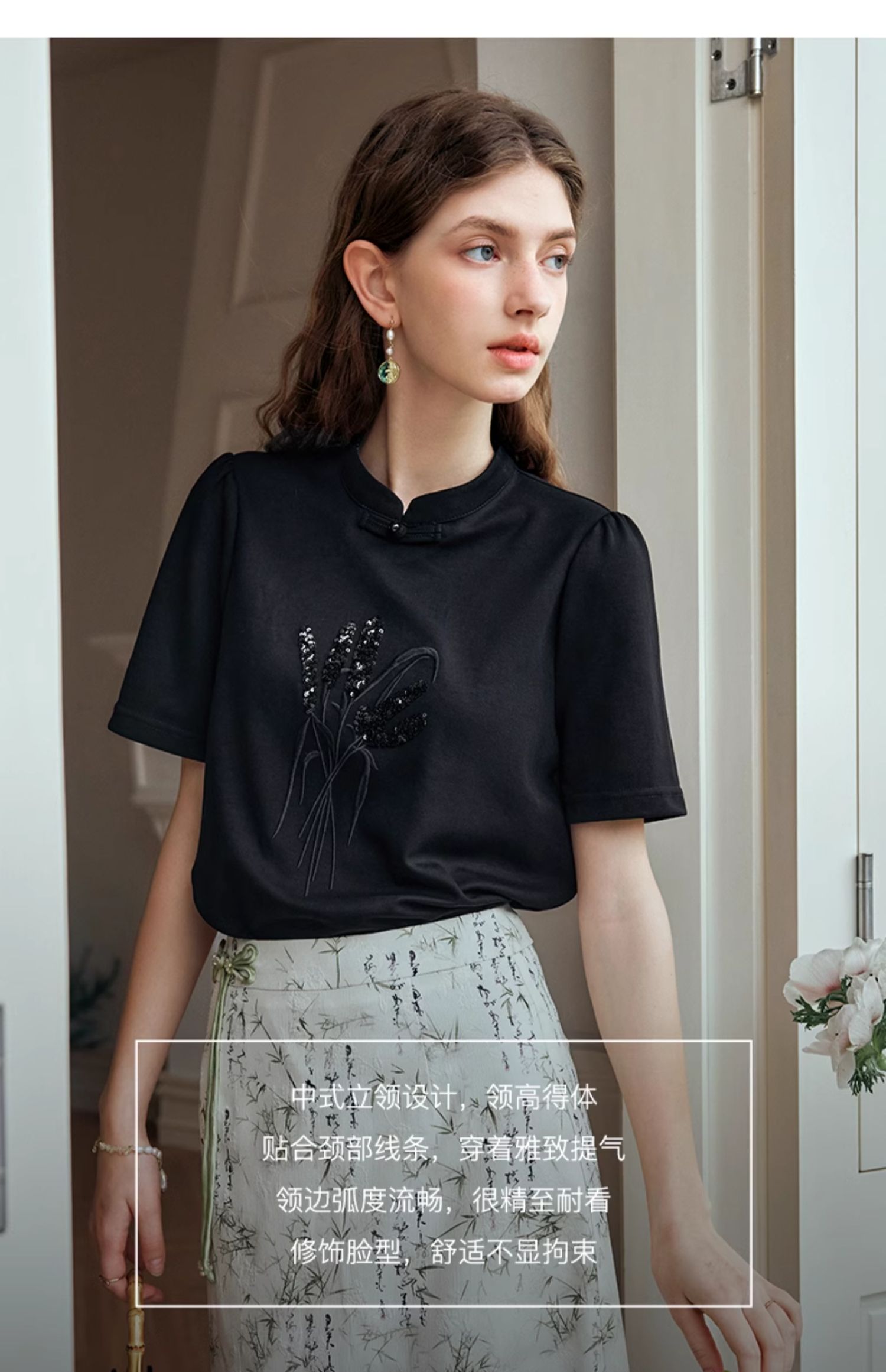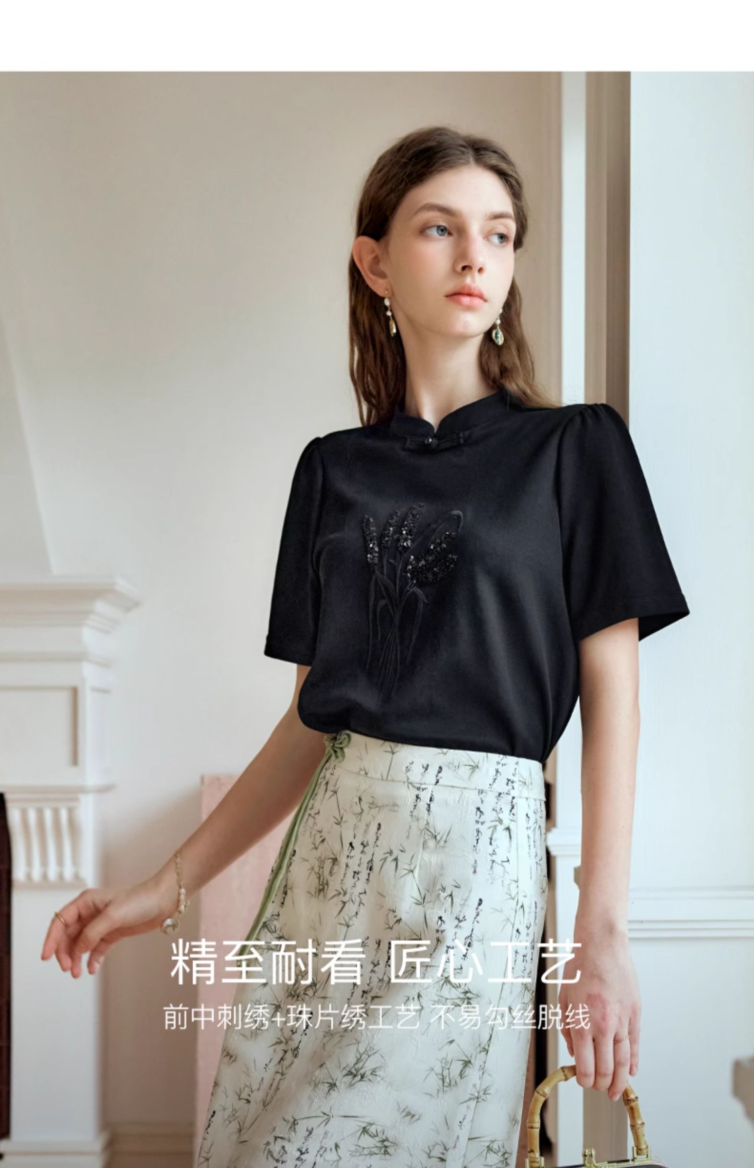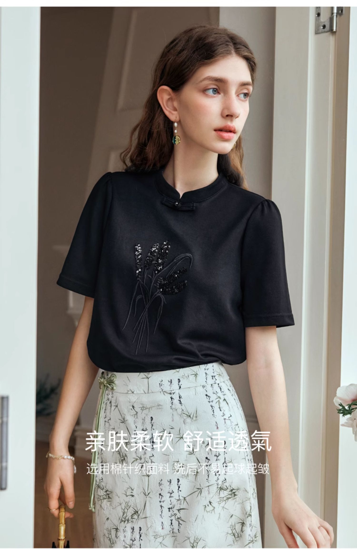 OLrain欧芮儿新中式黑色短袖T恤女夏季2024新款时尚立领刺绣上衣