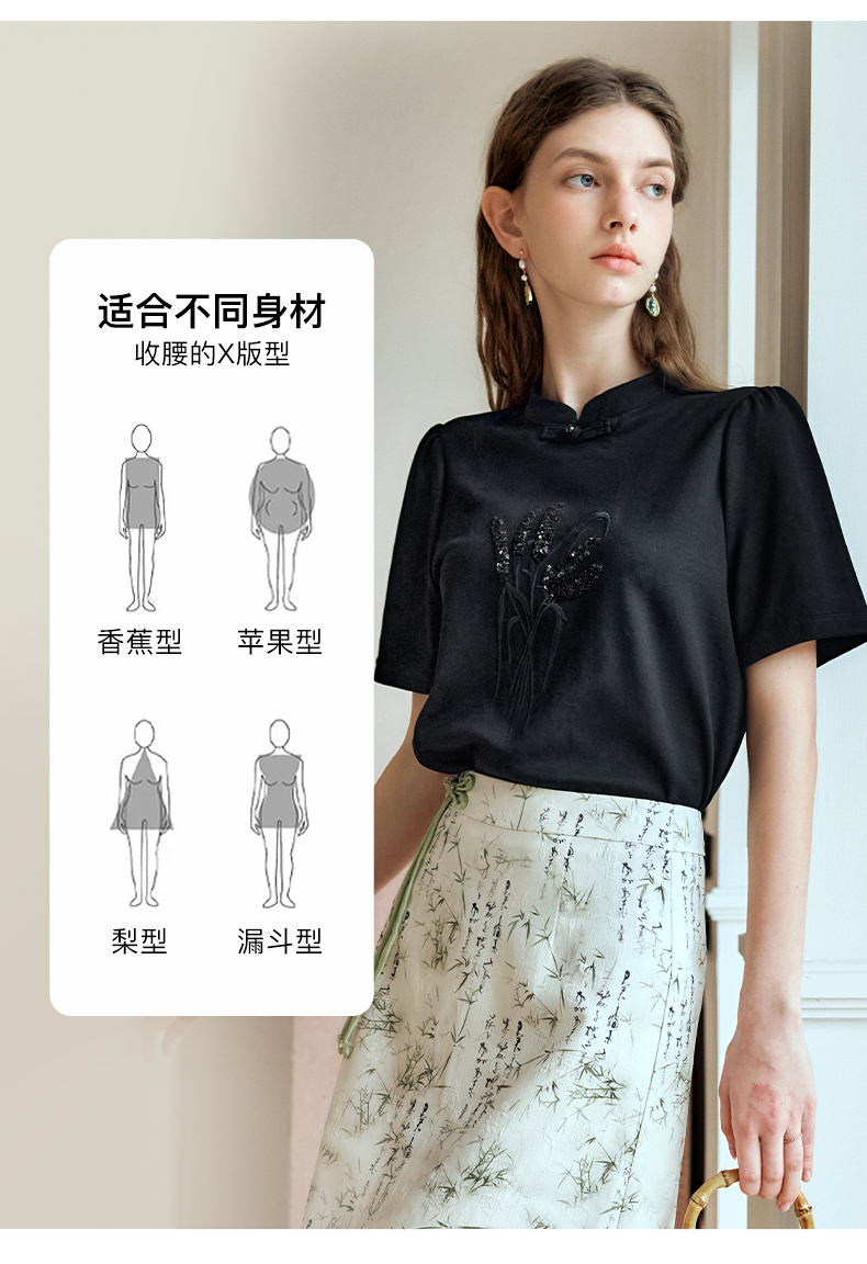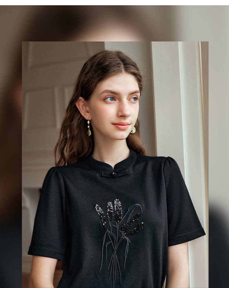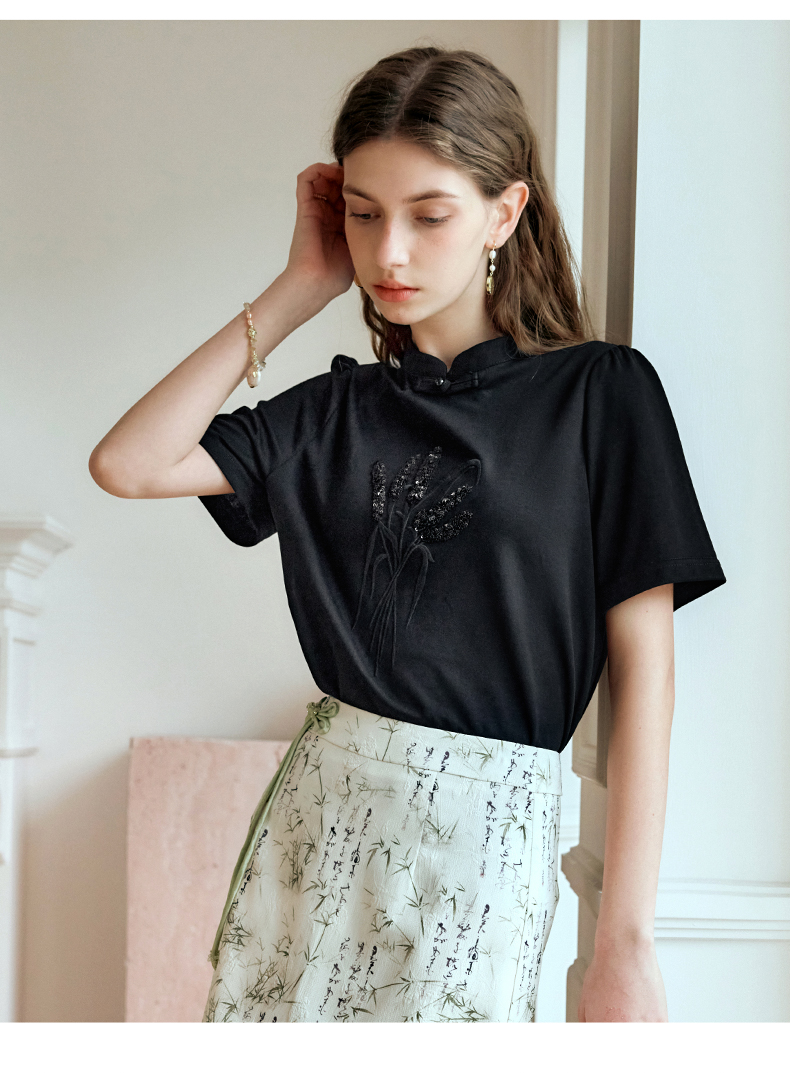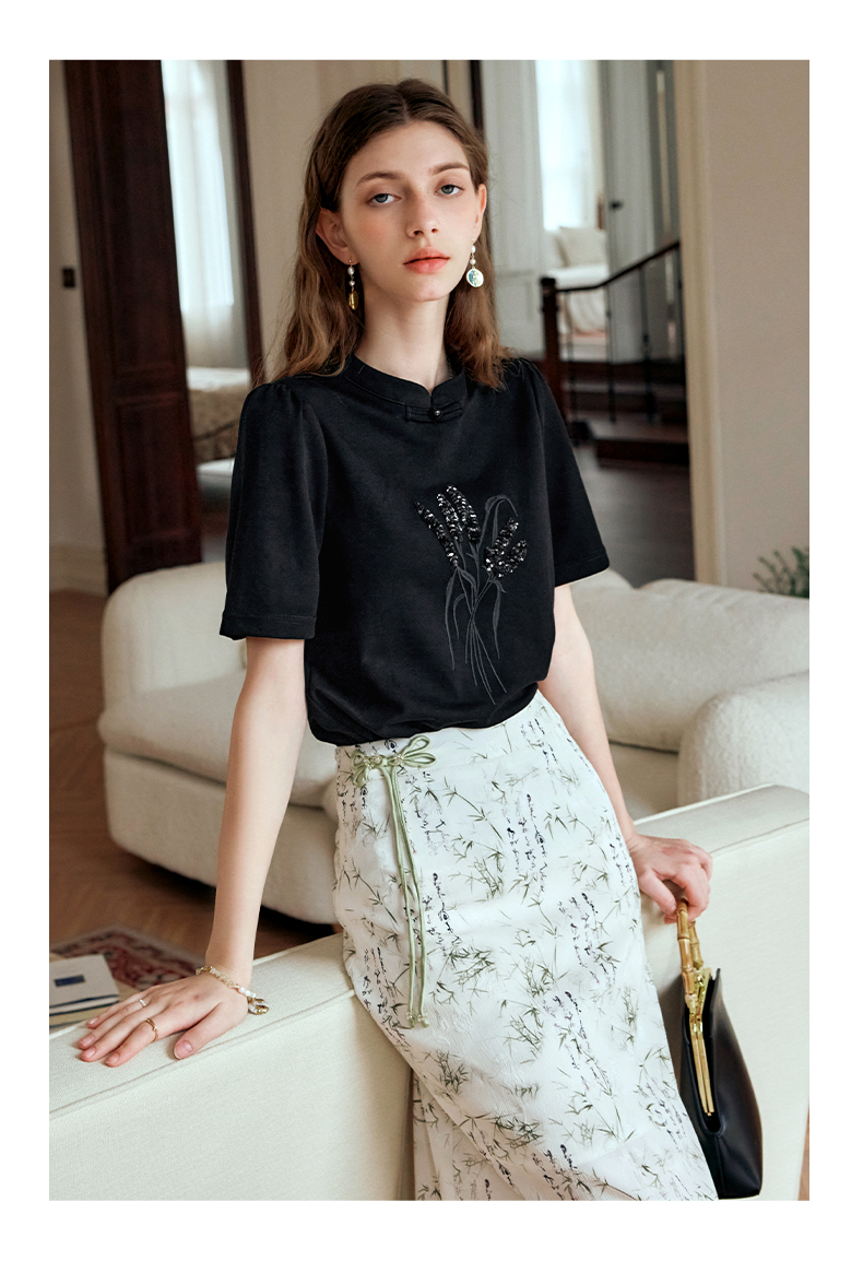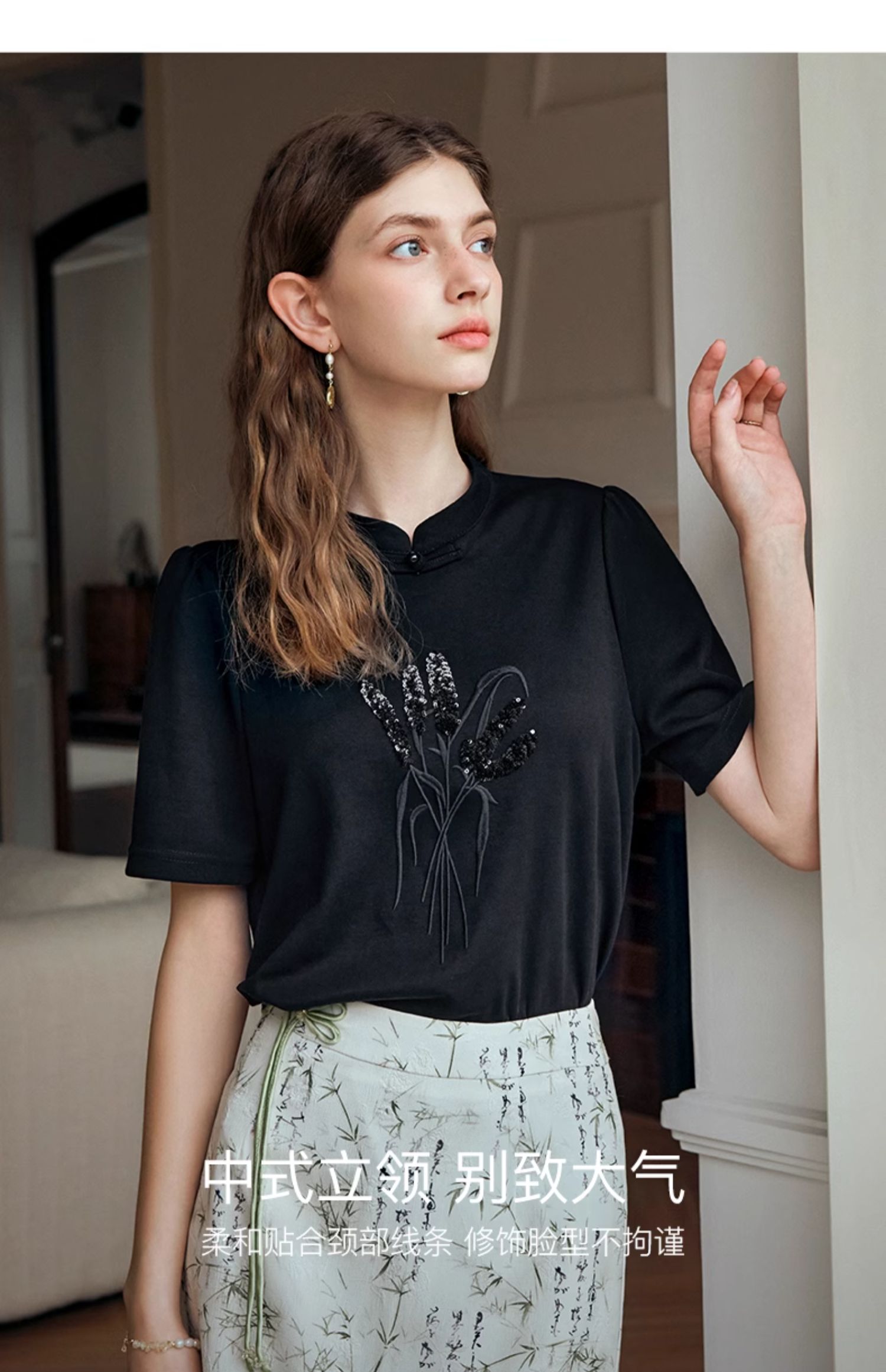 OLrain欧芮儿新中式黑色短袖T恤女夏季2024新款时尚立领刺绣上衣