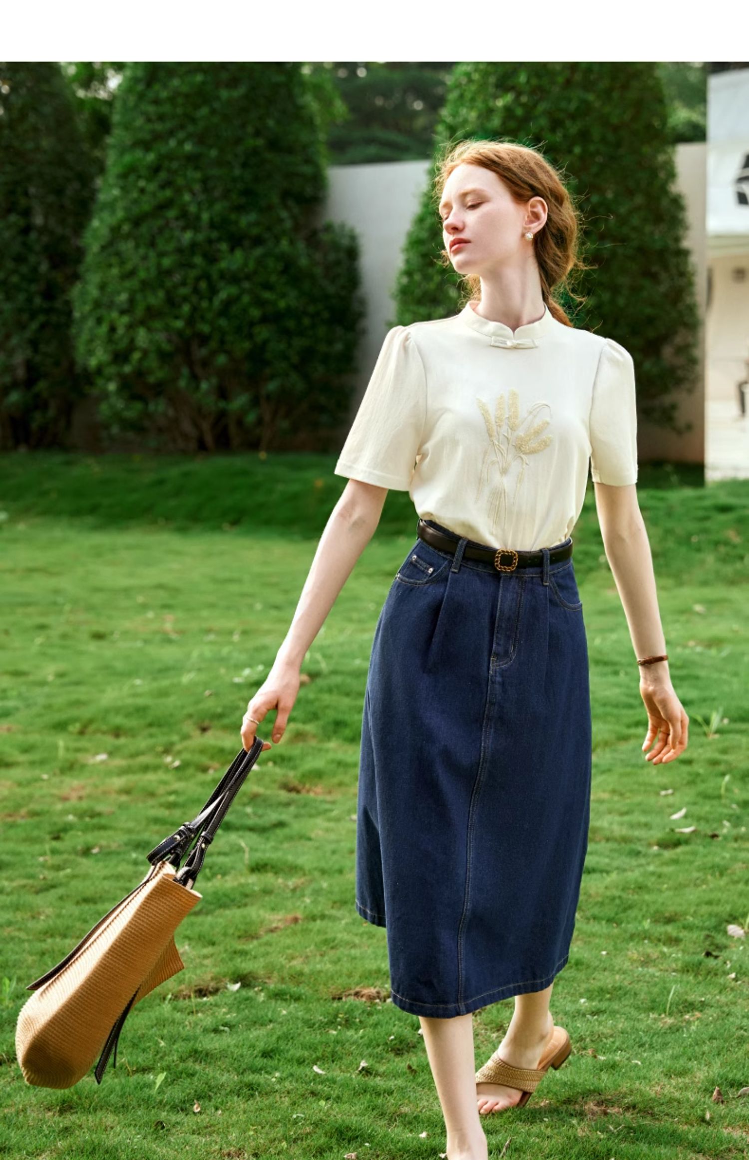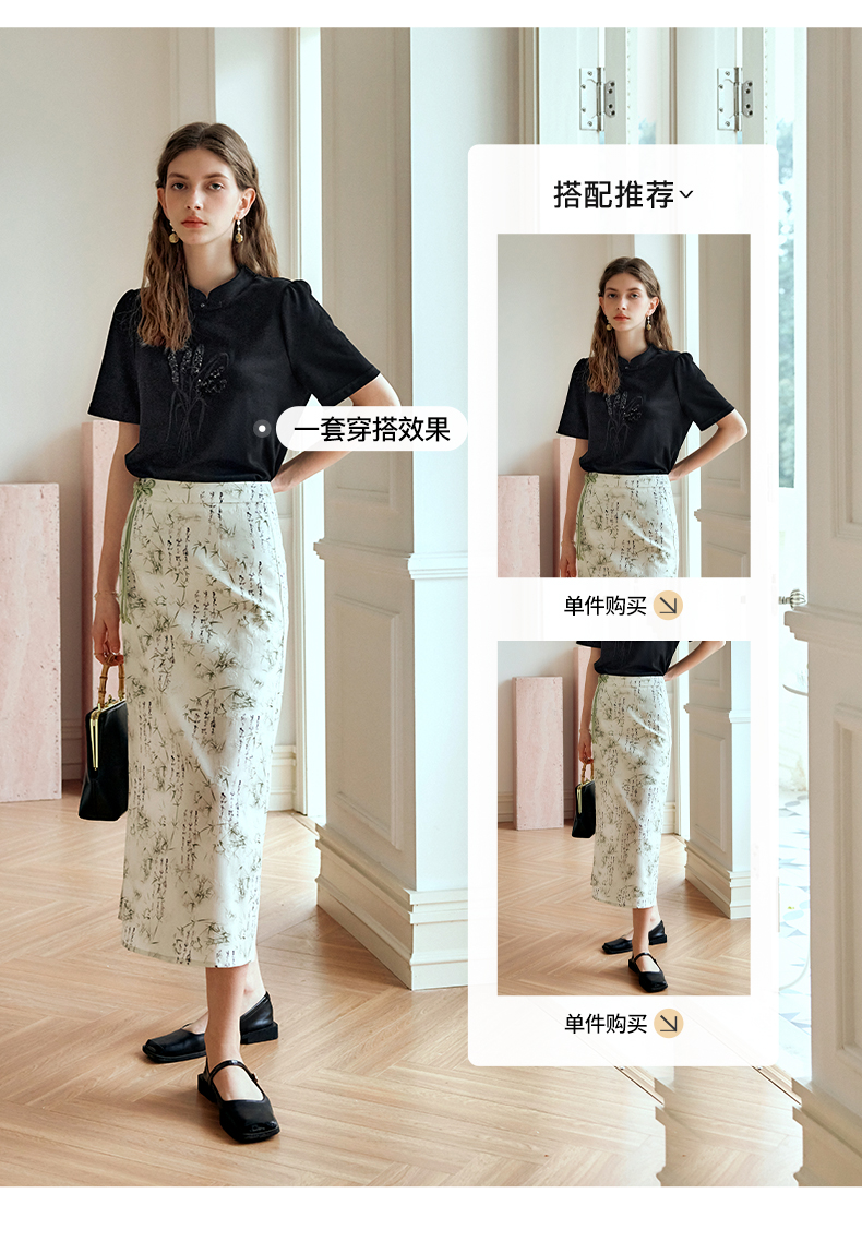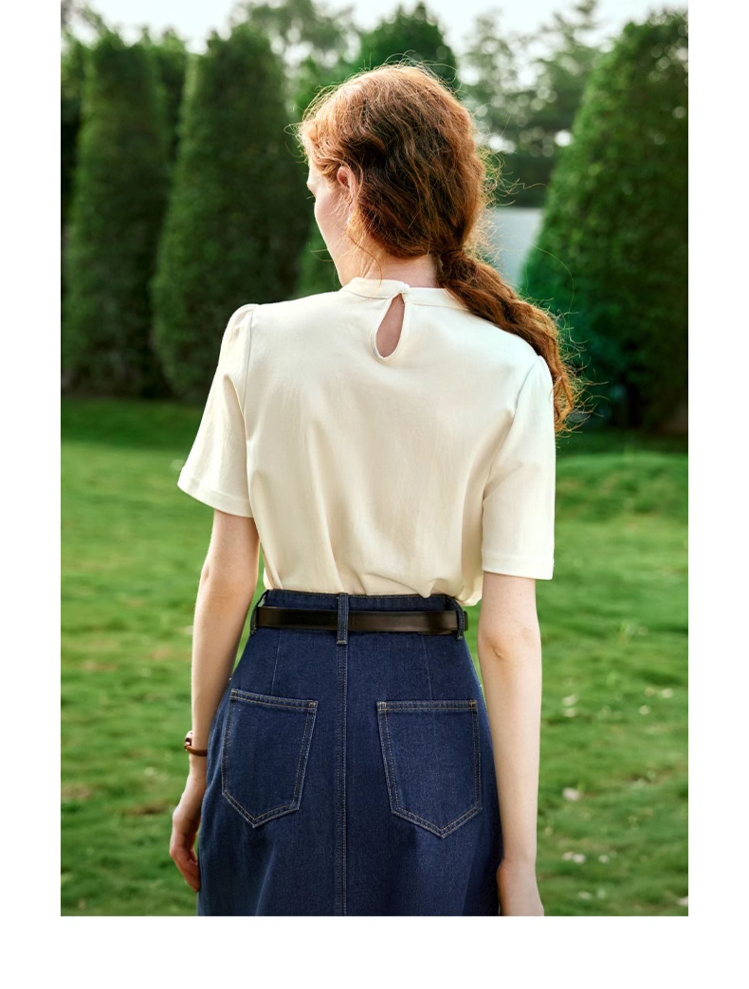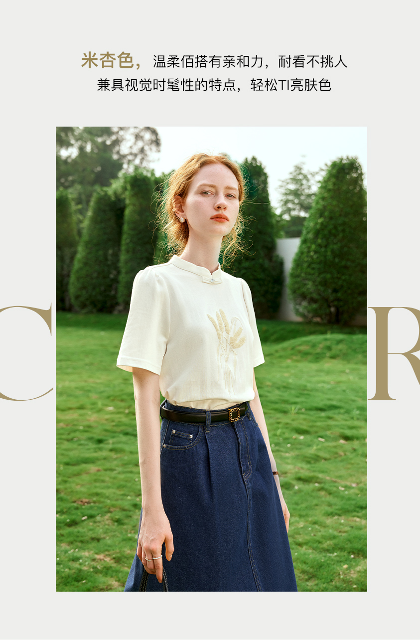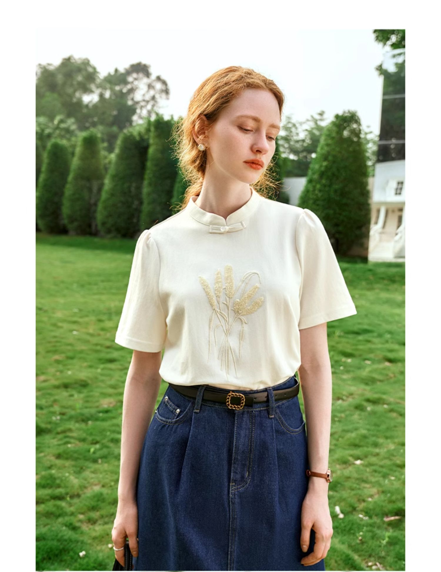 OLrain欧芮儿新中式黑色短袖T恤女夏季2024新款时尚立领刺绣上衣