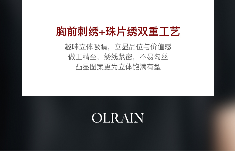 - “精致”是欧芮儿olrain品牌文化的核心,欧芮儿认为,精致的女人,不但要外在动人,更要内在迷人,内外兼修,有魅力、有气质、有内涵,自信而不自傲,优雅而不矫揉,自有万种风情而不轻浮,更不故作矜持。