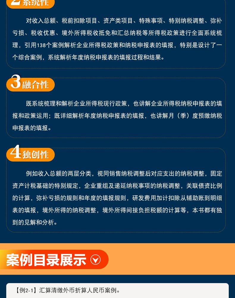 ——系统性。既对收入总额、税前扣除项目、资产类项目、特殊事项、特别纳税调整、弥补亏损、税收优惠、境外所得税收抵免和汇总纳税等所得税政策进行*系统梳理,也通过138个案例(详见附录)解析了企业所得税政策和纳税申报表的填报,特别是设计了一个综合案例,系统解析年度纳税申报表的填报过程和结果。