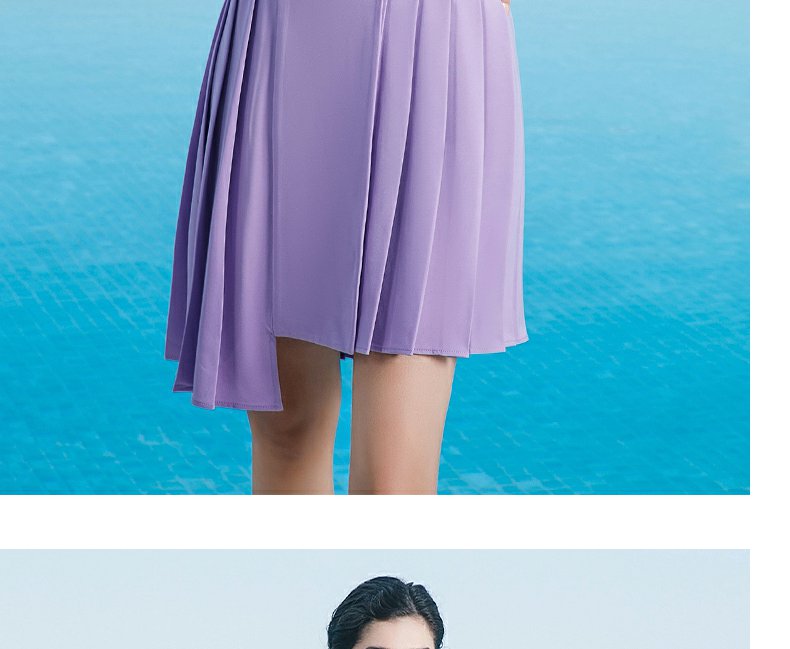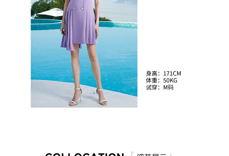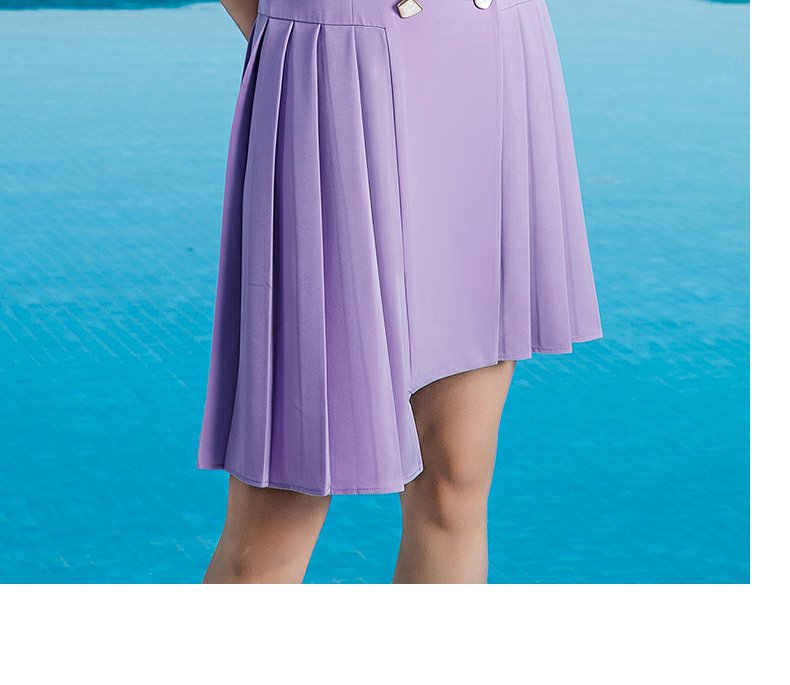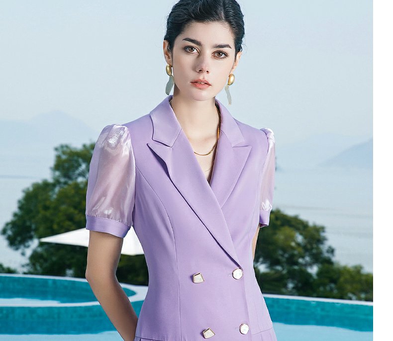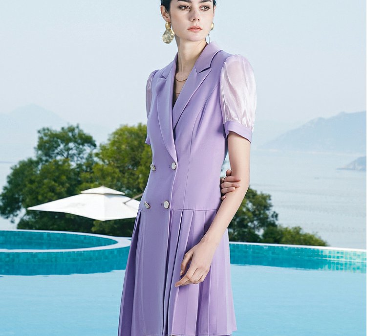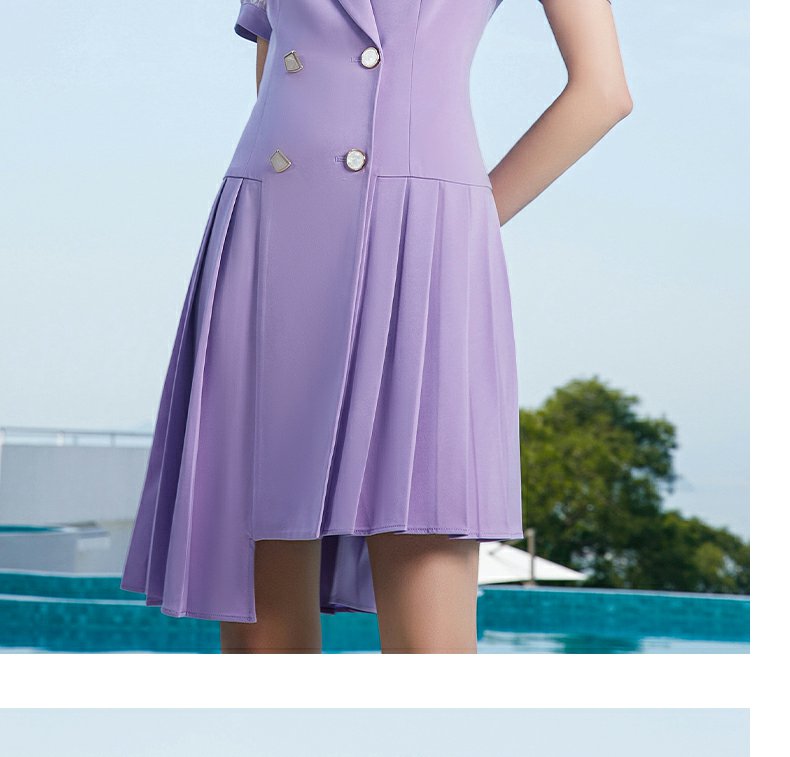 IWY/短袖紫色连衣裙女百褶裙双排扣新款设计感职业ol气质裙子时尚222092Q1