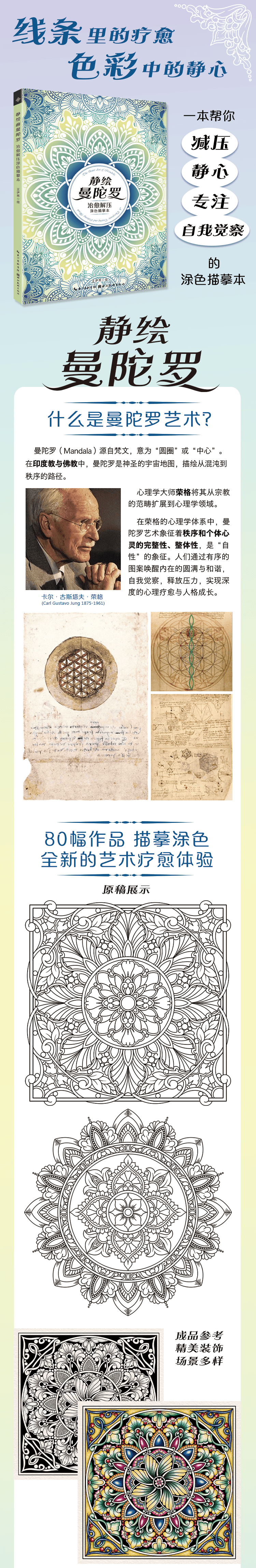 曼陀罗绘画作为被广泛应用于心理治疗领域的一种表达性艺术治疗的形式,可以帮助读者在绘制的过程中探索内心、平静情绪、提升心理凝聚力。本书是一本曼陀罗线稿描摹练习册,希望读者在轻松的氛围中进行创作,找回心神的安宁。书中设置了控线练习、基础元素练习,创意图样练习与结构解析等部分,由简入繁,将曼陀罗纹样的美和构图逻辑展示得淋漓尽致,让读者在轻松愉悦的氛围中进行创作,疗愈身心。本书还配有数字资源,包含书中原稿、教学引导、辅助线参考等内容。●装帧:锁线胶装,可以180°平摊;覆亚膜,更显质感。●纸张:封面白卡,内文140g本白双胶,质感好厚实,描涂都不透色。