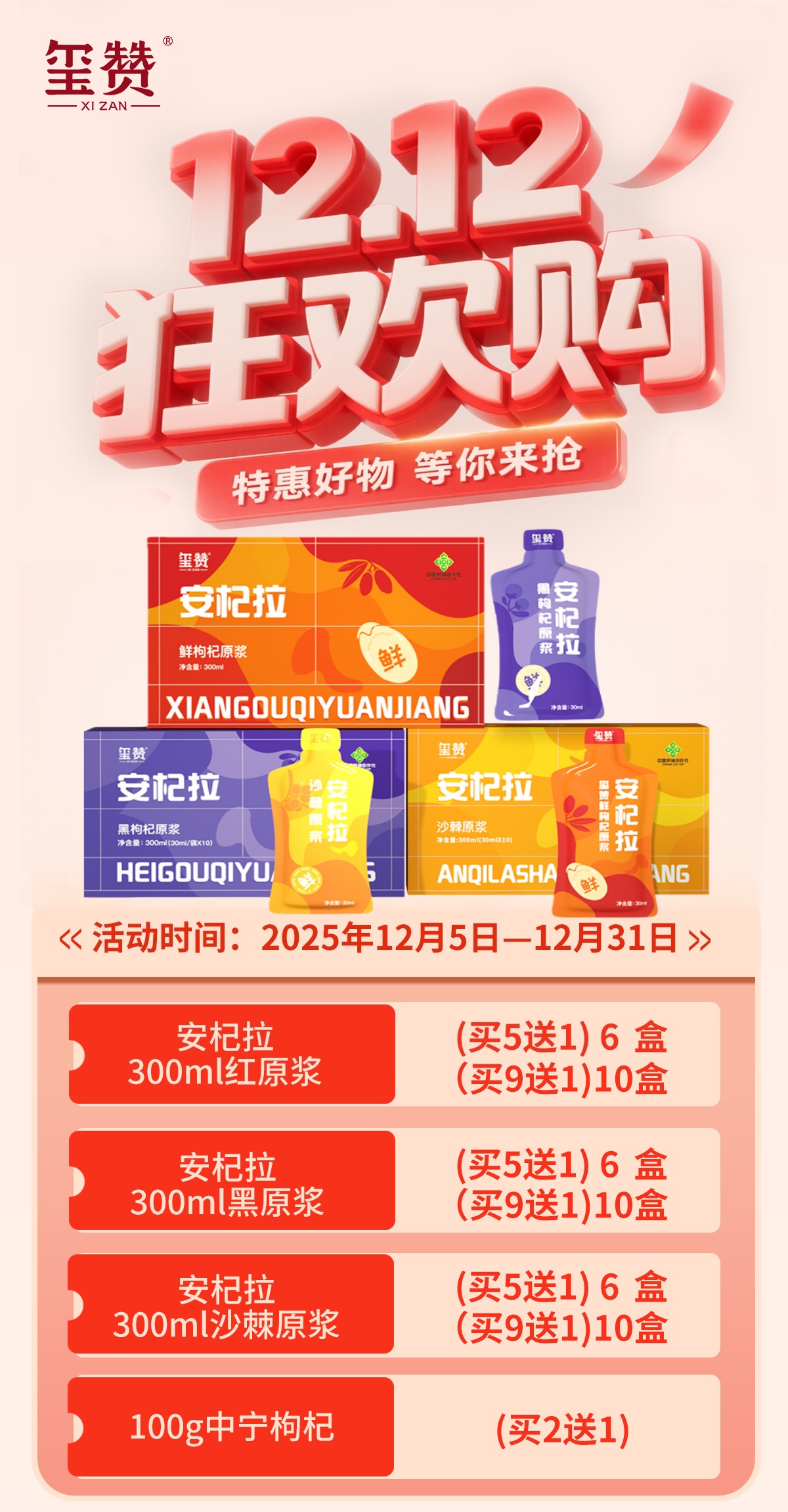 至12月31日【玺赞安杞拉双12促销活动】300ml红枸杞原浆、 黑枸杞原浆 、沙棘原浆 买赠活动