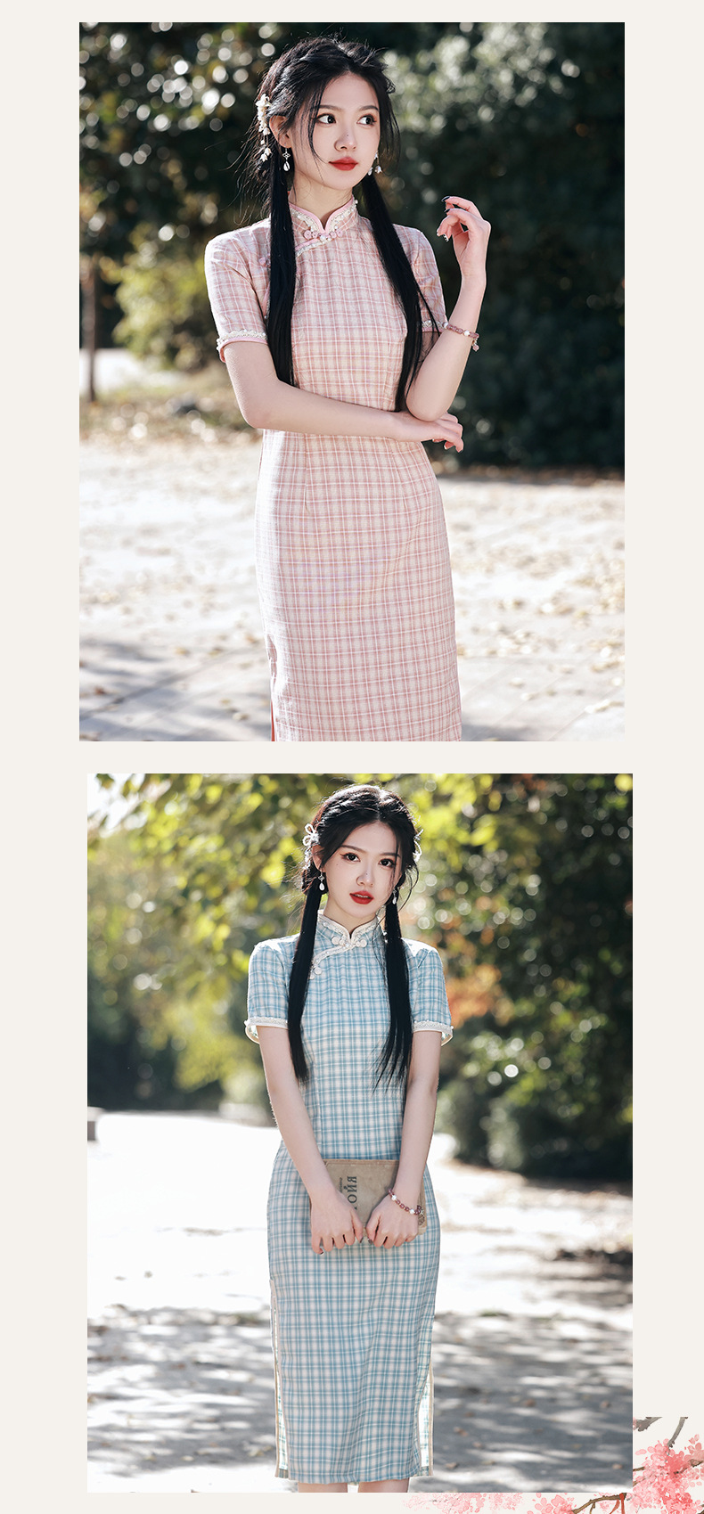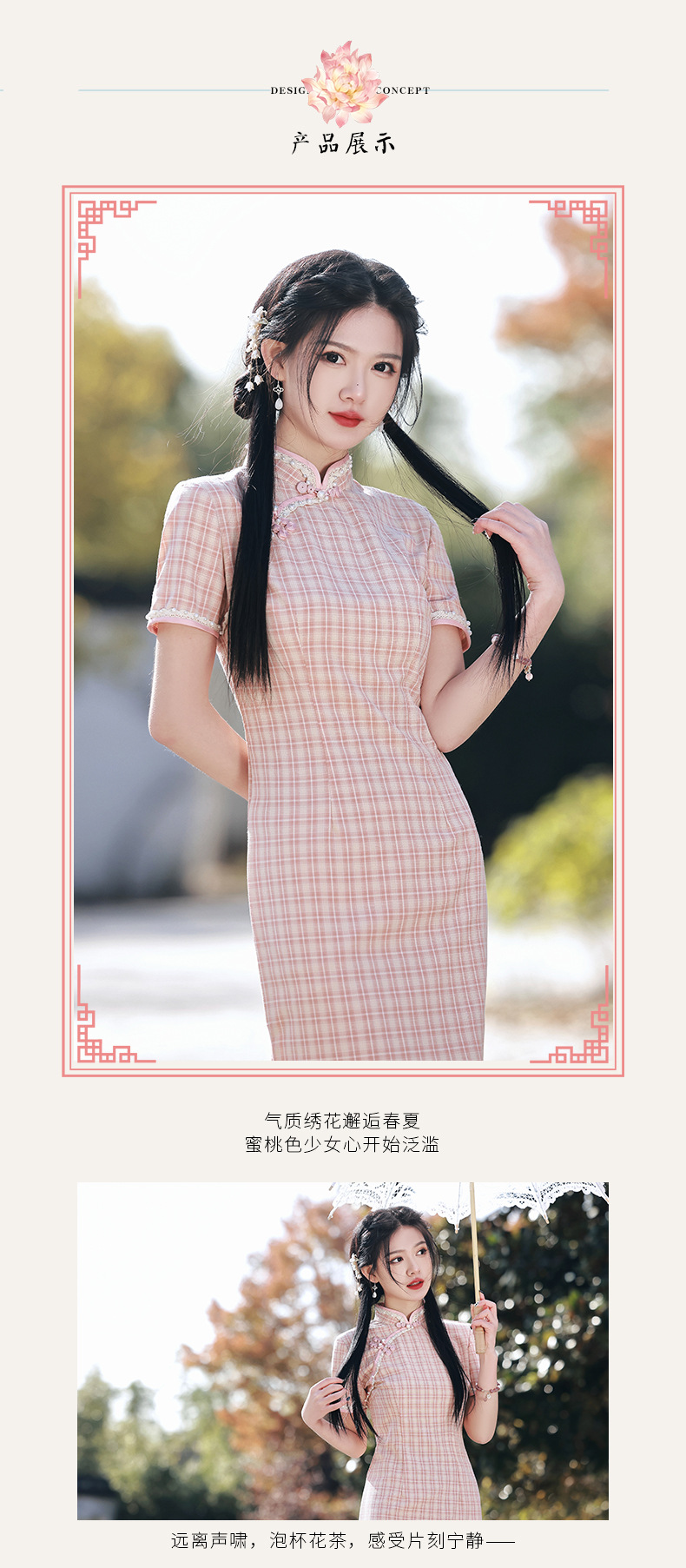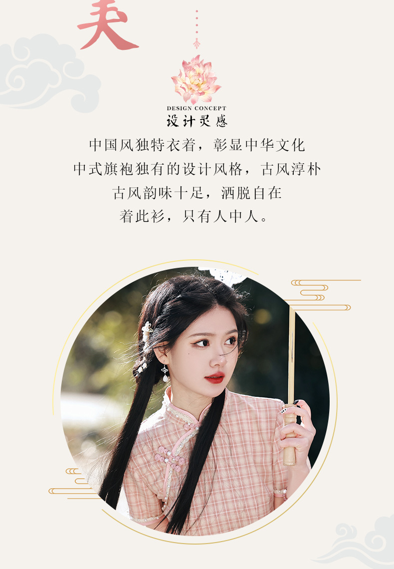 花边钉珠棉麻格子旗袍,文艺少女年轻款旗袍SJT-348
