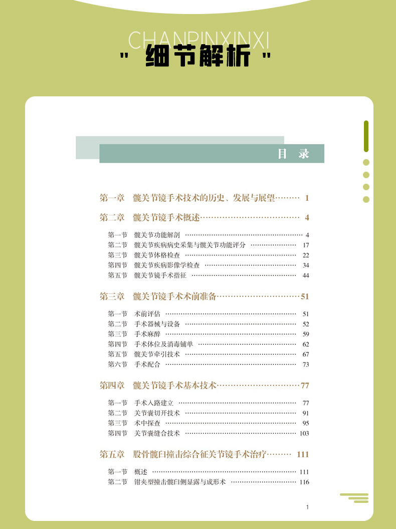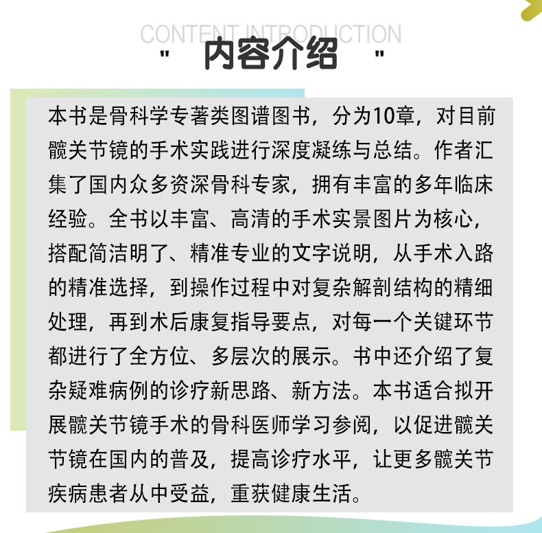 本书是骨科学专著类图谱图书,分为10章,对目前髋关节镜的手术实践进行深度凝练与总结。作者汇集了国内众多资深骨科专家,拥有丰富的多年临床经验。全书以丰富、高清的手术实景图片为核心,搭配简洁明了、精准专业的文字说明,从手术入路的精准选择,到操作过程中对复杂解剖结构的精细处理,再到术后康复指导要点,对每一个关键环节都进行了全方位、多层次的展示。书中还介绍了复杂疑难病例的诊疗新思路、新方法。本书适合拟开展髋关节镜手术的骨科医师学习参阅,以促进髋关节镜在国内的普及,提高诊疗水平,让更多髋关节疾病患者从中受益,重获健康生活。