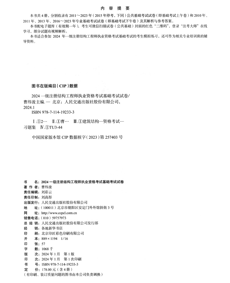 书名:2024一级注册结构工程师执业资格考试基础考试复习教程+题集+试卷