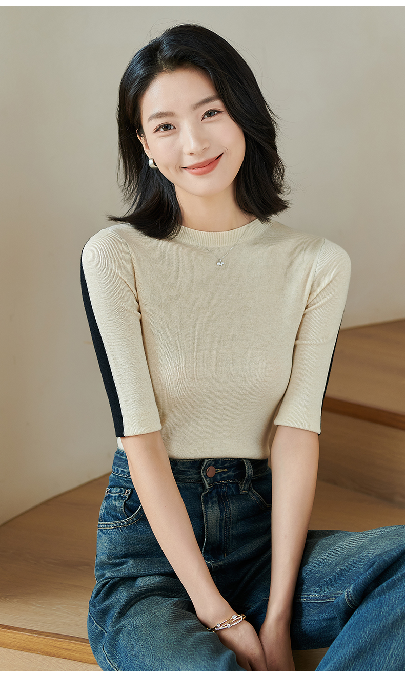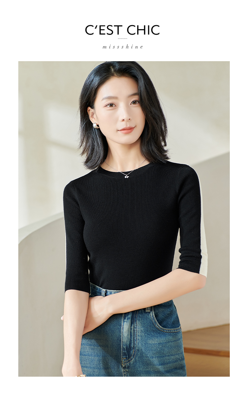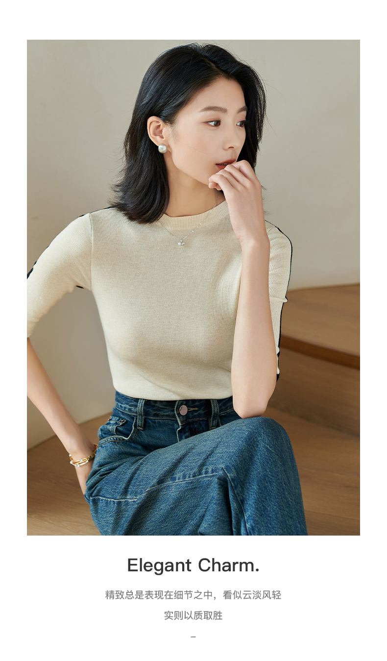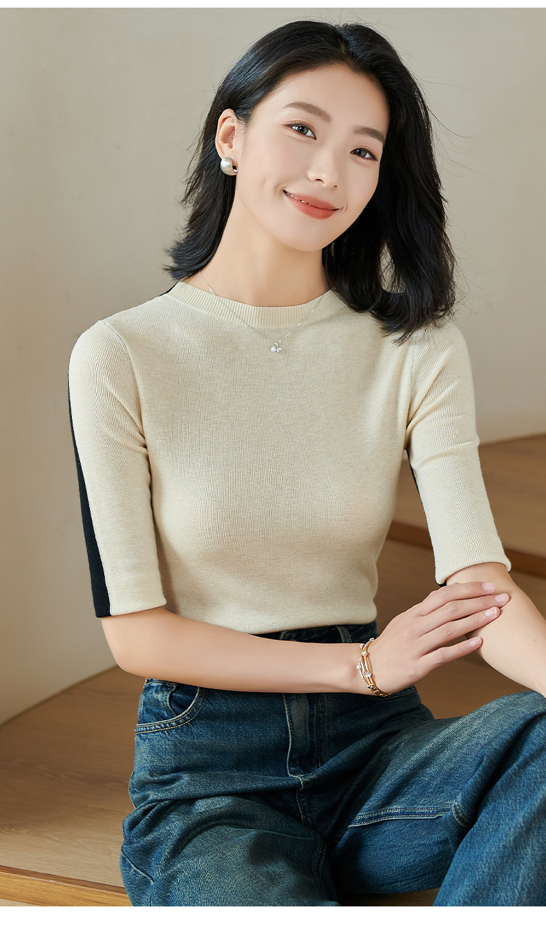 米思阳2026春季新款简约设计感撞色针织衫圆领五分袖修身上衣0353