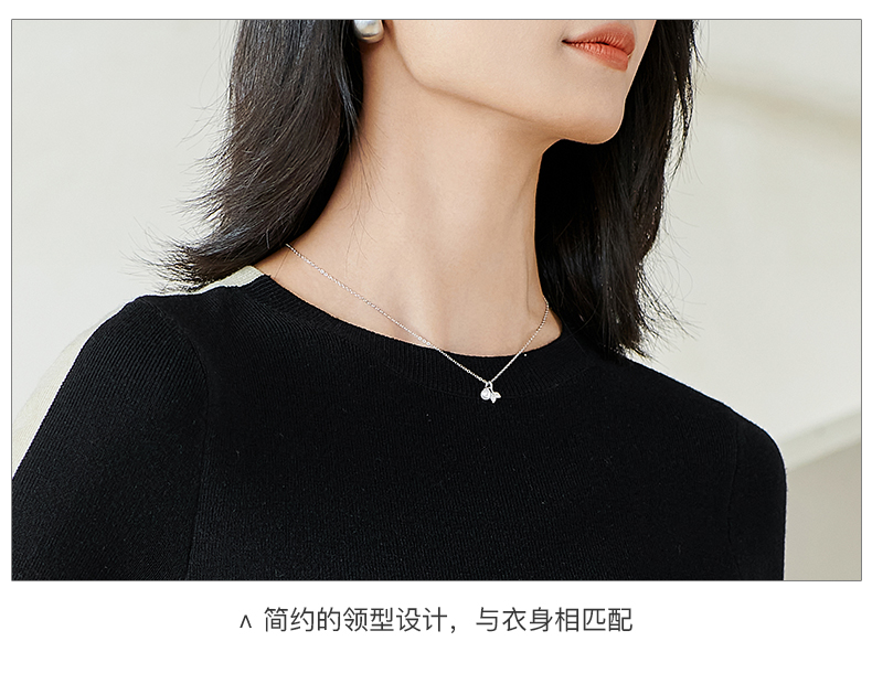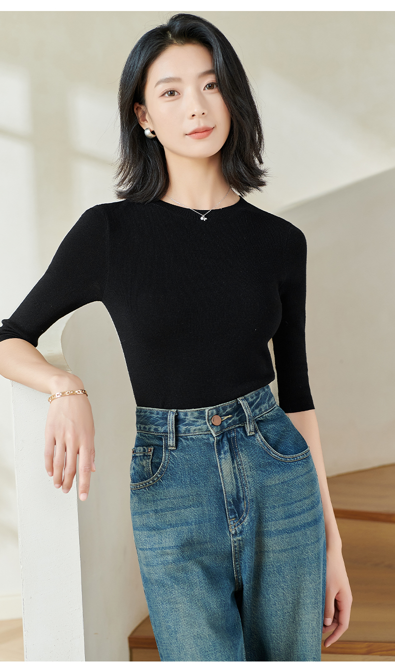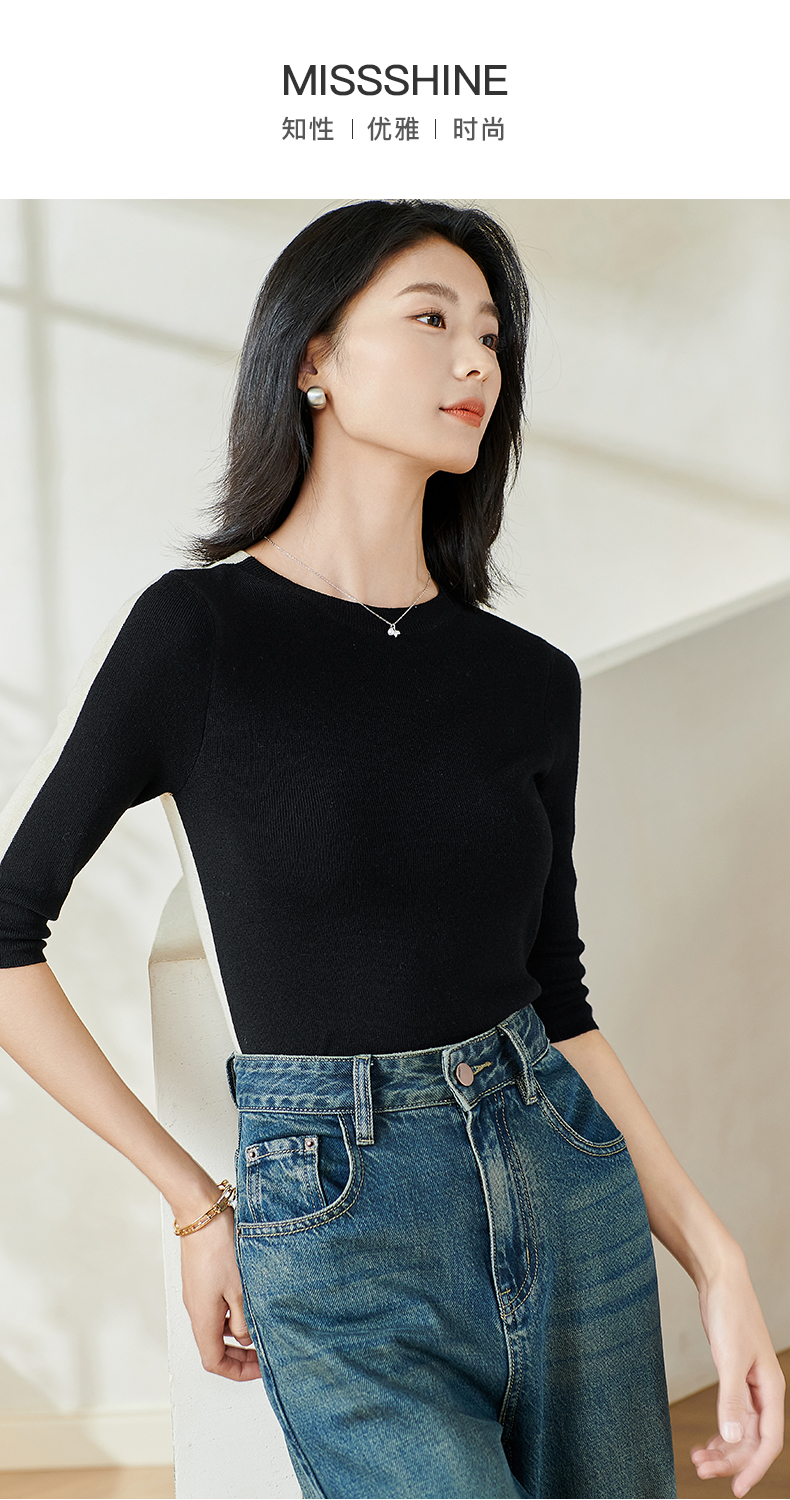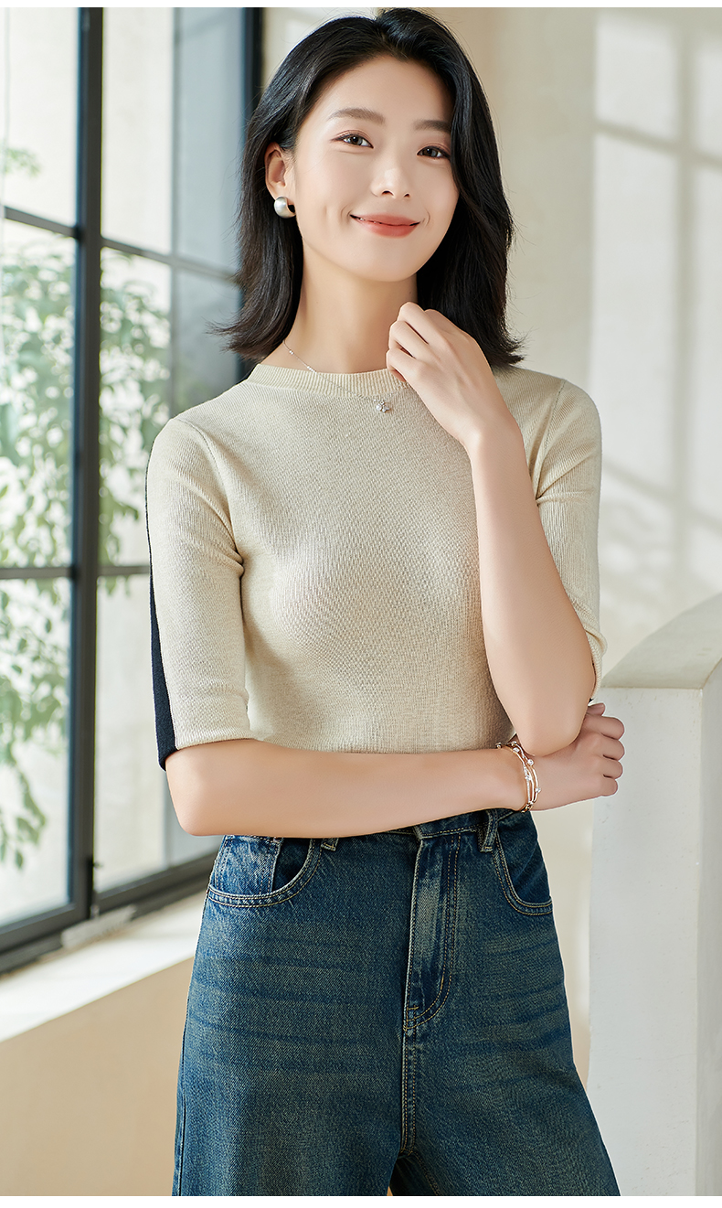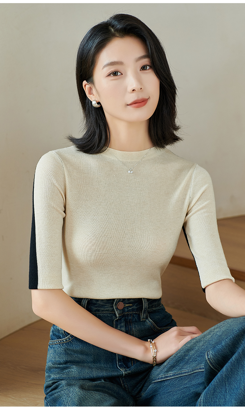 米思阳2026春季新款简约设计感撞色针织衫圆领五分袖修身上衣0353