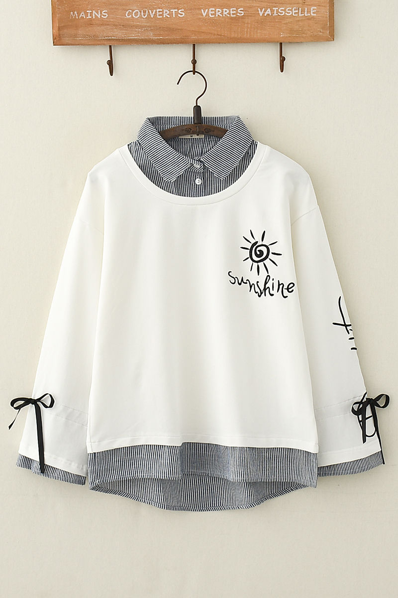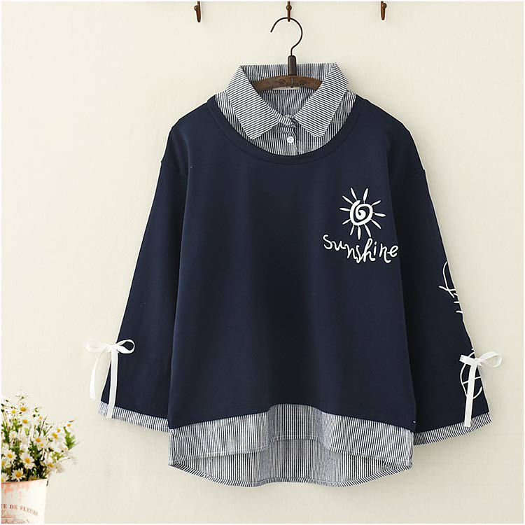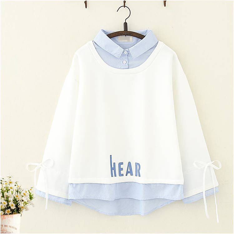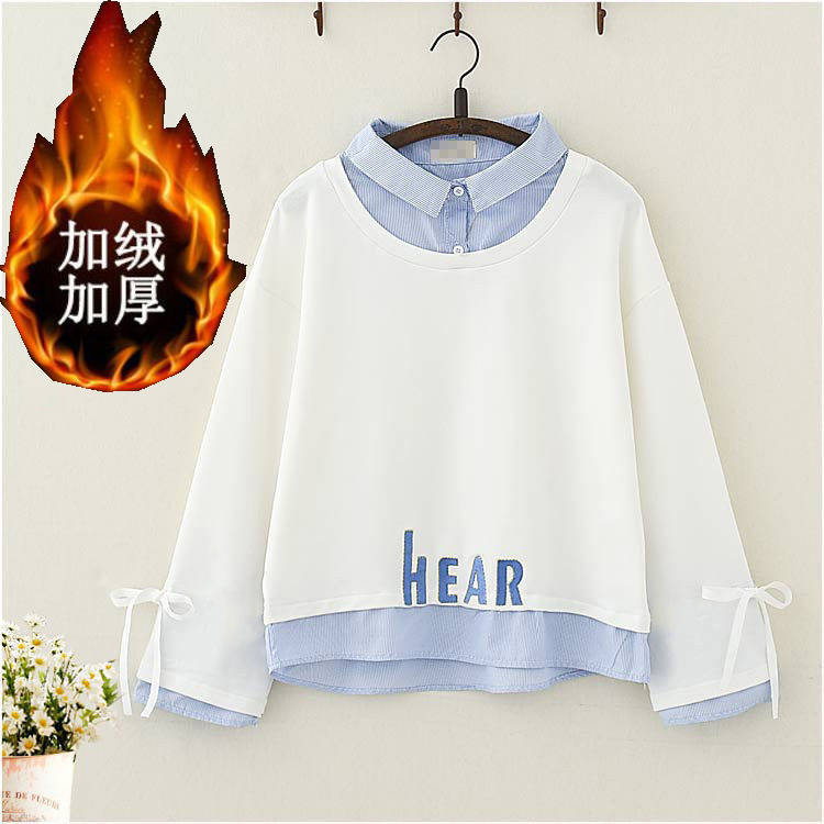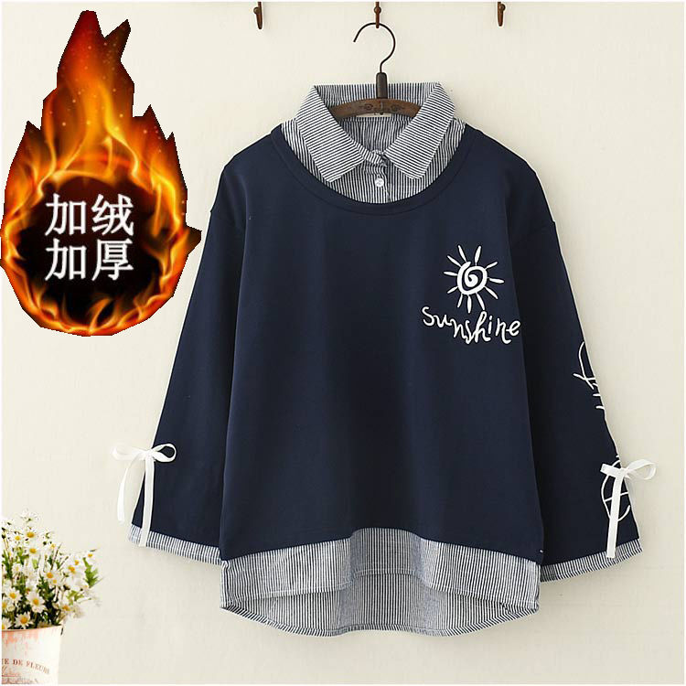 承包你整个秋冬的时髦~ 棉日系森女 加绒刺绣 假两件卫衣学生少女甜美系带长袖T恤上衣