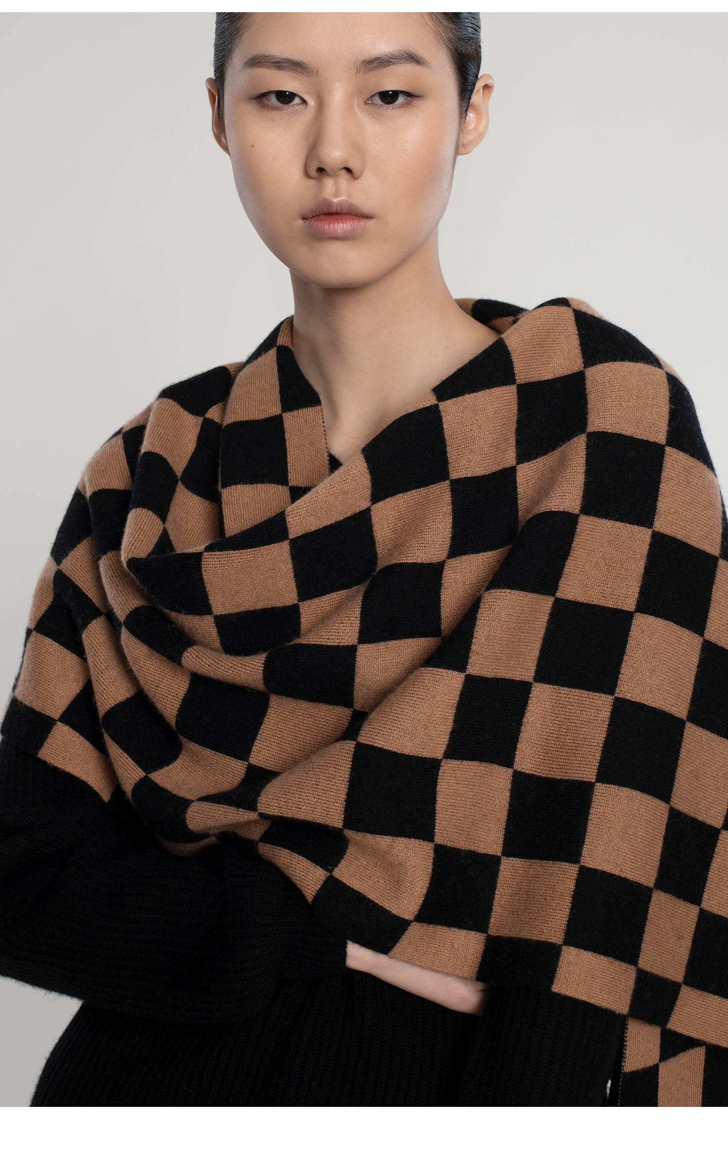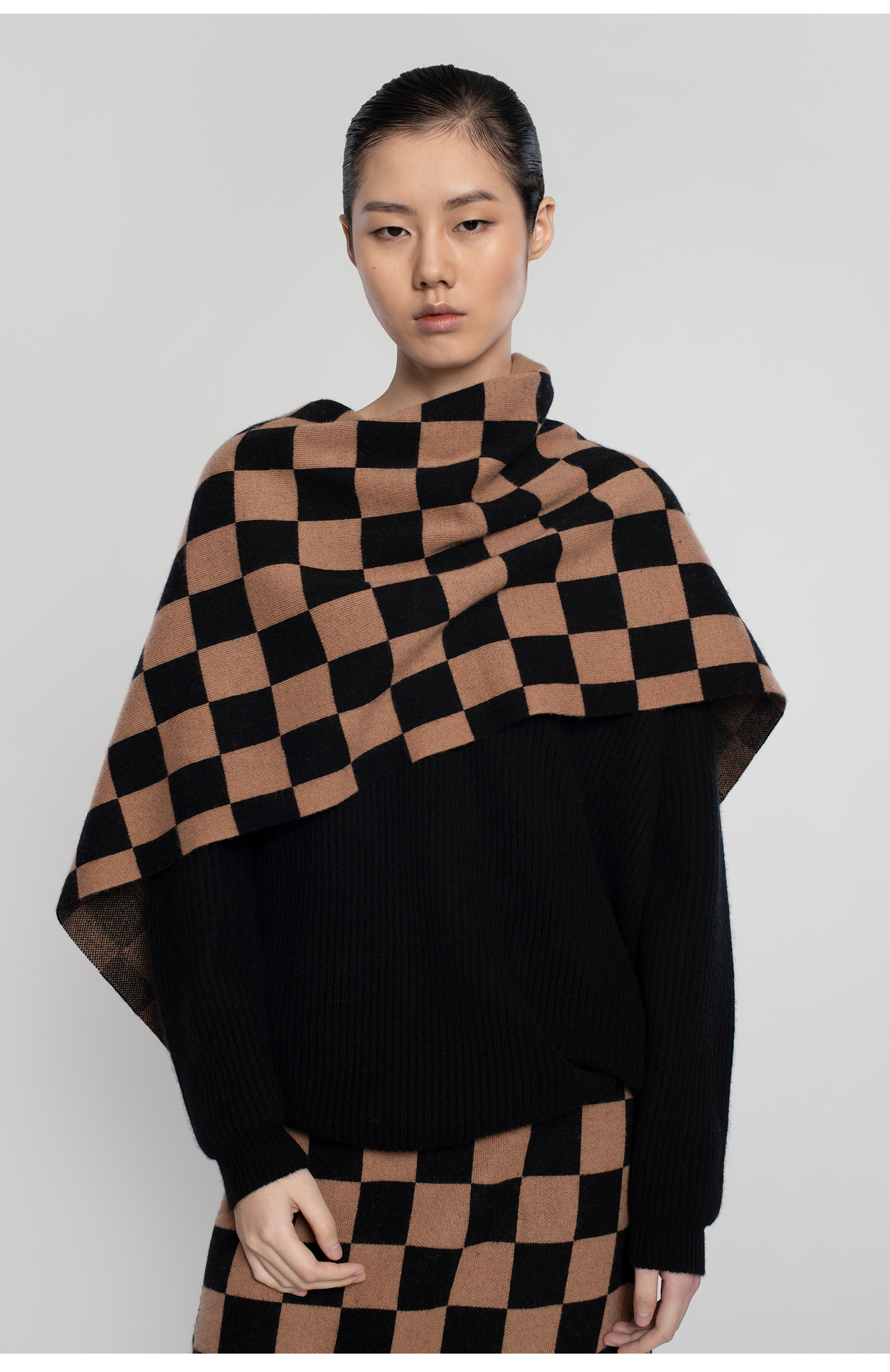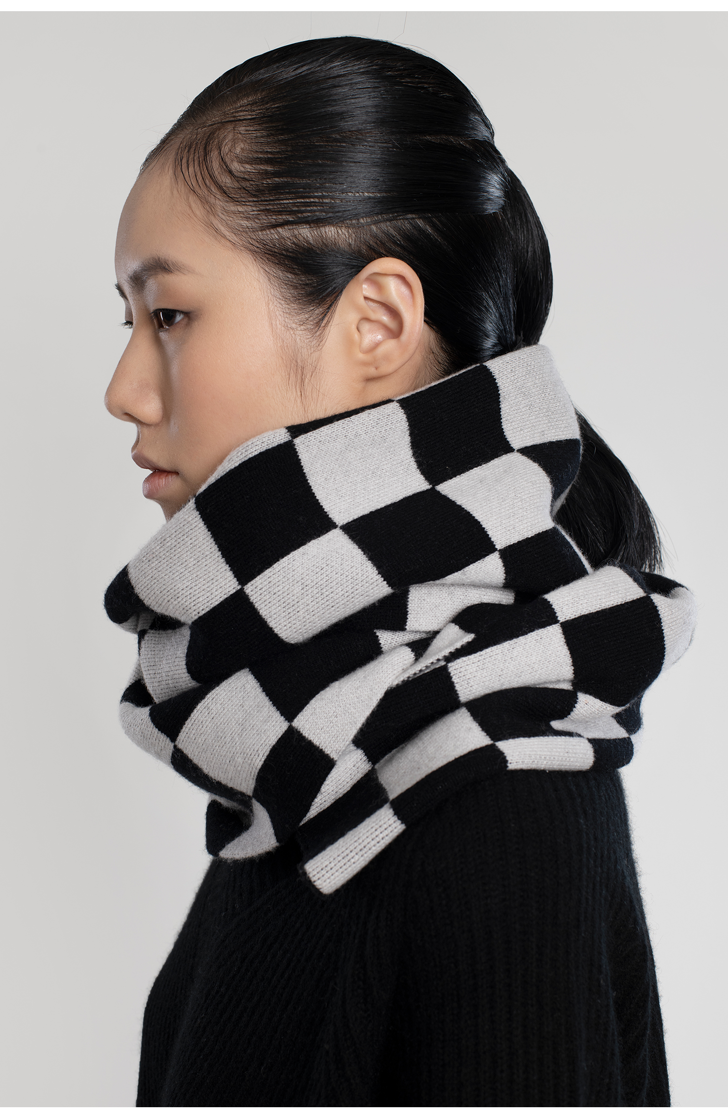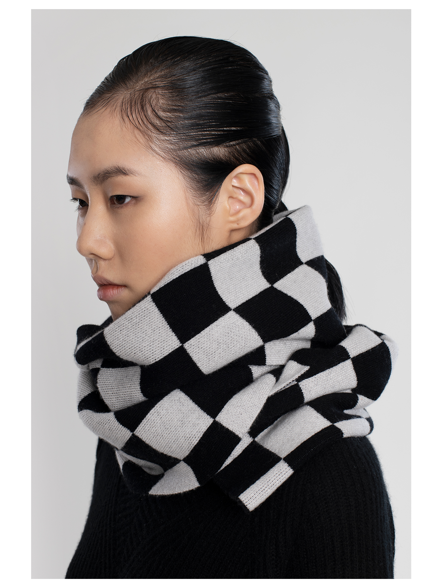 322工房羊毛混纺棋盘格针织围巾女新款冬季加厚百搭黑白格子披肩