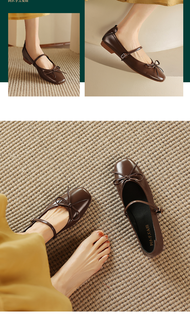 阿么手工女鞋浅口一字带蝴蝶结单鞋百搭平底1.8CM温柔方头低跟鞋