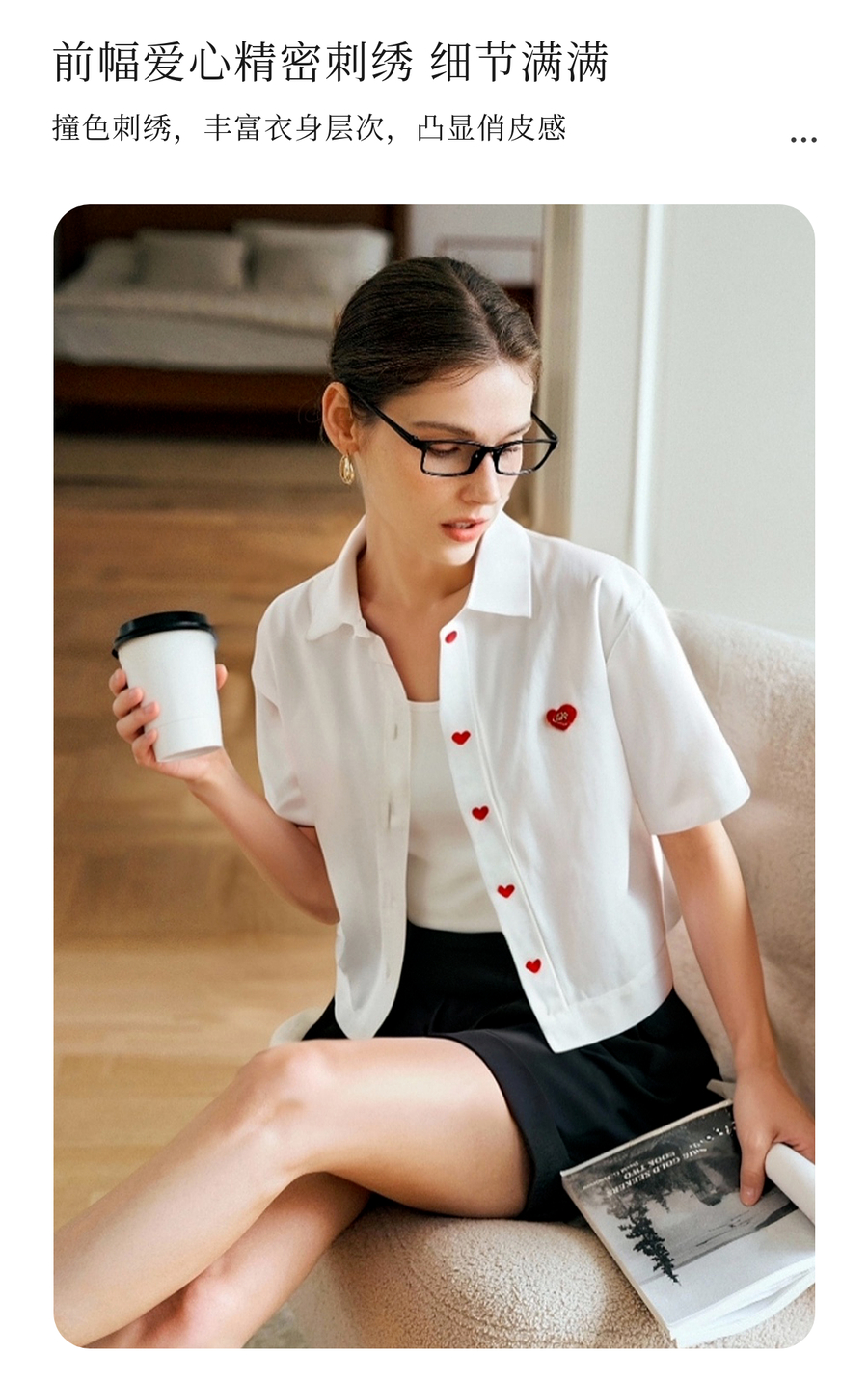 OLrain欧芮儿米白色短款爱心刺绣衬衫女夏季2025新款翻领短袖上衣