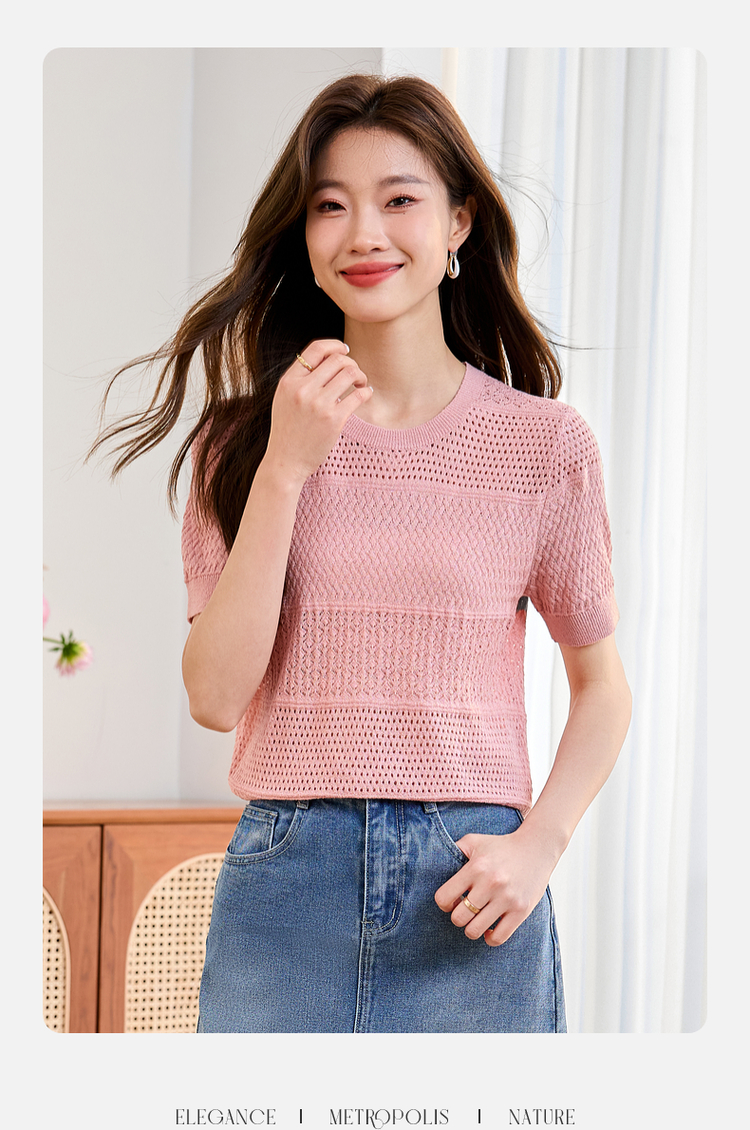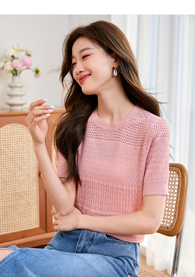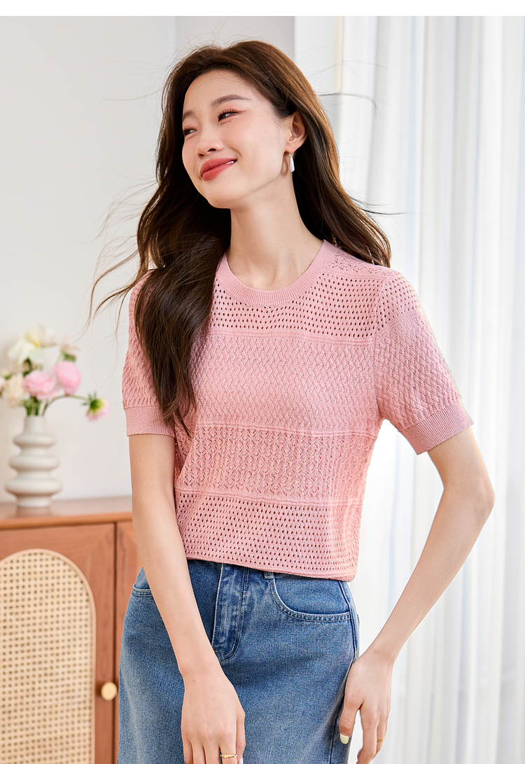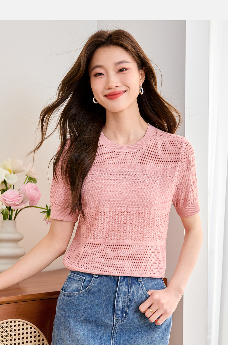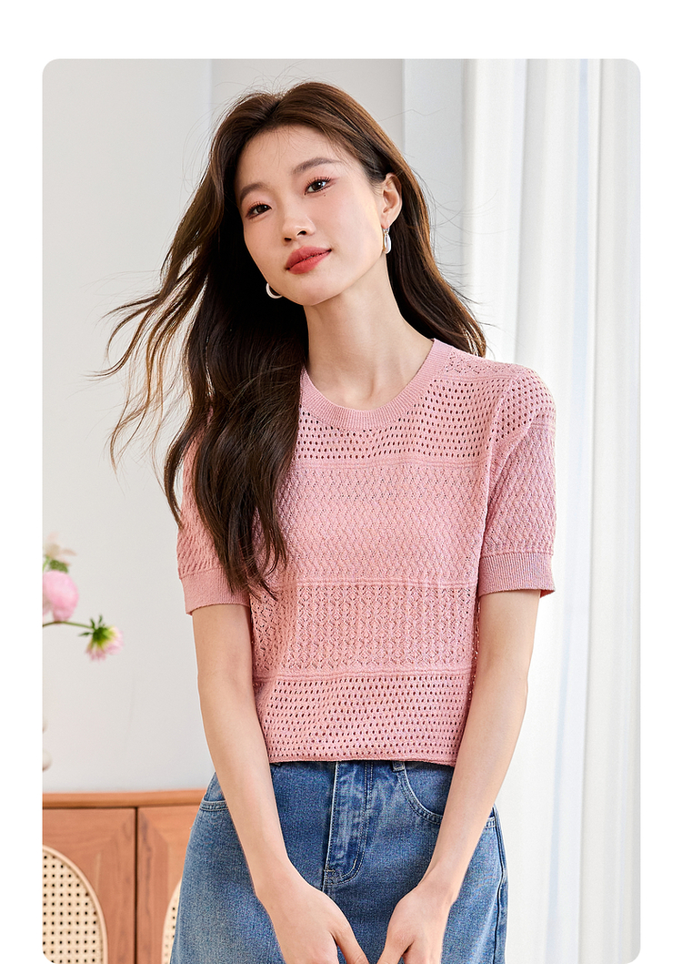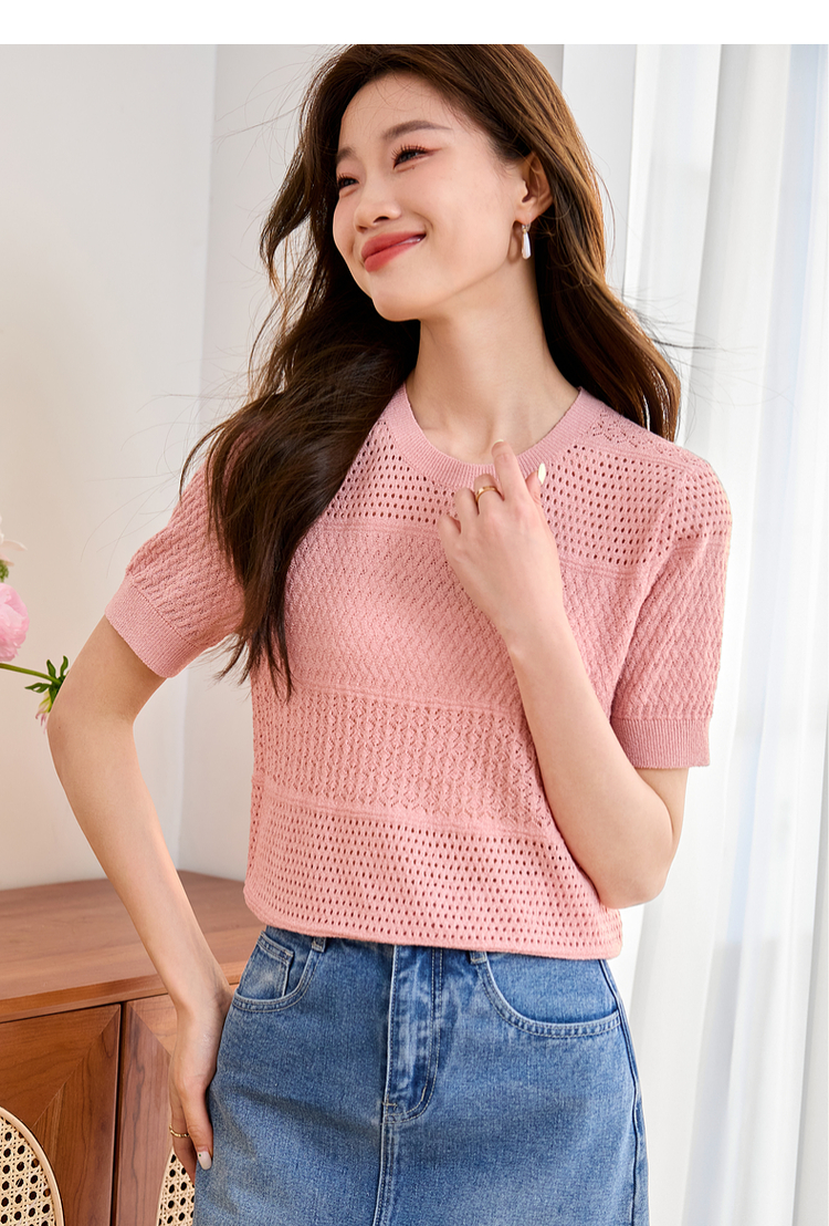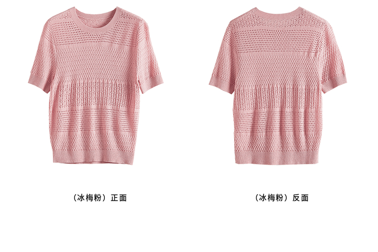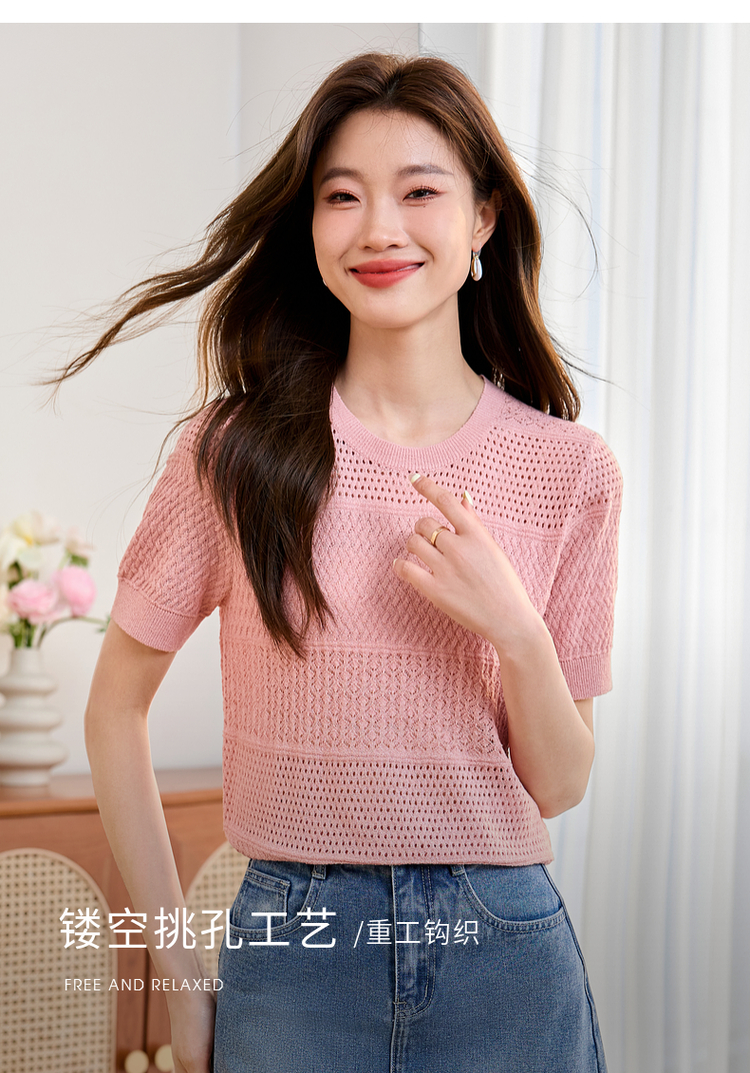 【专属特价】熙世界冰曲薄款镂空短袖针织衫夏季2025年新款宽松圆领粉色上衣