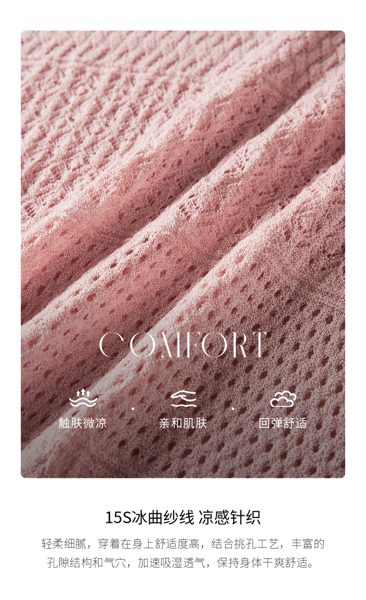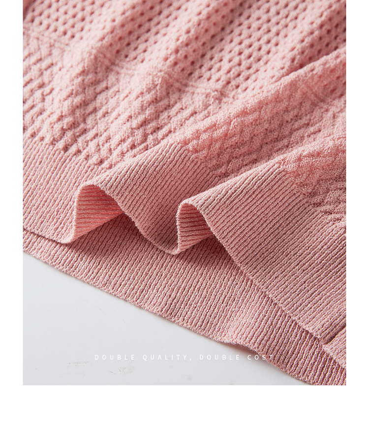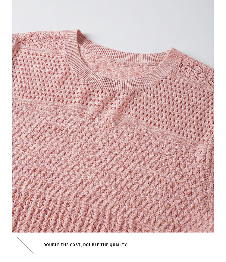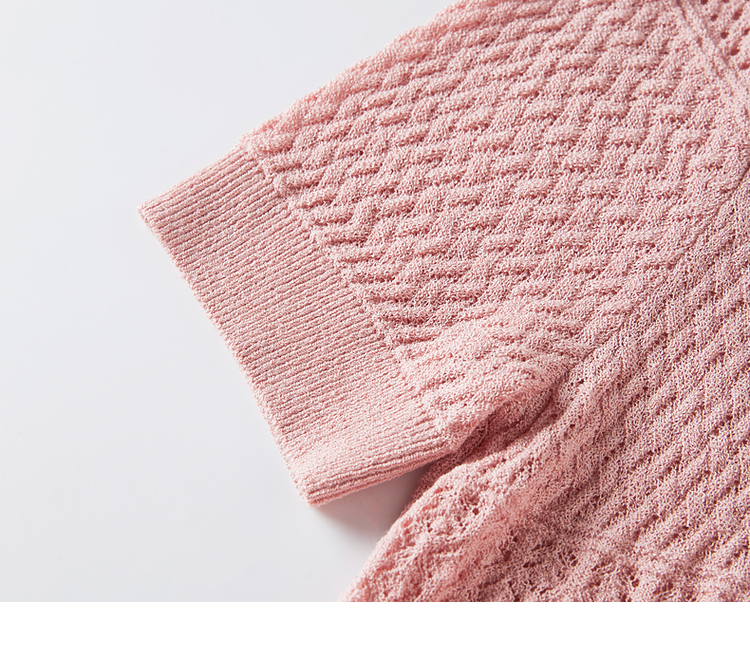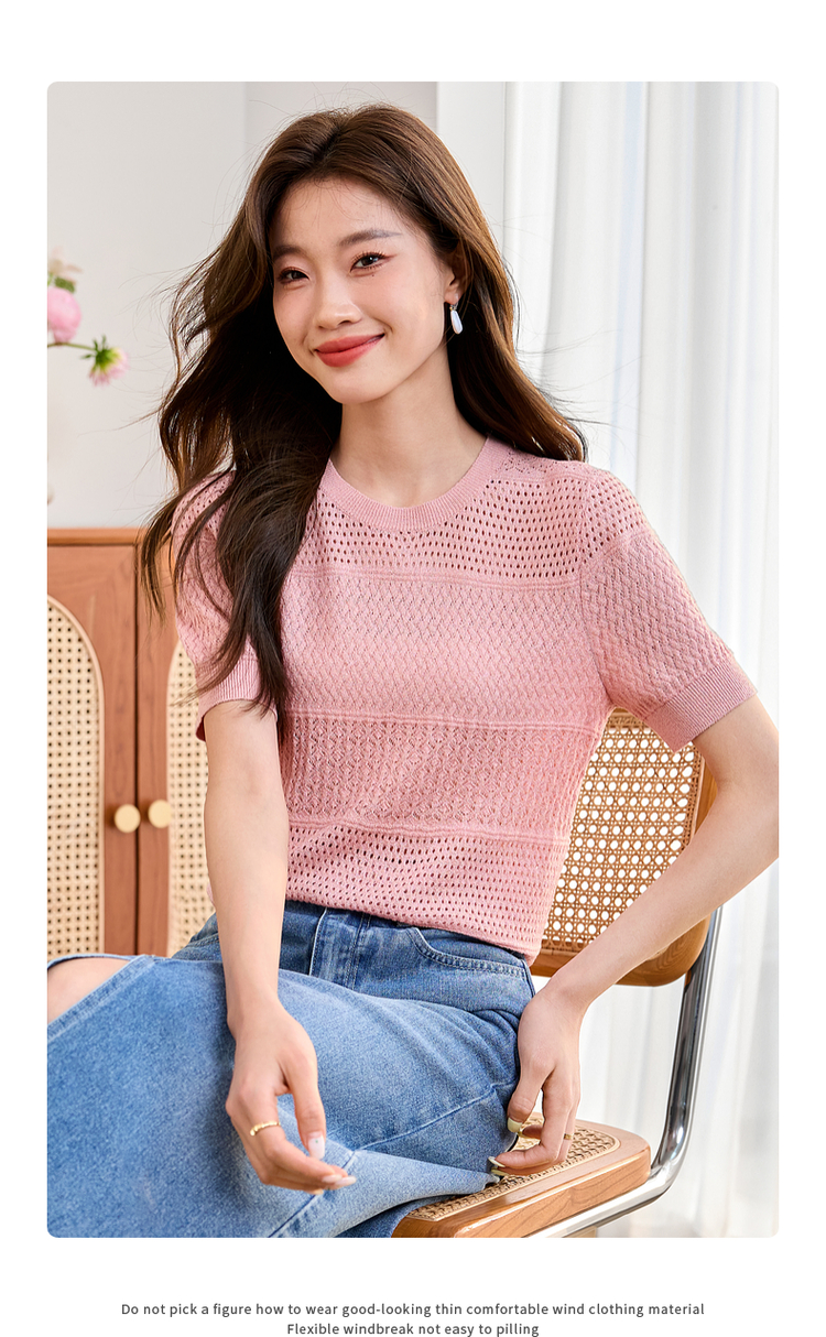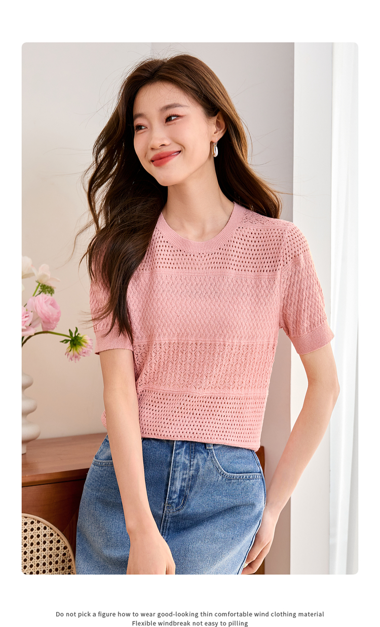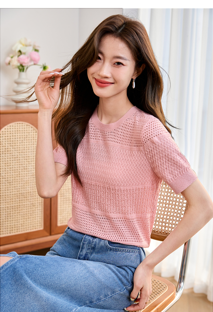 【专属特价】熙世界冰曲薄款镂空短袖针织衫夏季2025年新款宽松圆领粉色上衣