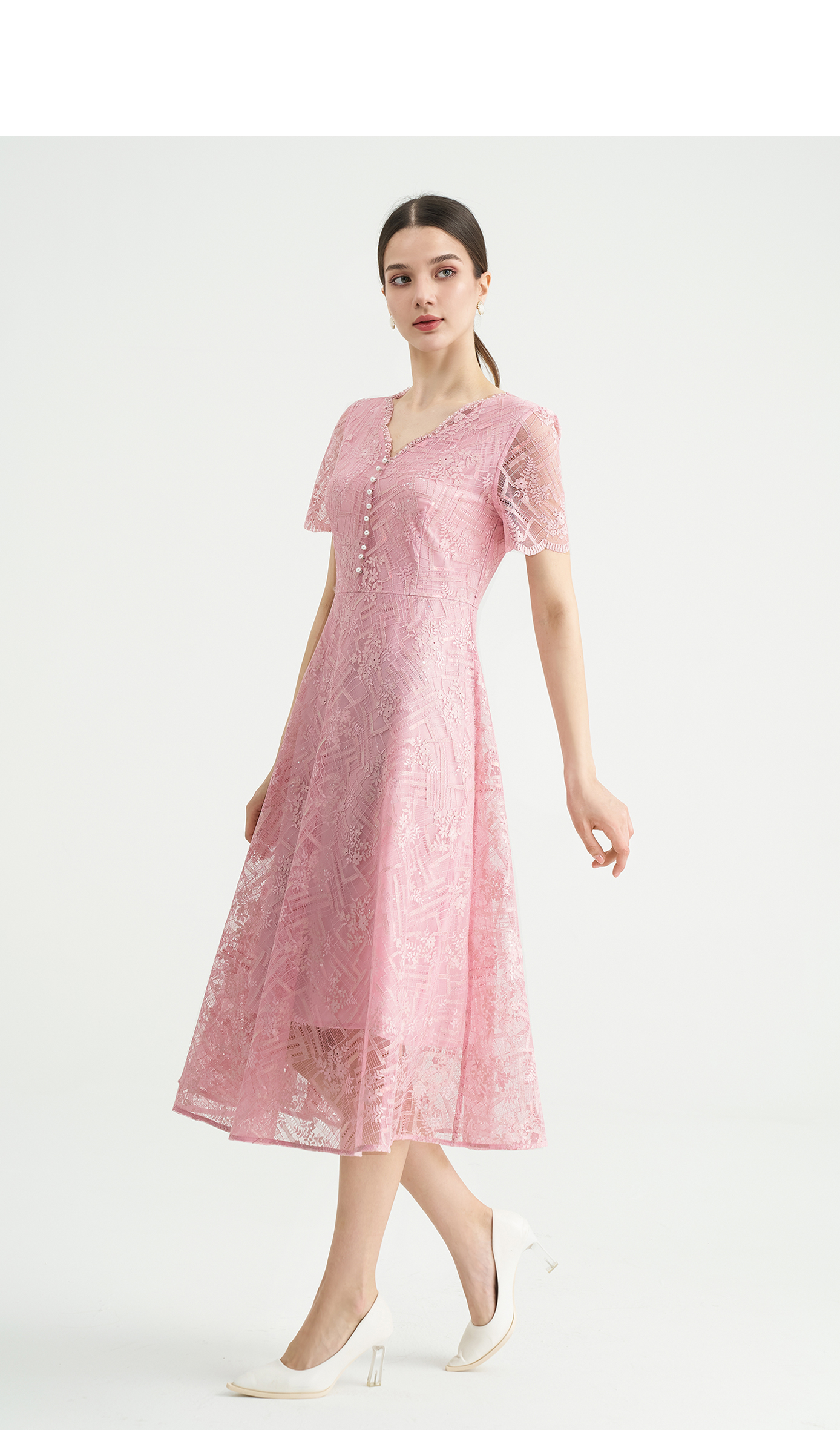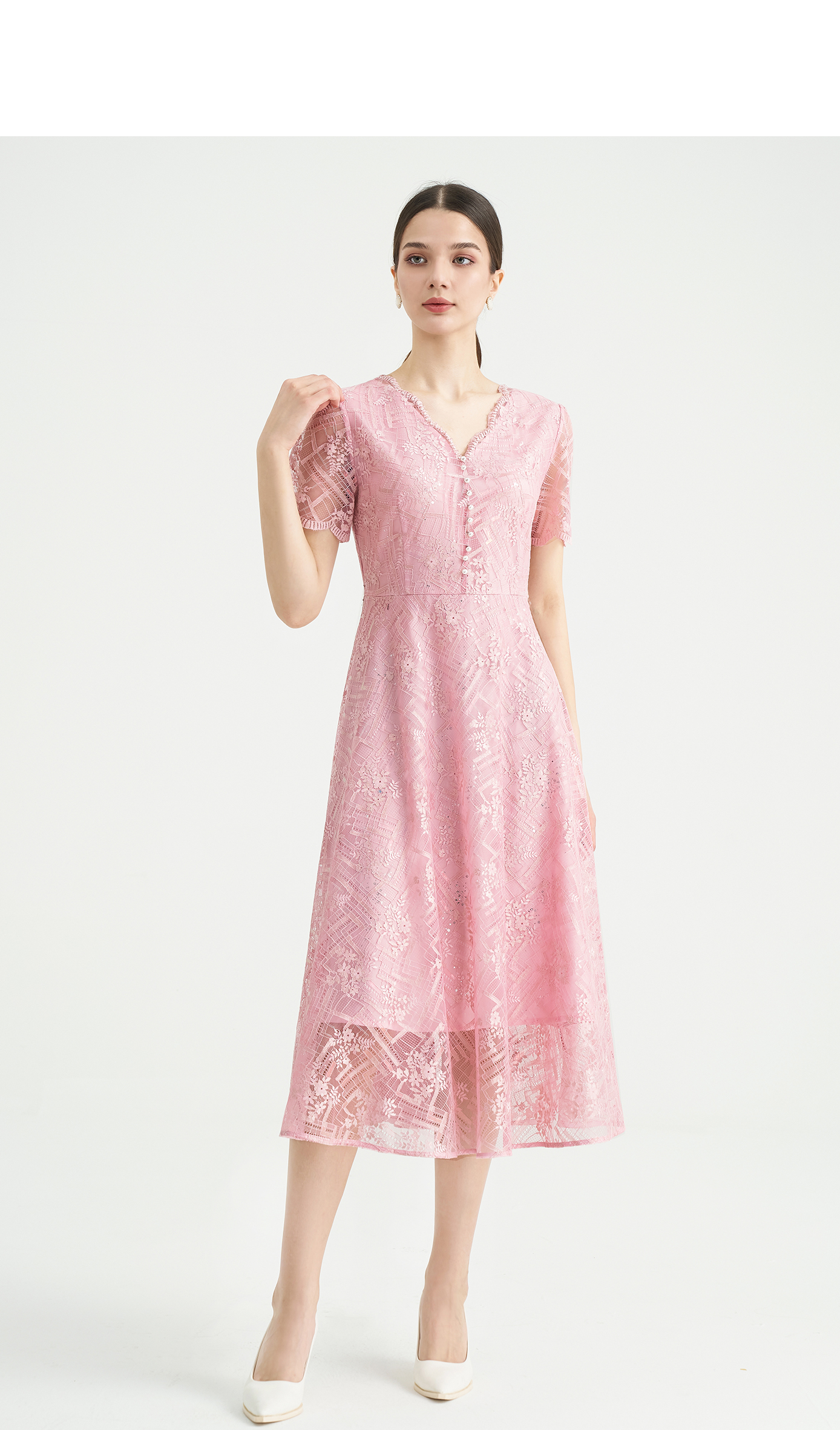 司歌v领蕾丝连衣裙短袖收腰显瘦优雅A89M005