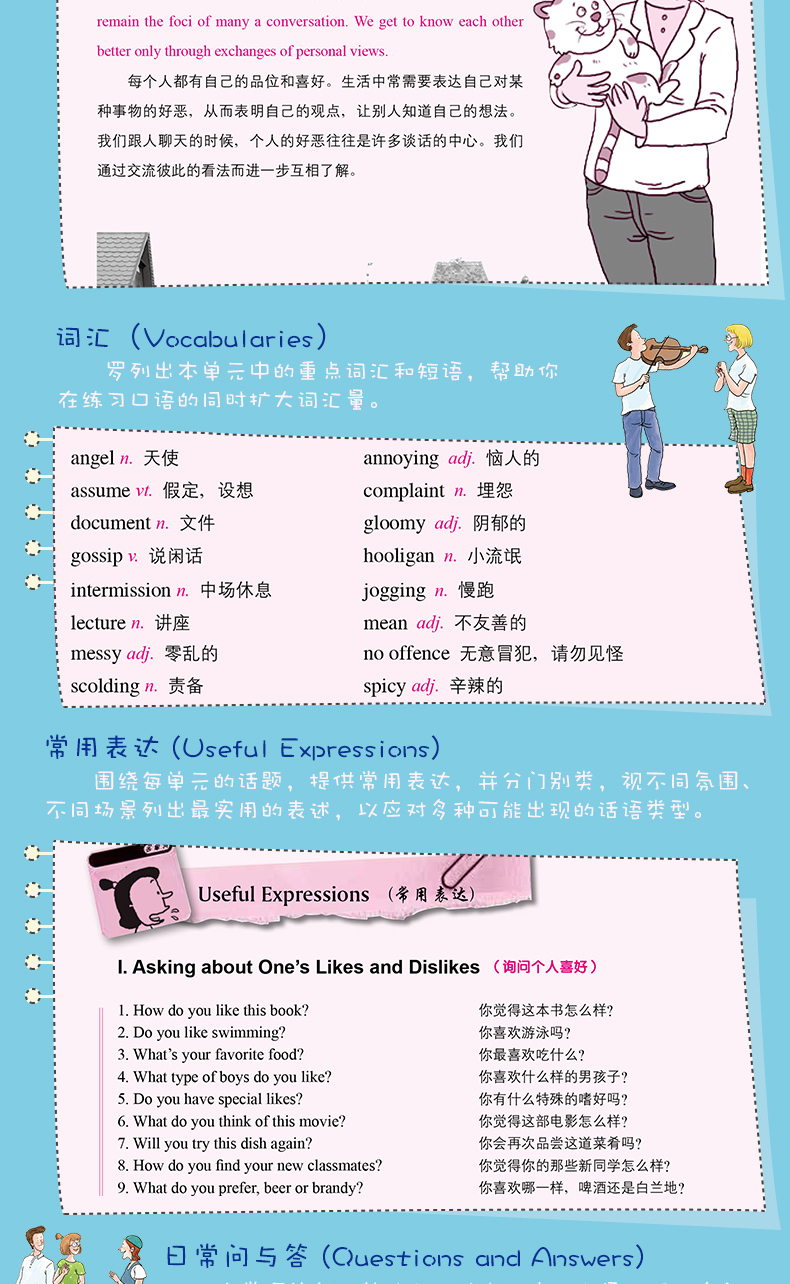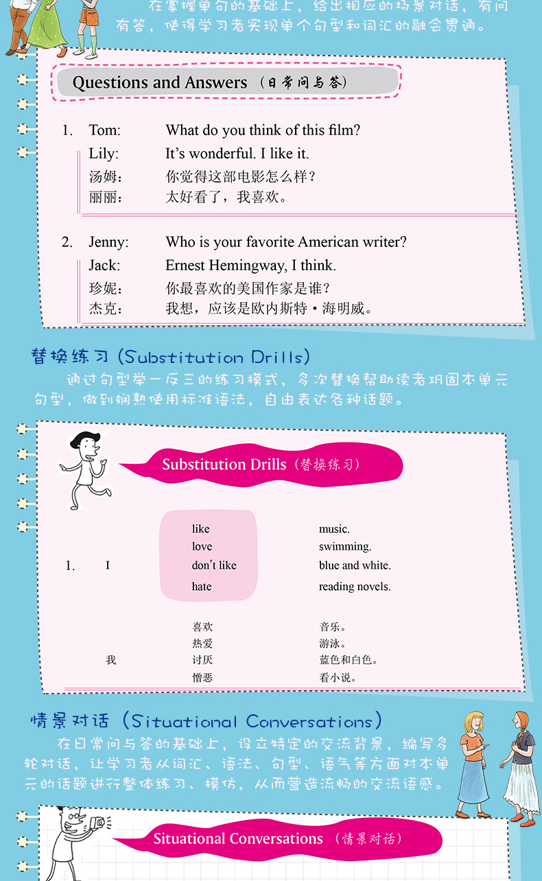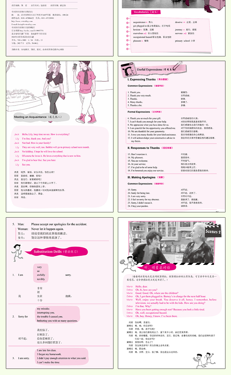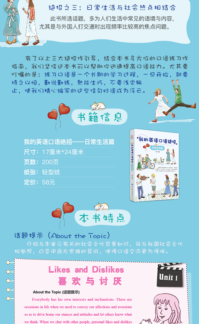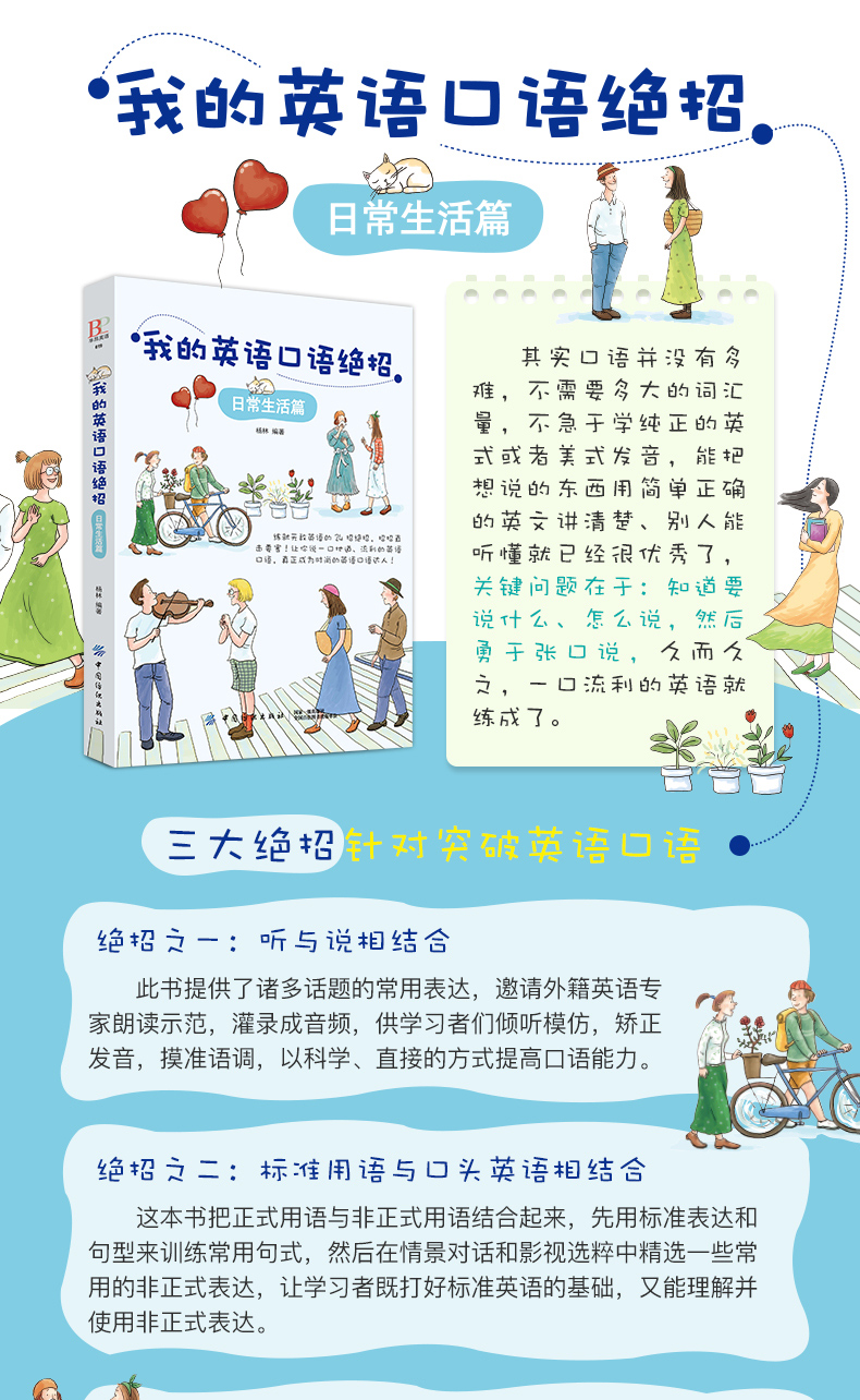 中国的英语学习者曾以“聋哑英语”闻名于世,虽然近年来口语水平有所提高,但“张不开嘴”仍然是学了多年英语的学习者常挂在嘴边的抱怨。其实口语并没有多难,不需要多大的词汇量,不需要纯正的英式或者美式发音,能把想说的东西用简单正确的英文讲清楚、别人能听懂就行了,关键问题在于:知道要说什么、怎么说,然后勇于张口说,久而久之,一口流利的英语就练成了。这就是我们一向坚持的学习之道。针对口语练习的特点,我们在《我的英语口语绝招——日常生活篇》中贯彻了三种绝招:绝招之一:听与说相结合, 绝招之二:标准用语与口头英语相结合,绝招之三:日常生活与社会热点相结合
