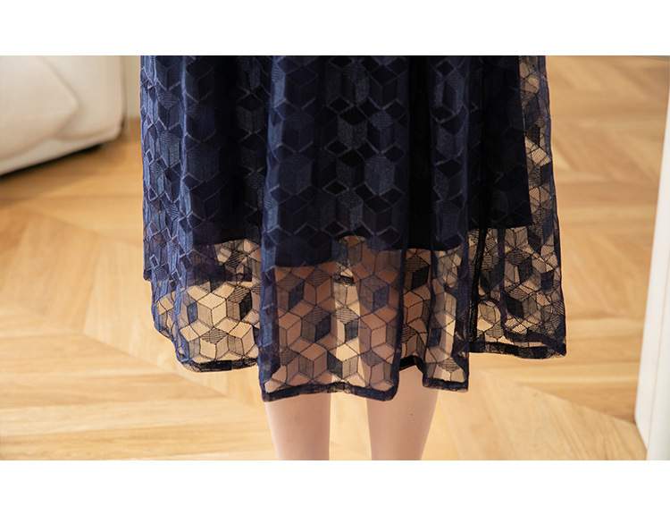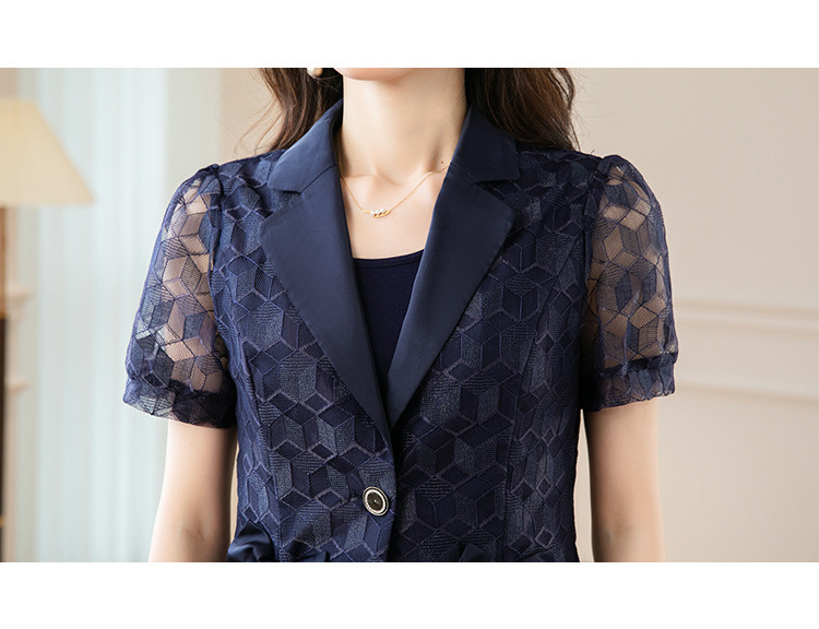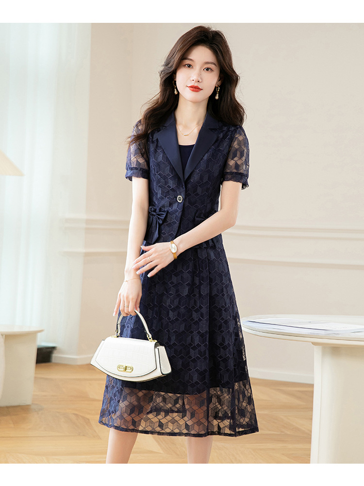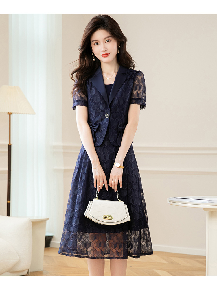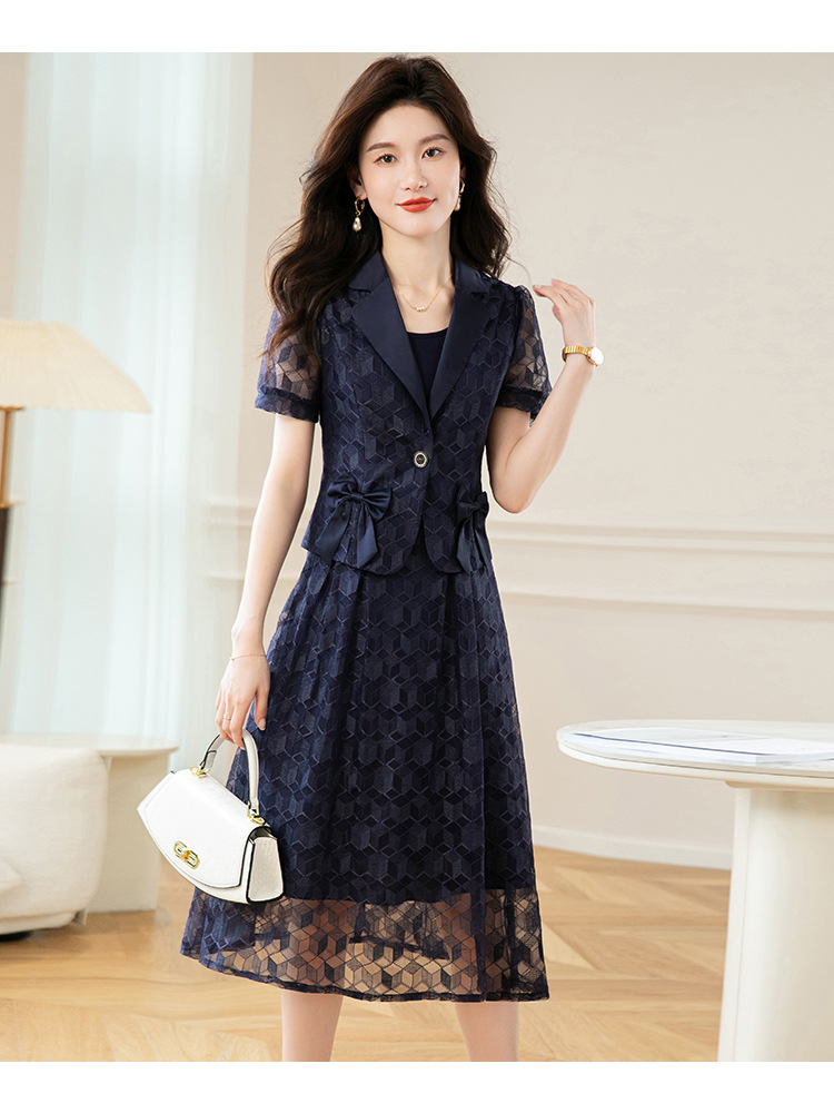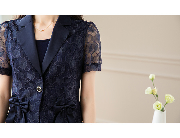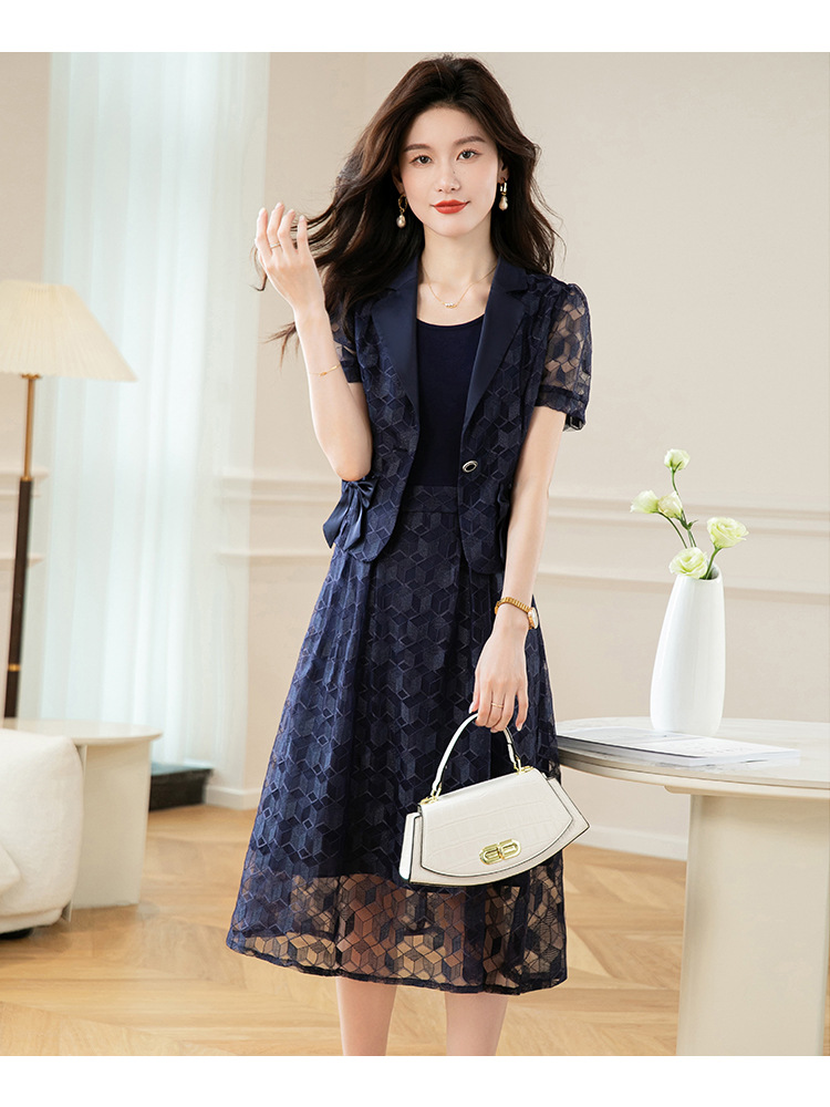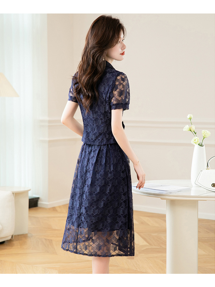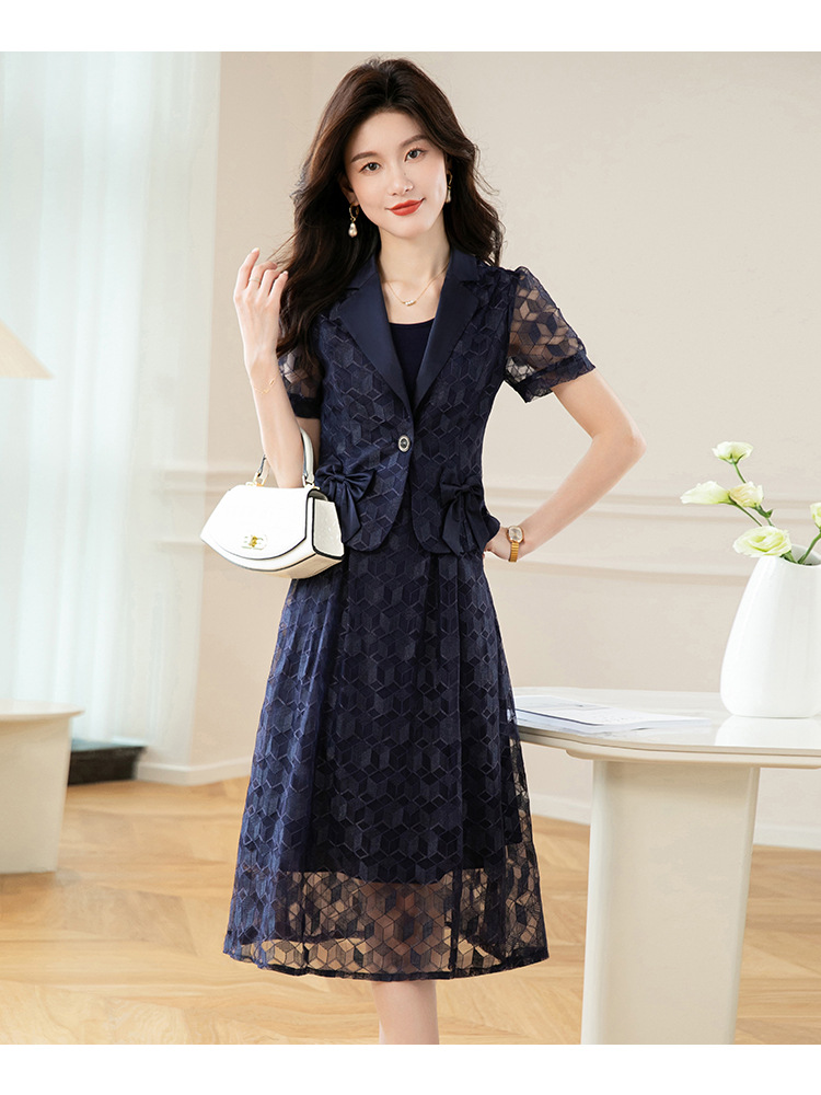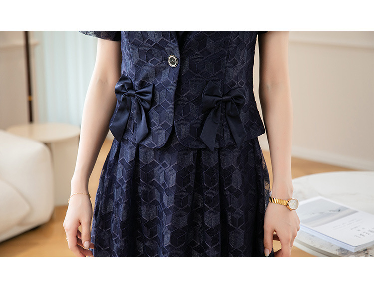 夏季新款,网纱几何格纹裙中长裙西装蝴蝶短袖外套两件套QYM-TB-CY1316-Y