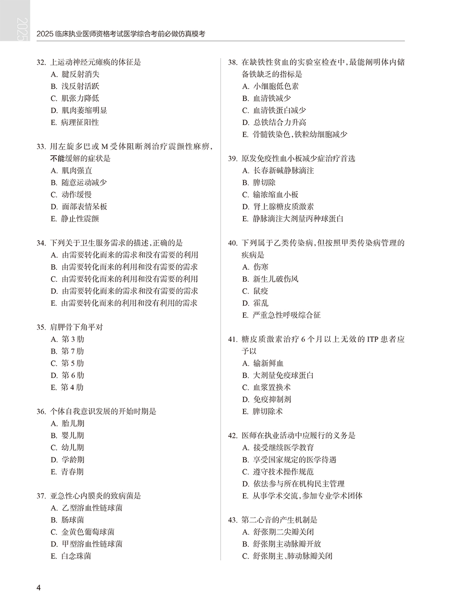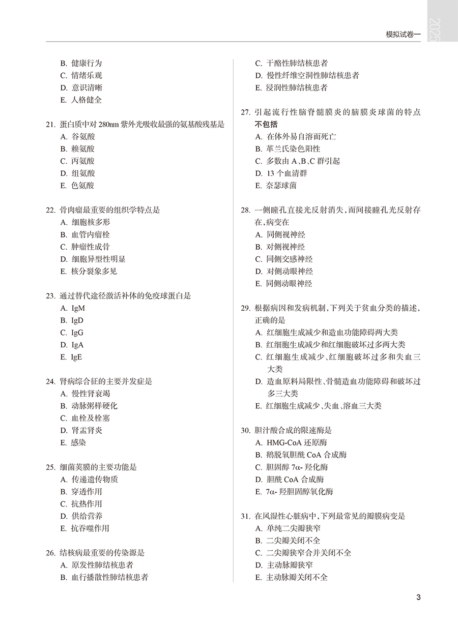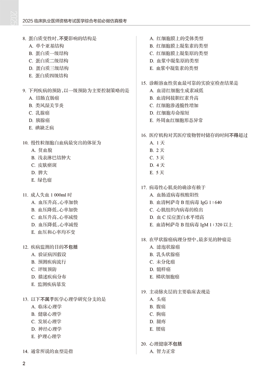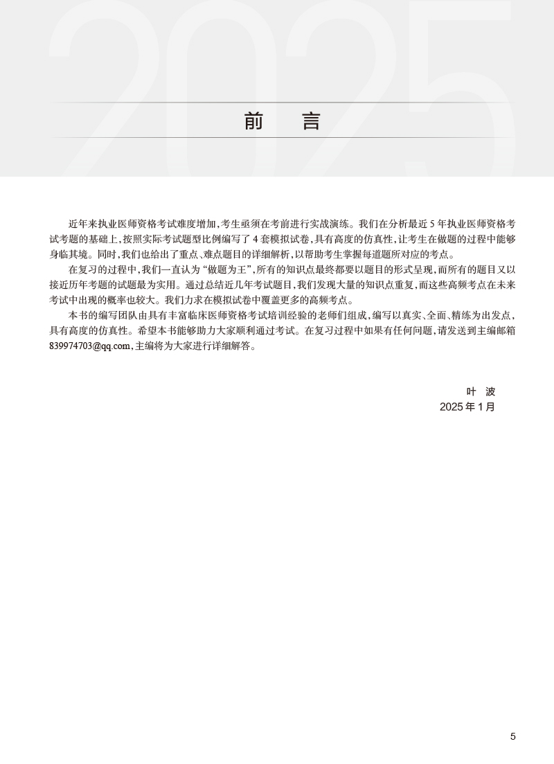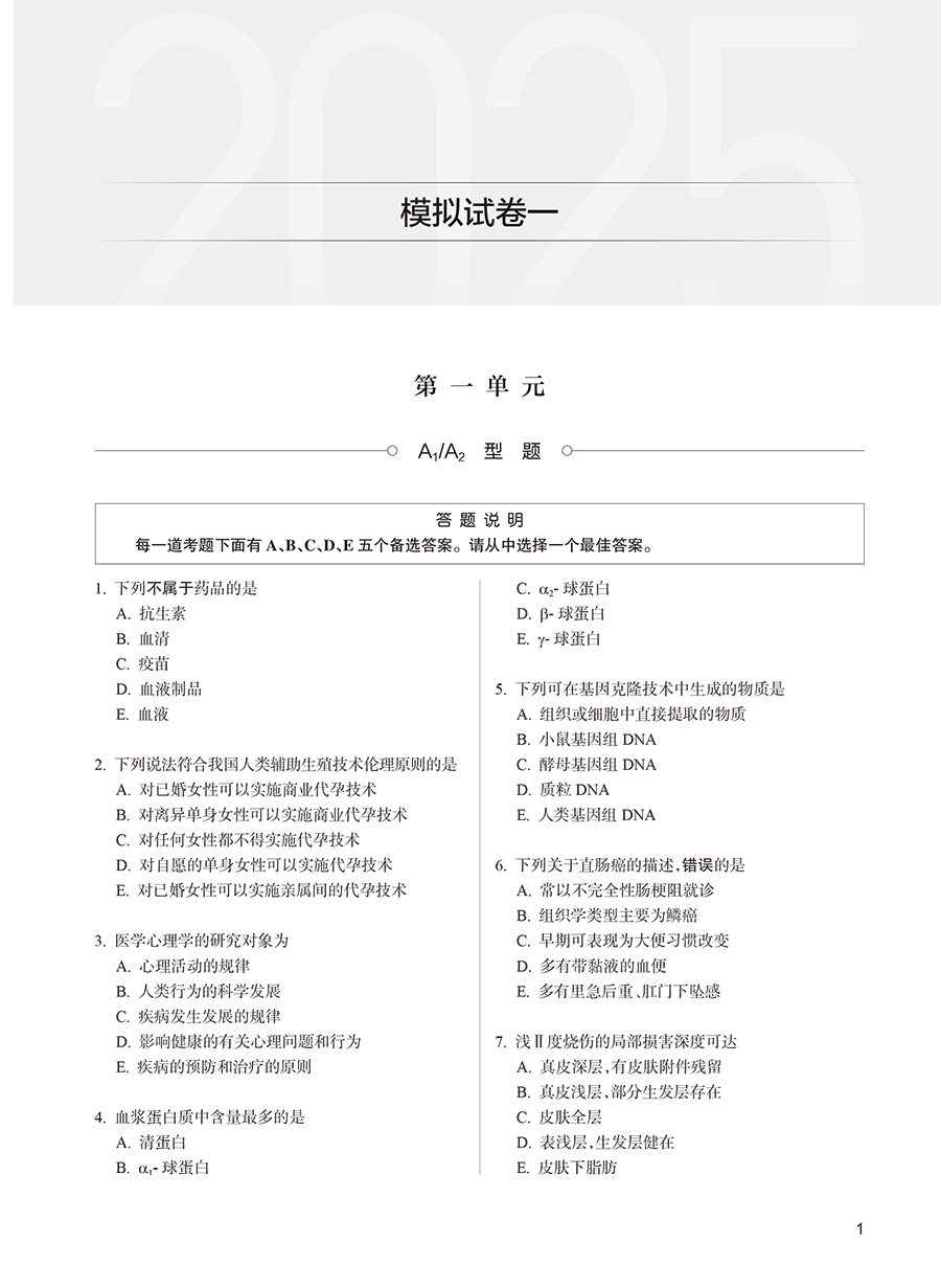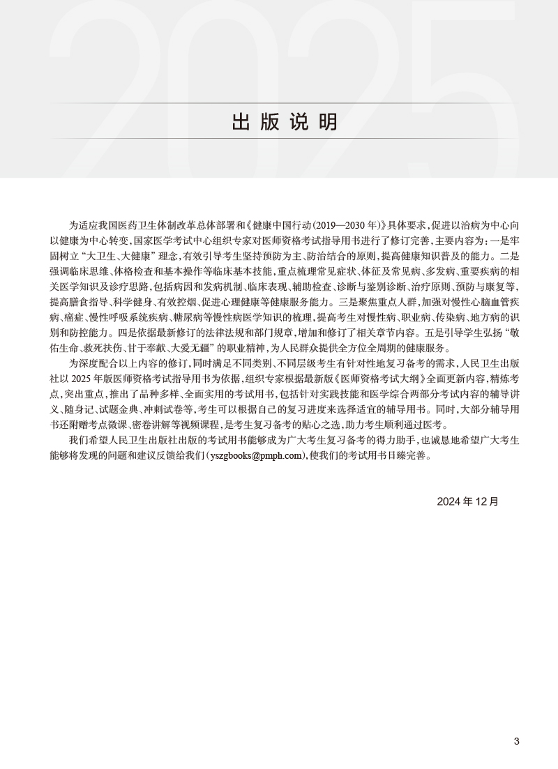 本书从2015年开始在我社连续出版。《2025临床执业医师资格考试医学综合考前必做仿真模考》根据2024年新考试大纲,在研究历年考试试题的基础上,认真分析总结命题规律,精心组卷。题型、难度和考点分布模拟真题,注重实用,有助于全面检验考生的复习情况,有较高的实用性。所有编者均为从事医师资格考试辅导的一线教师,长期致力于考题研究,对于考题和考点分布十分熟悉。本书模拟医师资格考试场景,所有试题的考点分布及题型比例全部按照实际考试设置,可作为检验复习效果、考前冲刺测试使用。