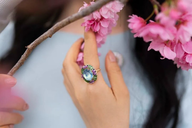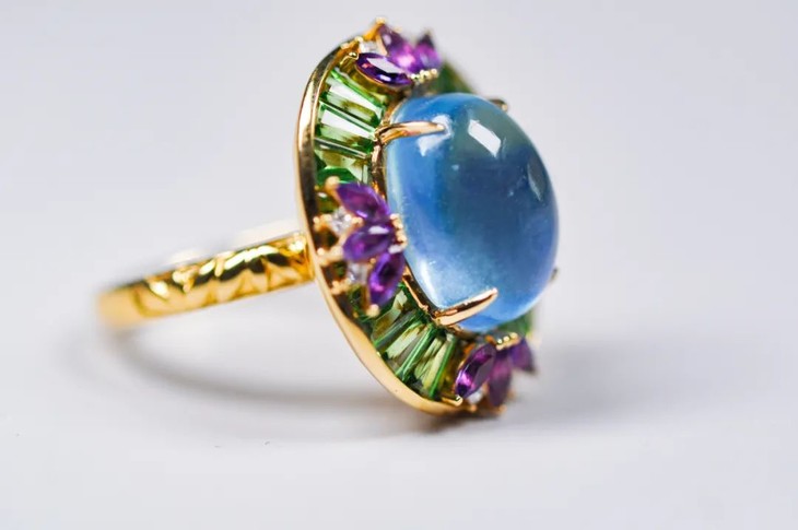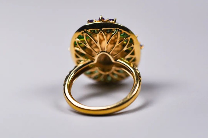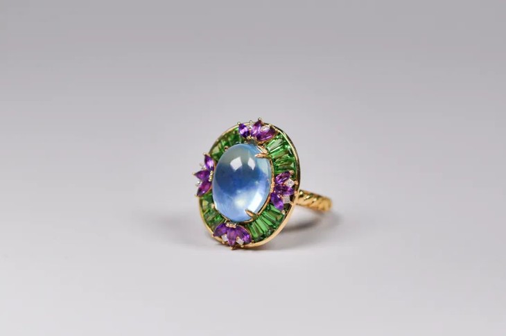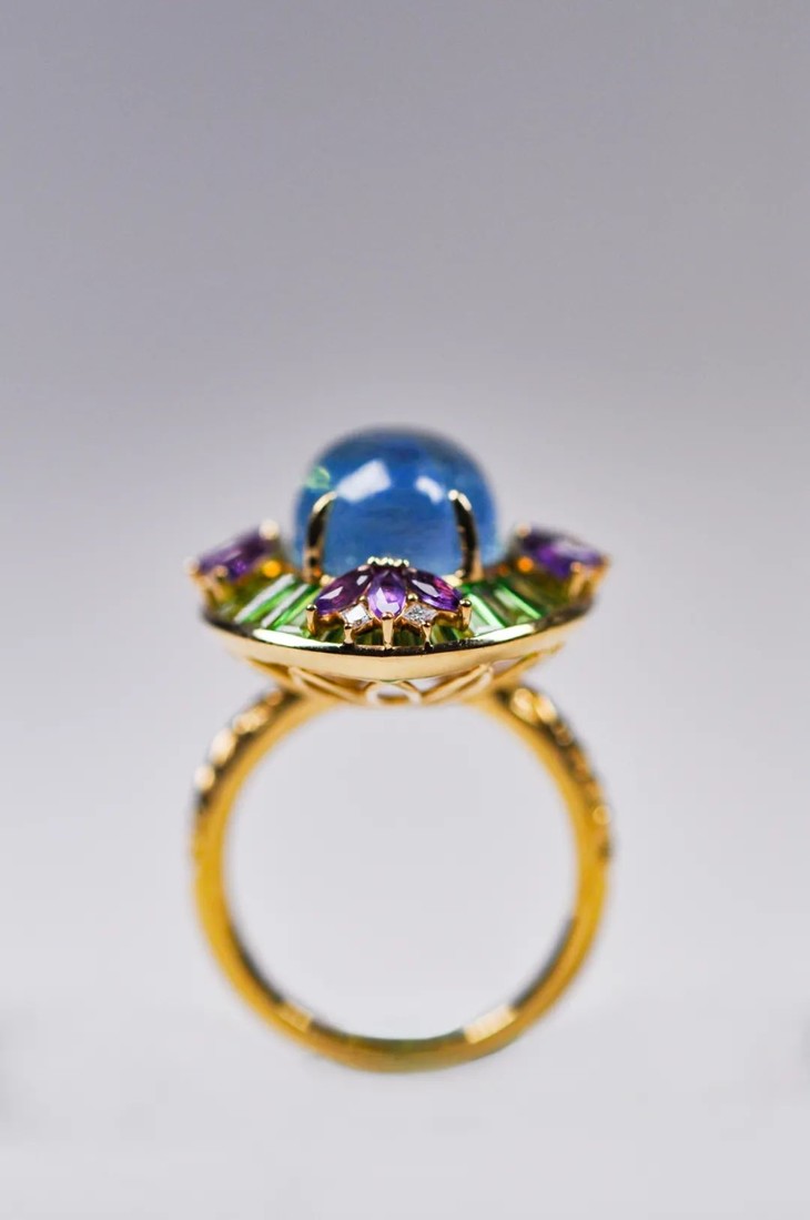 多颗紫水晶与梯形沙弗莱环绕拼接镶嵌的方式,