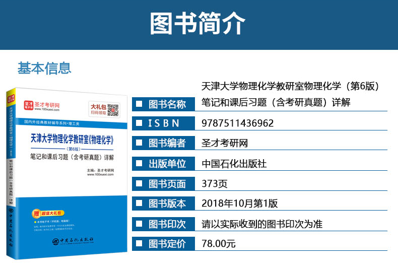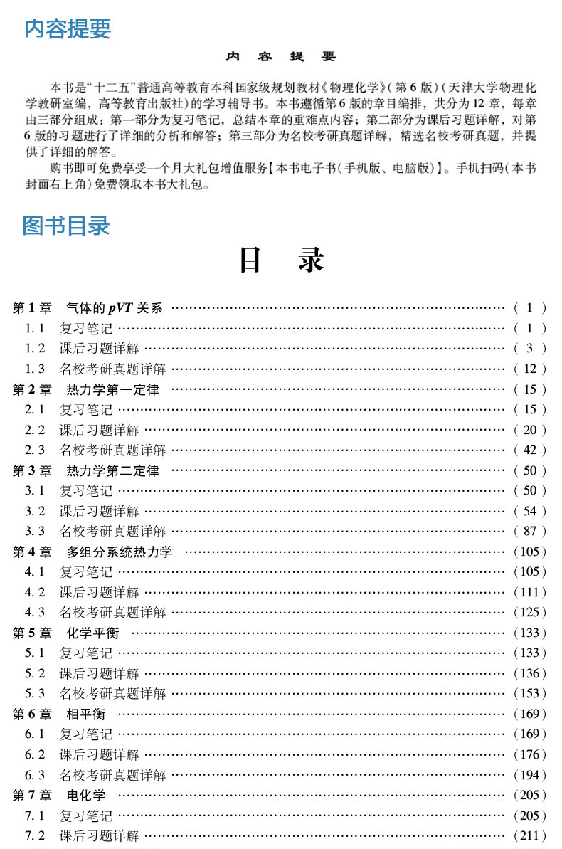 本书是“十二五”普通高等教育本科*规划教材《物理化学》(第6版)(天津大学物理化学教研室编,高等教育出版社)的学习辅导书。本书遵循第6版的章目编排,共分为12章,每章由三部分组成:*部分为复习笔记,总结本章的重难点内容;第二部分为课后习题详解,对第6版的习题进行了详细的分析和解答;第三部分为名校考研真题详解,精选名校考研真题,并提供了详细的解答。