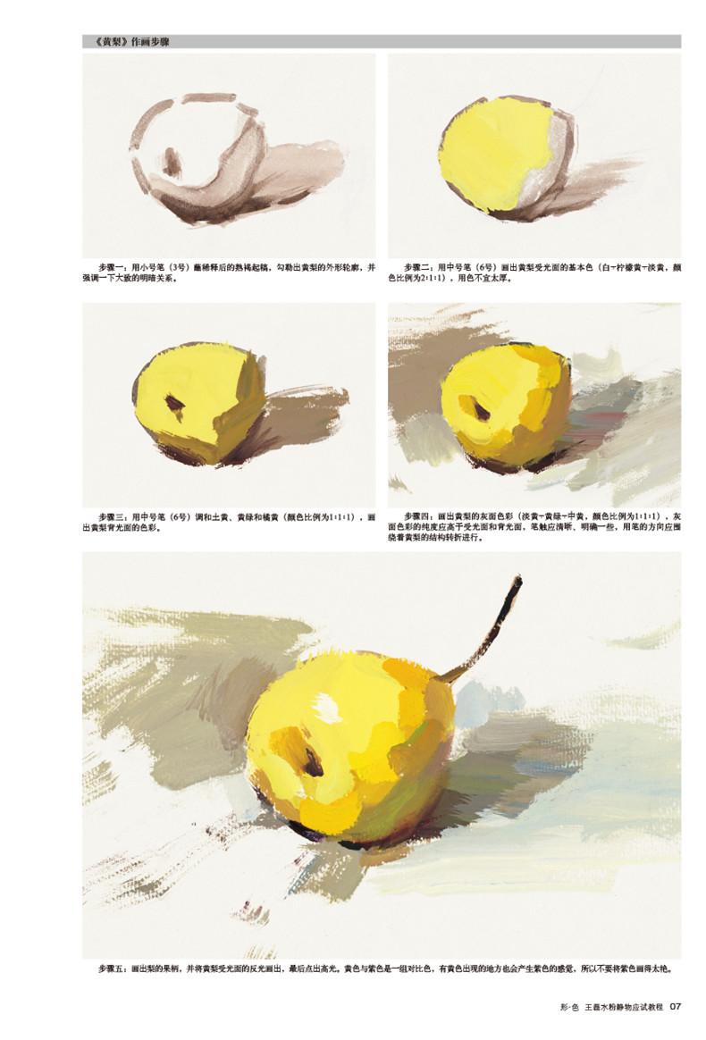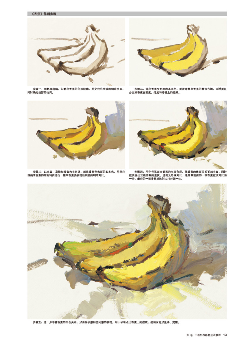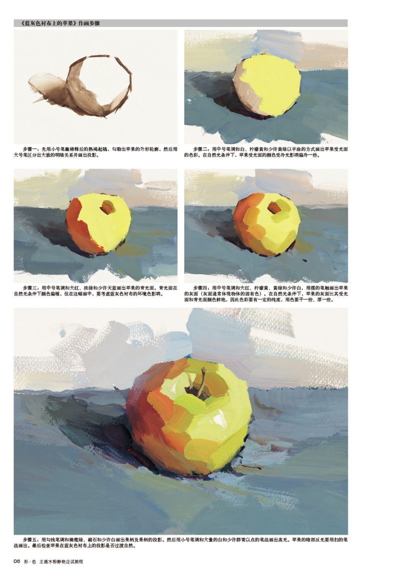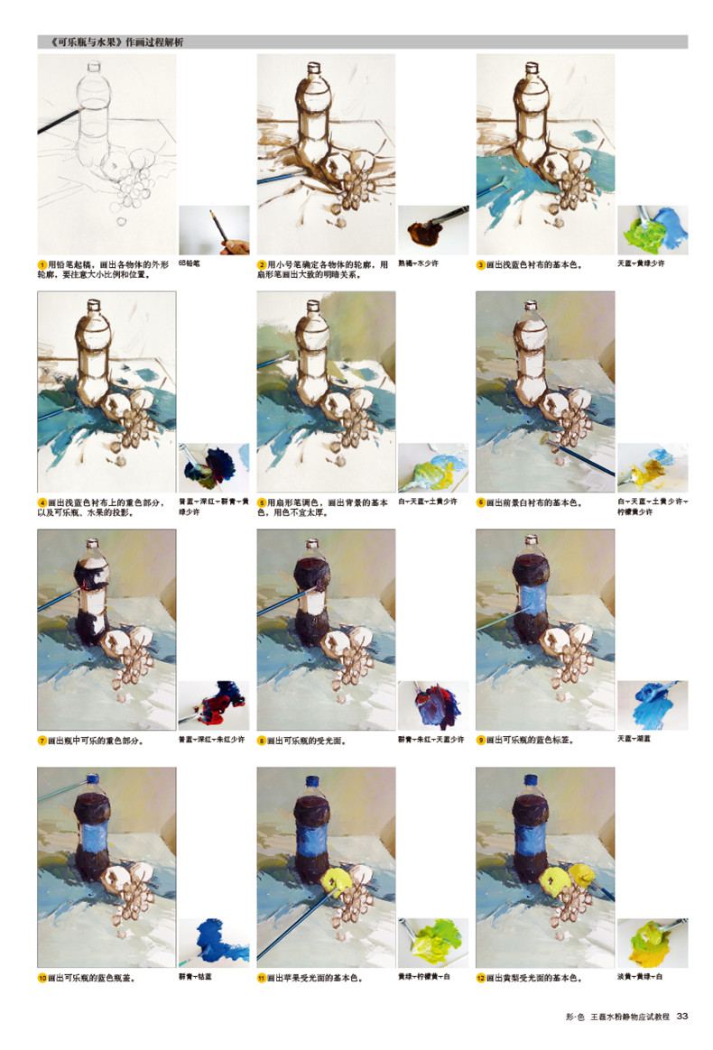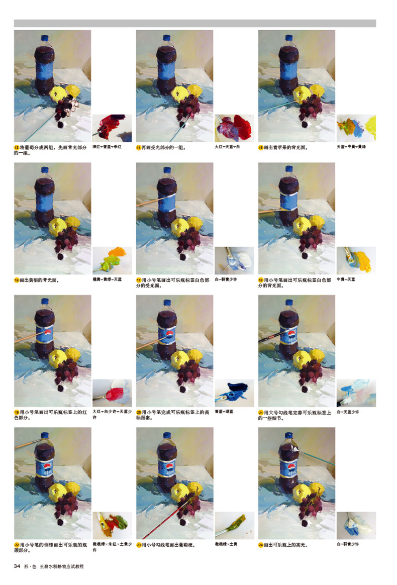 第一部分:色彩知识讲解,包括画水果、蔬菜、饮料瓶、陶瓷器皿、玻璃器皿等物体的用笔、用色技巧,讲解的时候要有笔触分析。 第二部分: 1.可口可乐瓶(1.5升大瓶) 2.娃哈哈矿泉水瓶 3.啤酒瓶或红酒瓶 4.苹果 5.梨 6.橘子 7.一把香蕉 8.陶罐 9.花瓶 10.大白菜 11.不锈钢热水壶 12.直筒玻璃杯或高脚杯 13.切片面包 14.白瓷盘或白瓷杯 15.切开的西瓜(小瓣) 16.菜椒 以上单体物体分3步完成的范画,另需有一张实物照片(步骤图可提供电子图)。 第三部分:6幅有详细作画过程的范画(详细程度同《色块训练》一书,我会寄书给王老师,详细分解部分可提供电子图)。 第四部分:6幅分4步完成的范画(步骤图可提供电子图)。 第五部分:40幅左右带点评的完全范画。