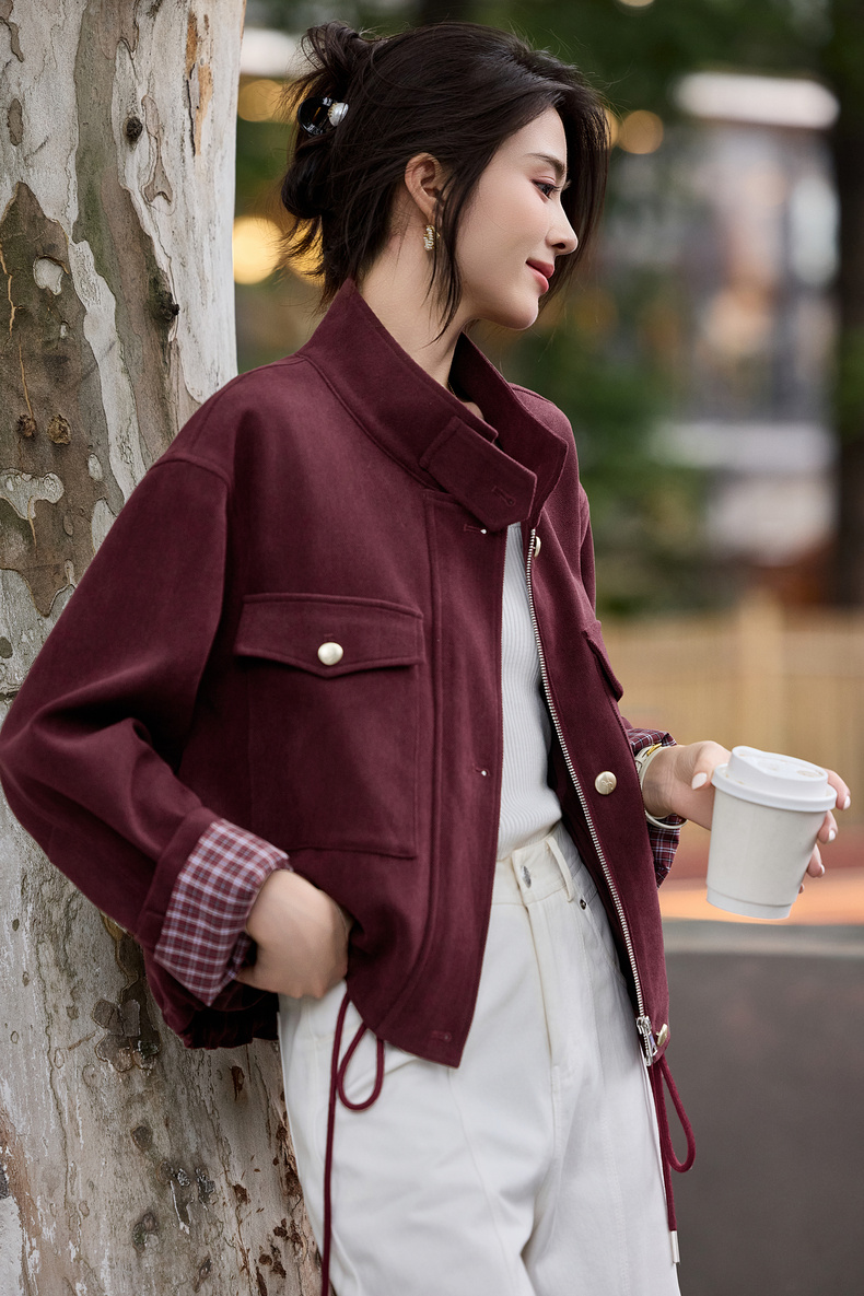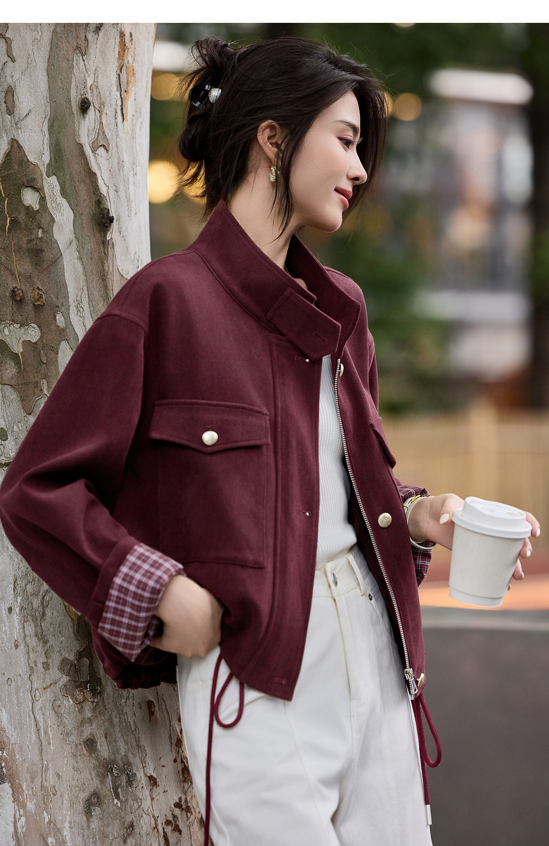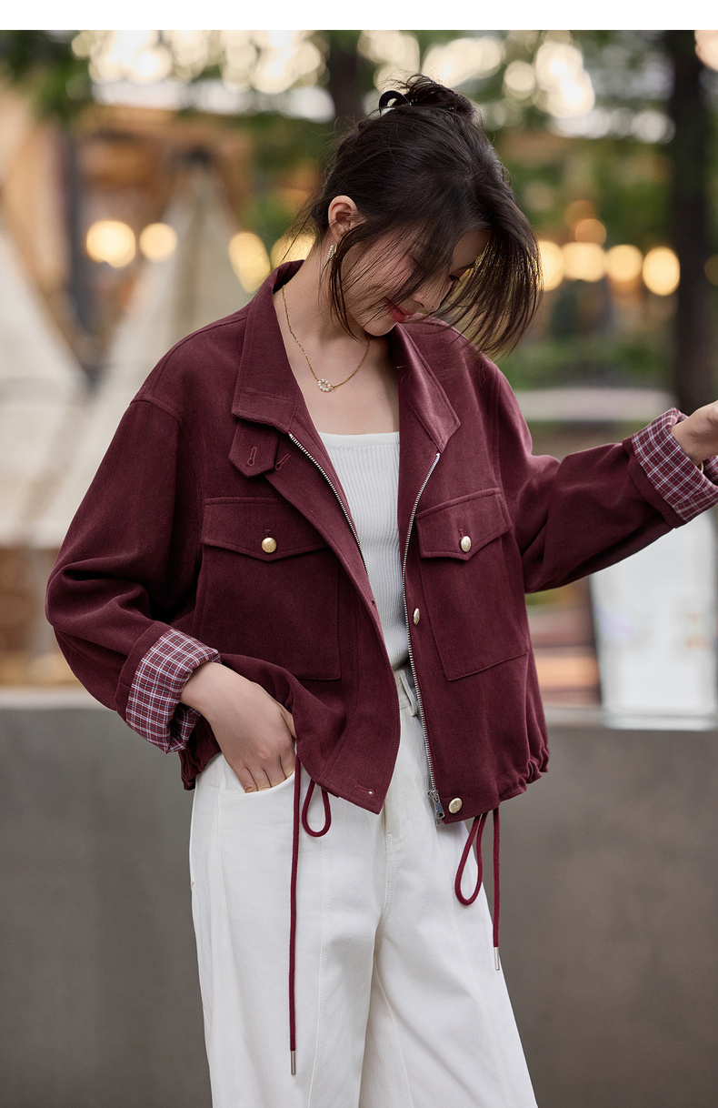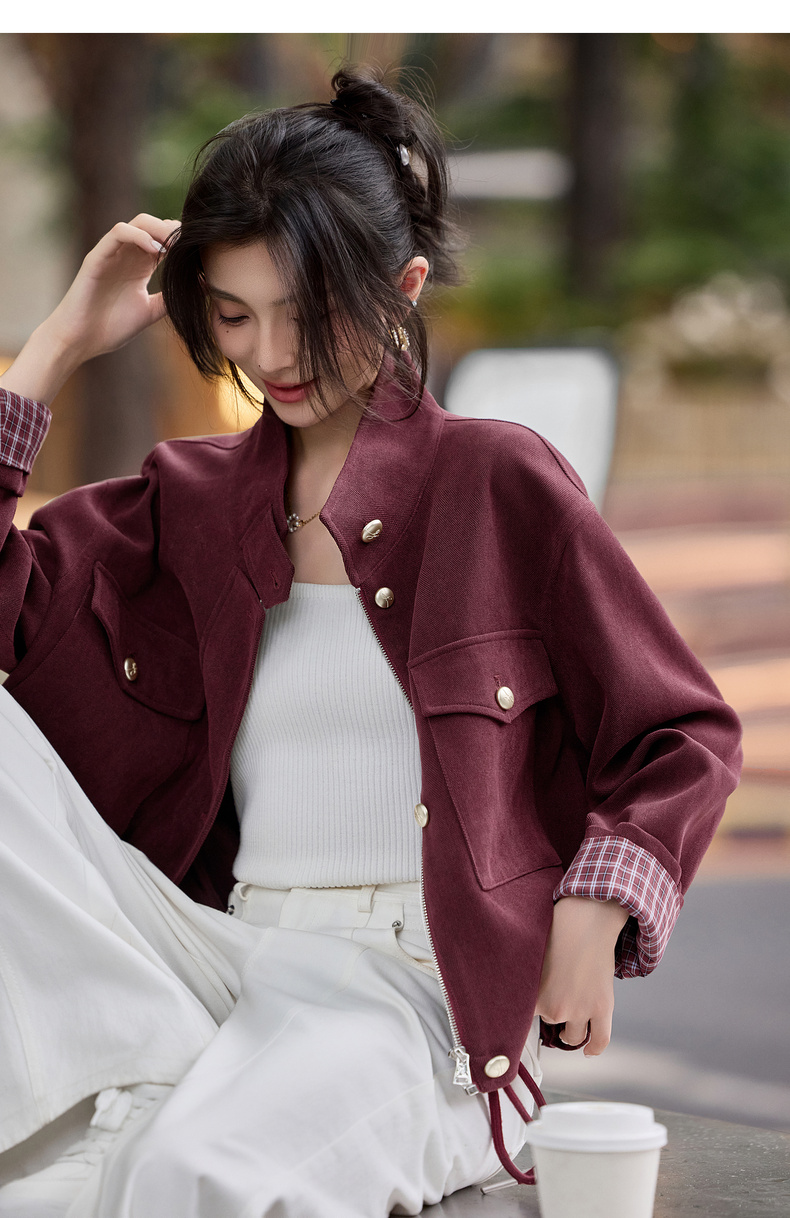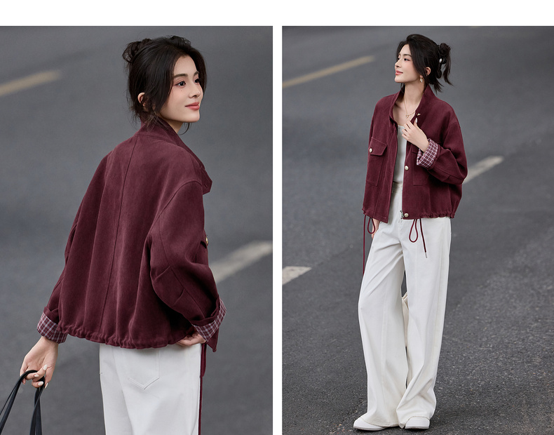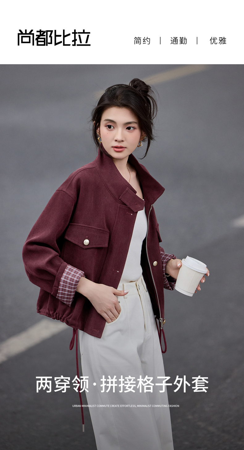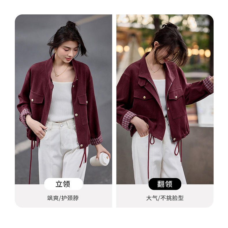 【内购】【两穿领】简约通勤气质立领/翻领下摆抽绳撞色格子长袖宽松外套-153WB1939