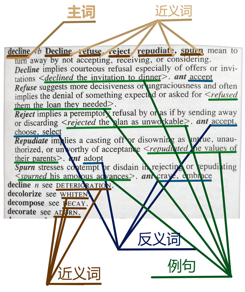 举个例子,对于同义词组:decline/refuse/reject/repudiate/spurn 书中除了给出单词意思对比外,还有单词在该含义下的反义词(在词条最后加粗的ant那里),这能够方便我们进行单词扩展。