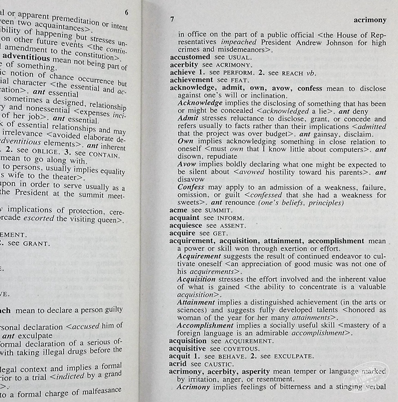 书中对于同义词的呈现也比较简洁:列出一组意思相近的词,然后对各个词的意思作说明,同时还配有例句。与其他同类书籍不同的一点是,它除了列出同义词之外,还有反义词。