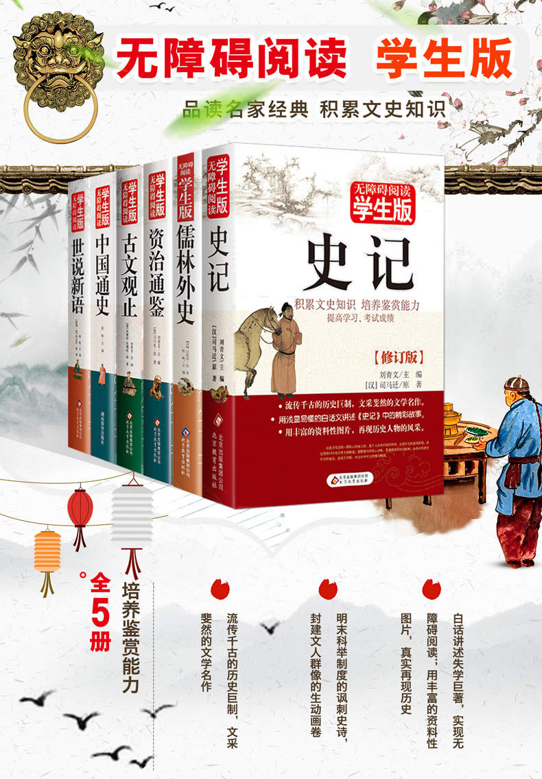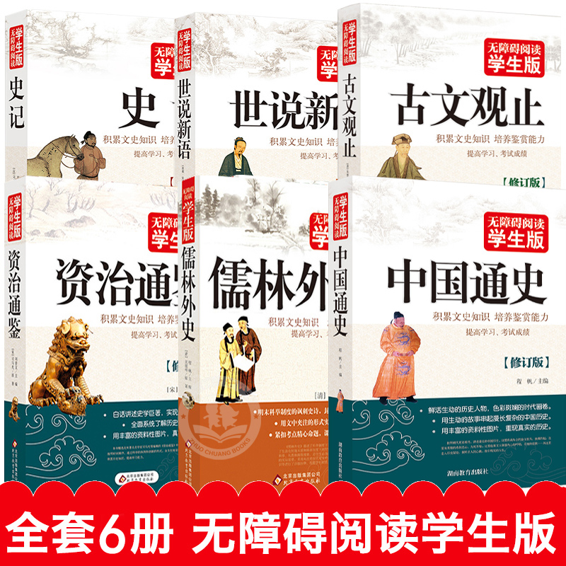6册 史记小学生版儿童正版书籍中国通史世说新语完整版儒林外史原著资治通鉴古文观止原文全解初中青少年版五年级必读课外阅读书籍