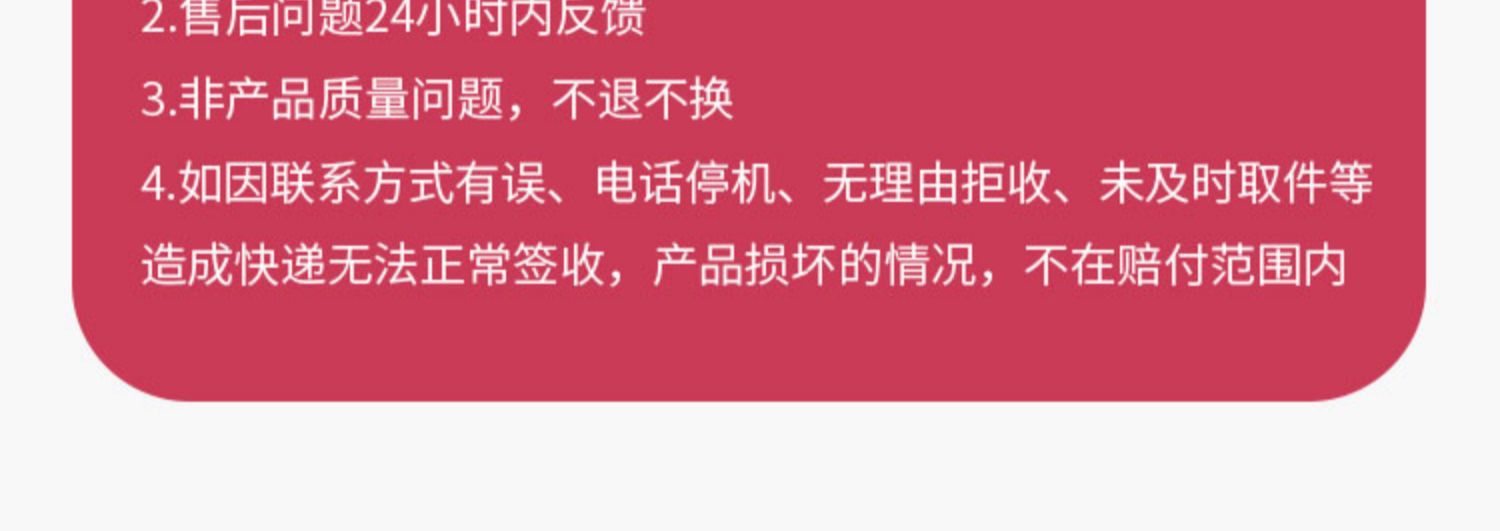1、本产品下单后不支持7天无理由退换货,不支持拦截&拒收,请您谨慎下单。