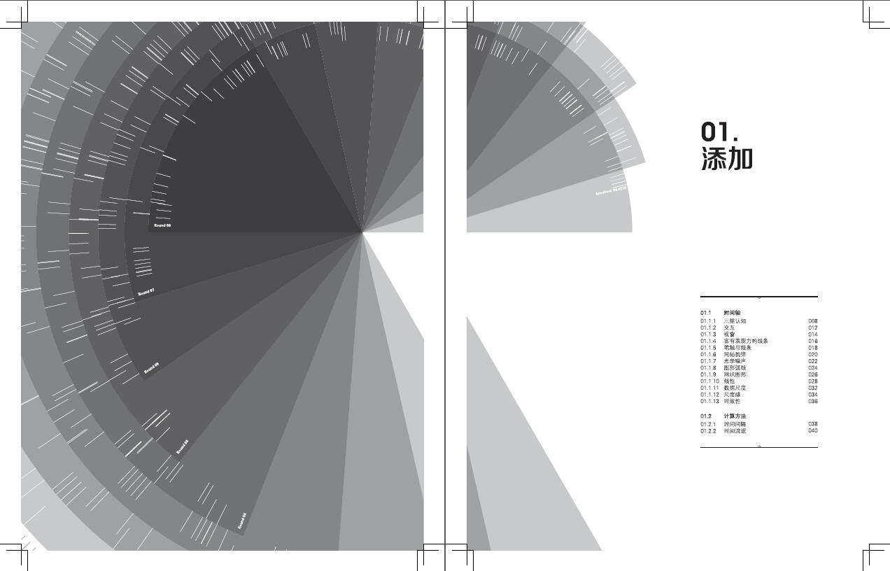 | 添加 01.1 时间轴 01.2 计算方法 数据 02.1 量化 02.2 统计 02.3 报告与说明 顺序 03.1 时刻表 03.2 列表 年表 04.1 日历 04.2 日记簿 04.3 钟表 抽象化 05.1 变形 05.2 地方的 05.3 字体设计 形式 06.1 图形 06.2 数字 06.3 表达 增加 07.1 标识系统 07.2 超大图形 少 08.1 缩 08.2 简化 附录 09.1 规则+细节 09.2 索引 09.3 致谢 |