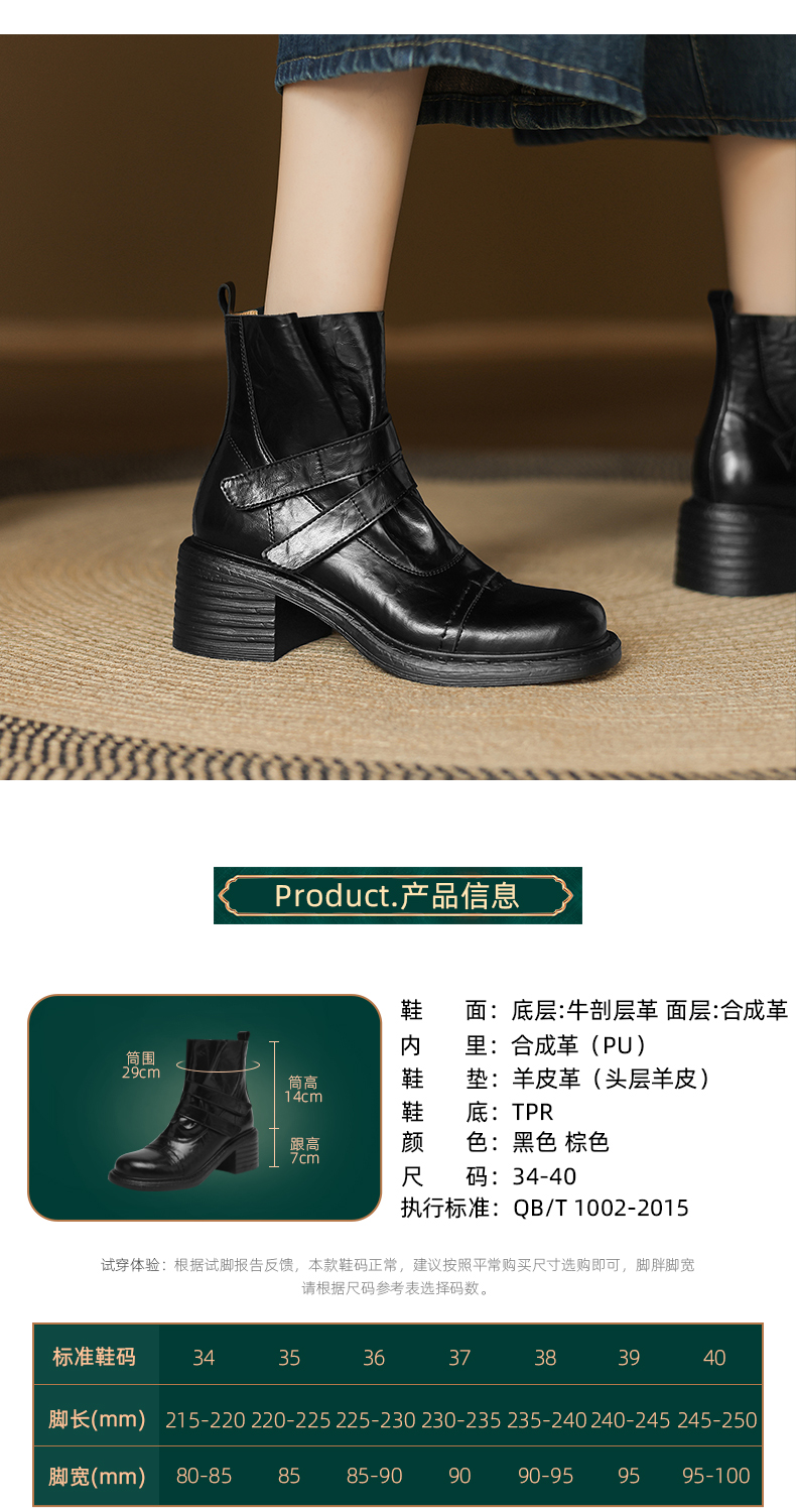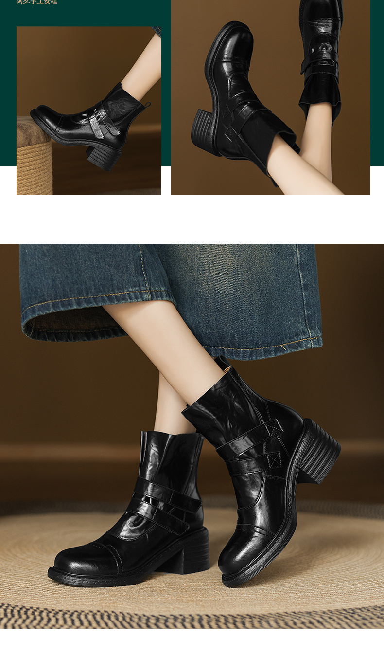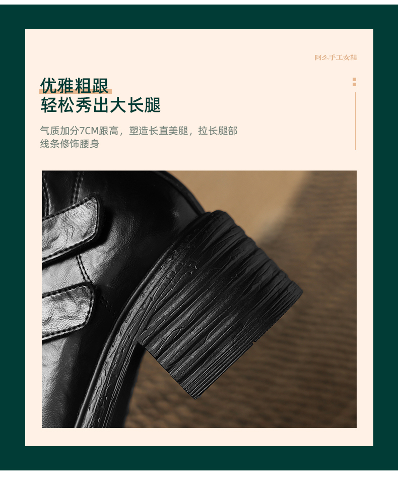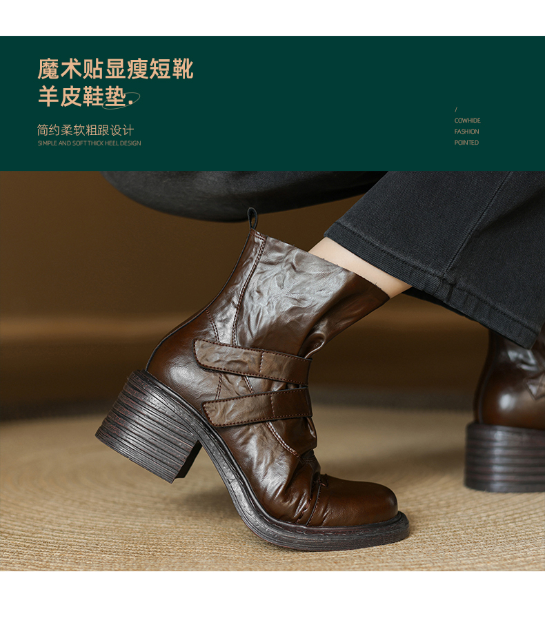 阿么手工女鞋复古时尚魔术贴高跟短靴2025新款气质小个子靴子7CM