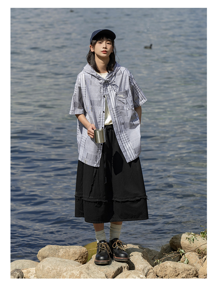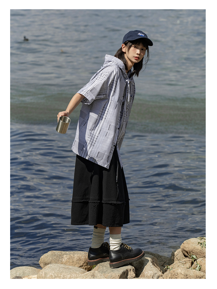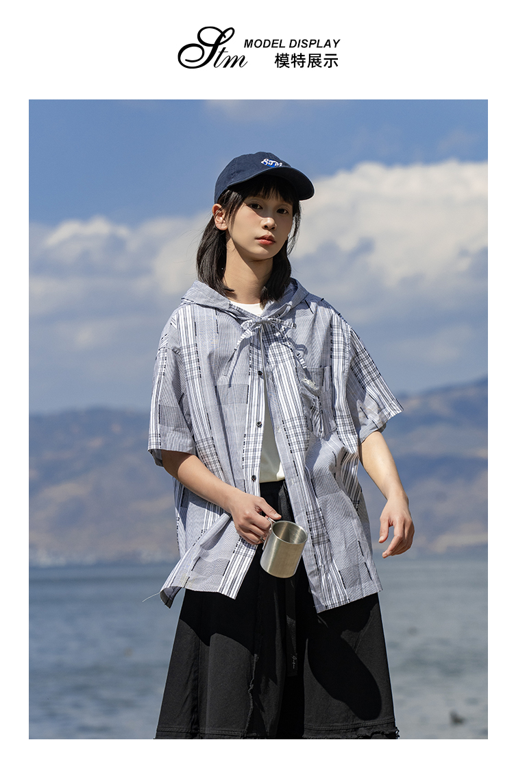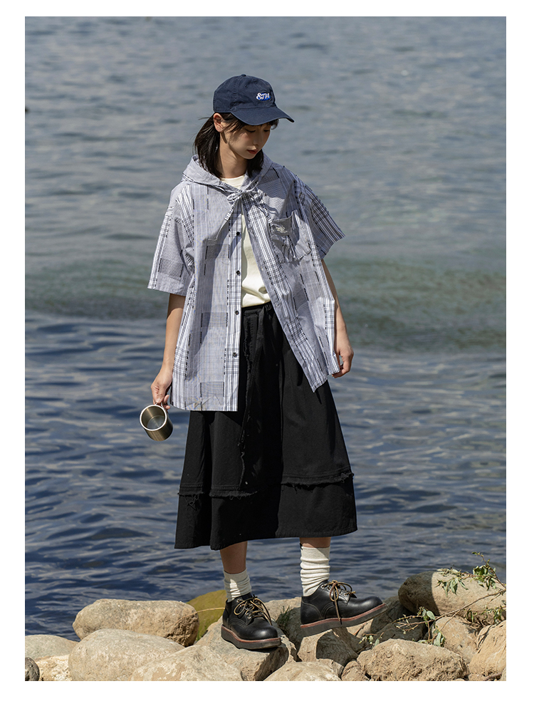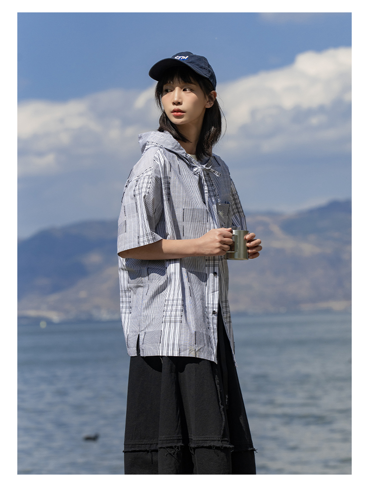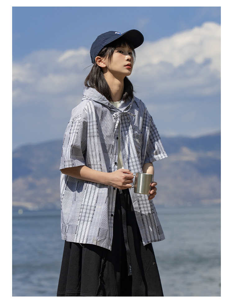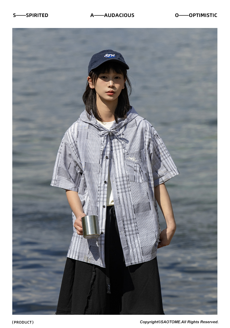 早乙女惠子saotome/STMCS242046/连帽肌理色织格纹短袖衬衫