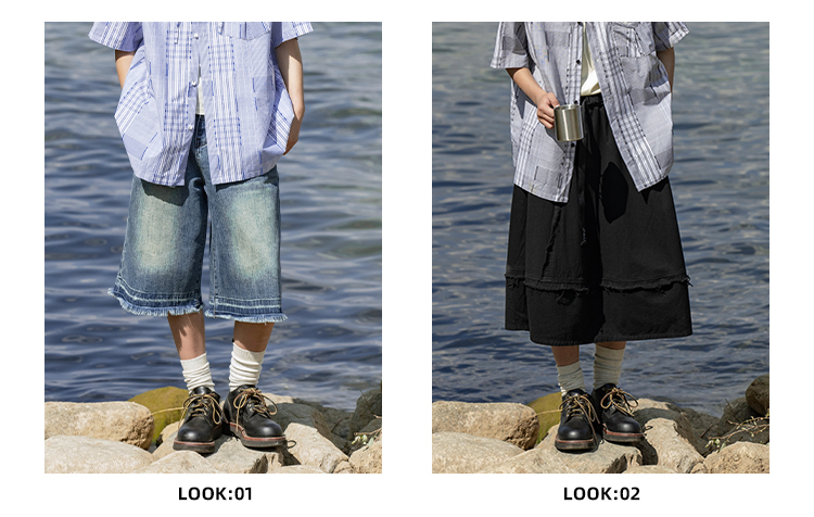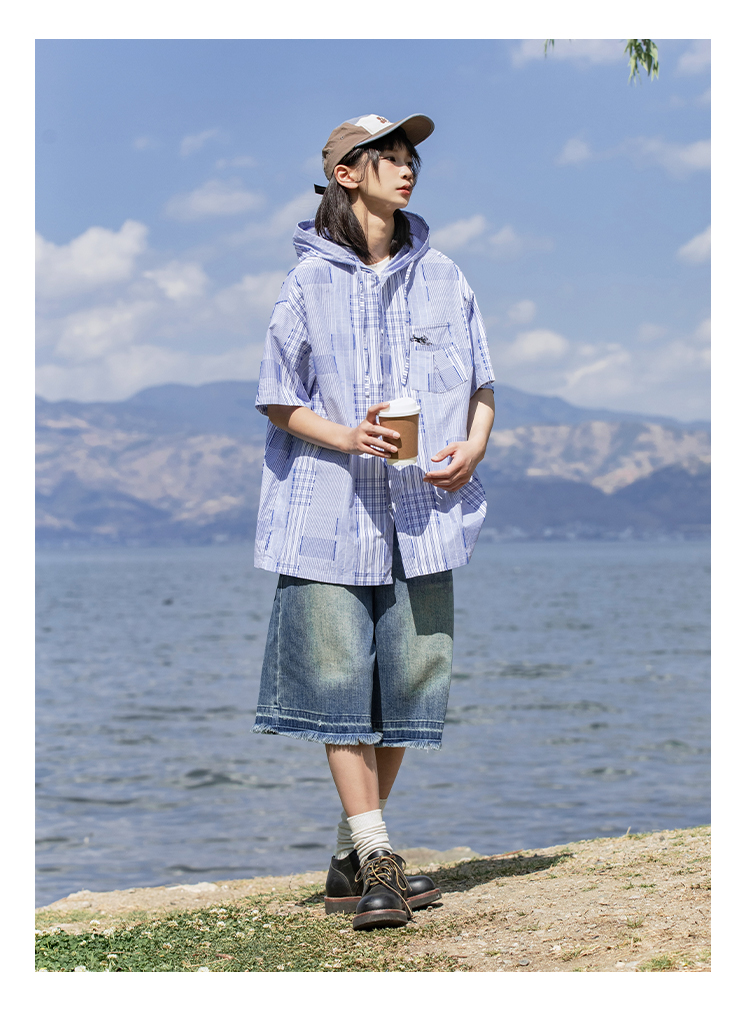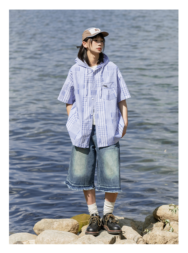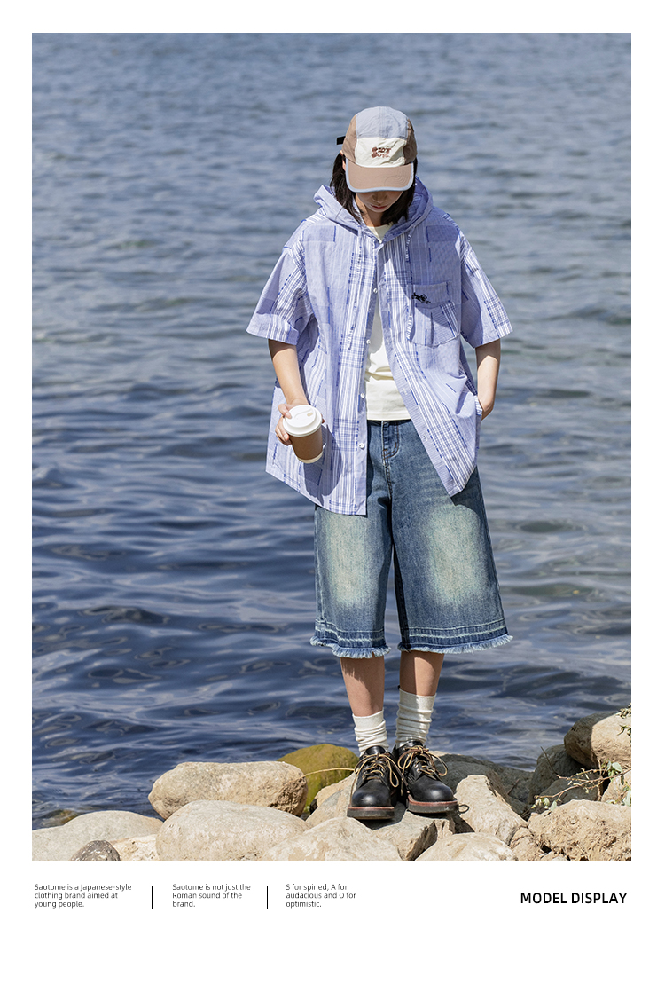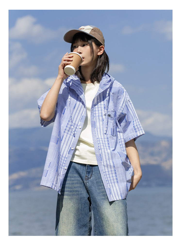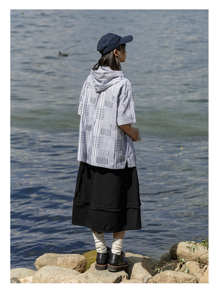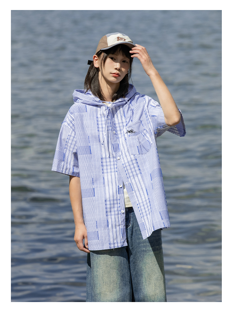 早乙女惠子saotome/STMCS242046/连帽肌理色织格纹短袖衬衫