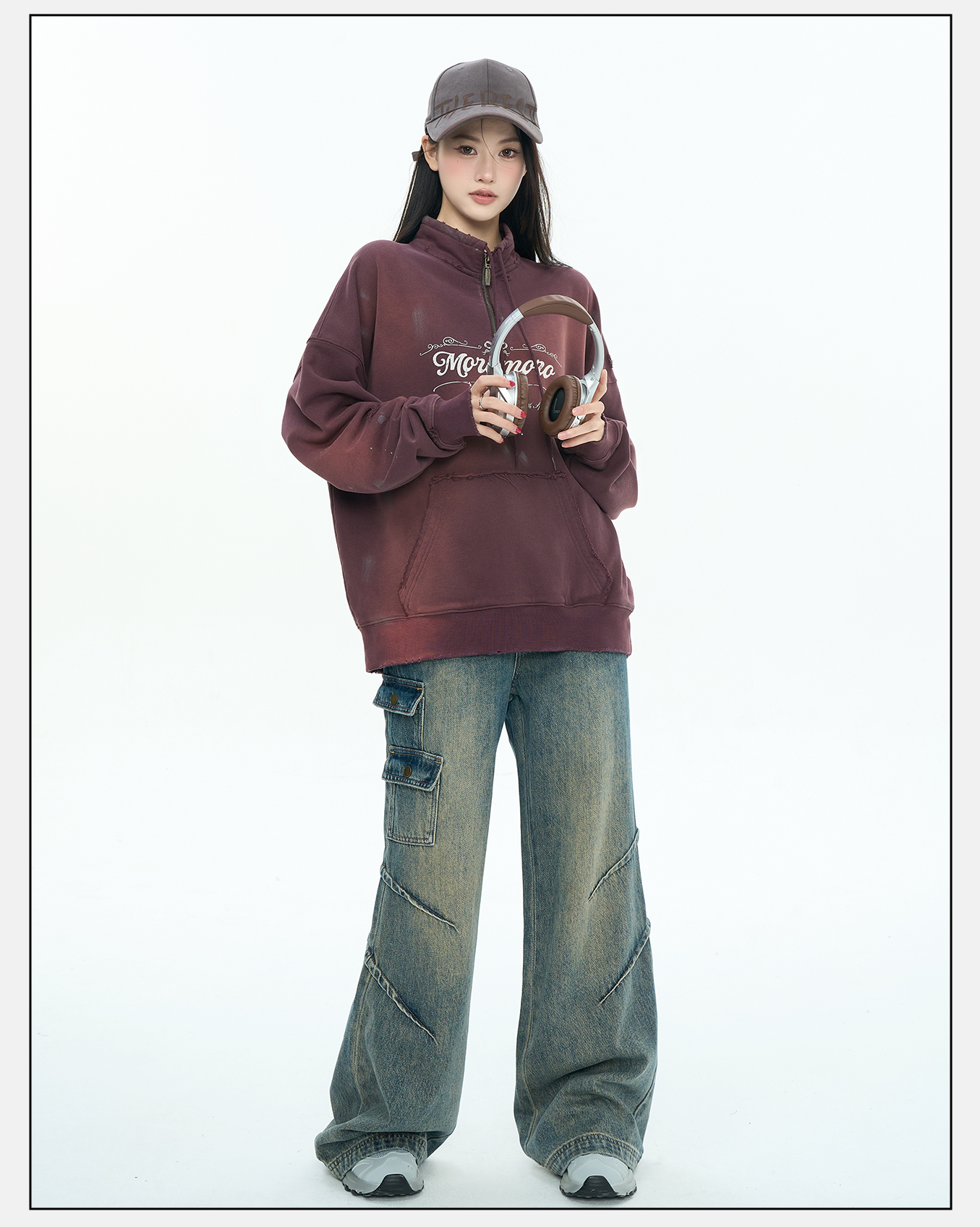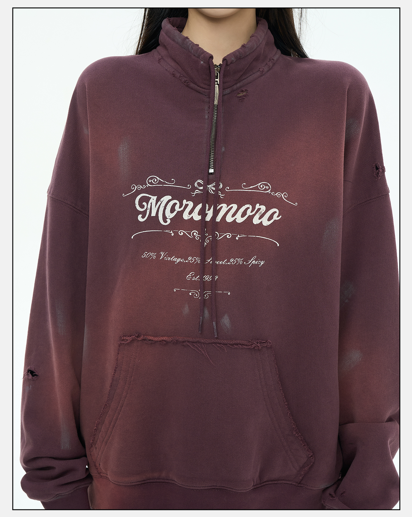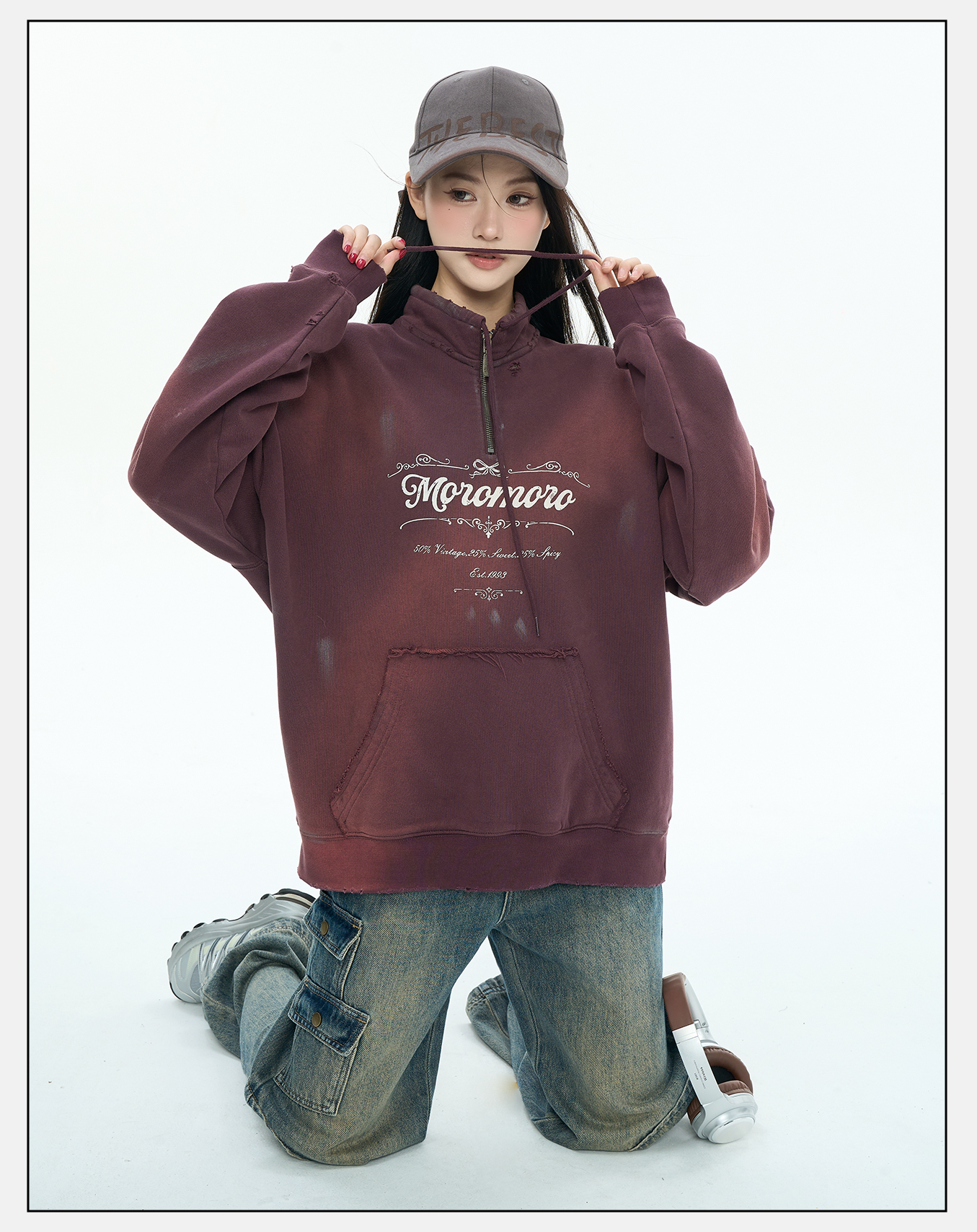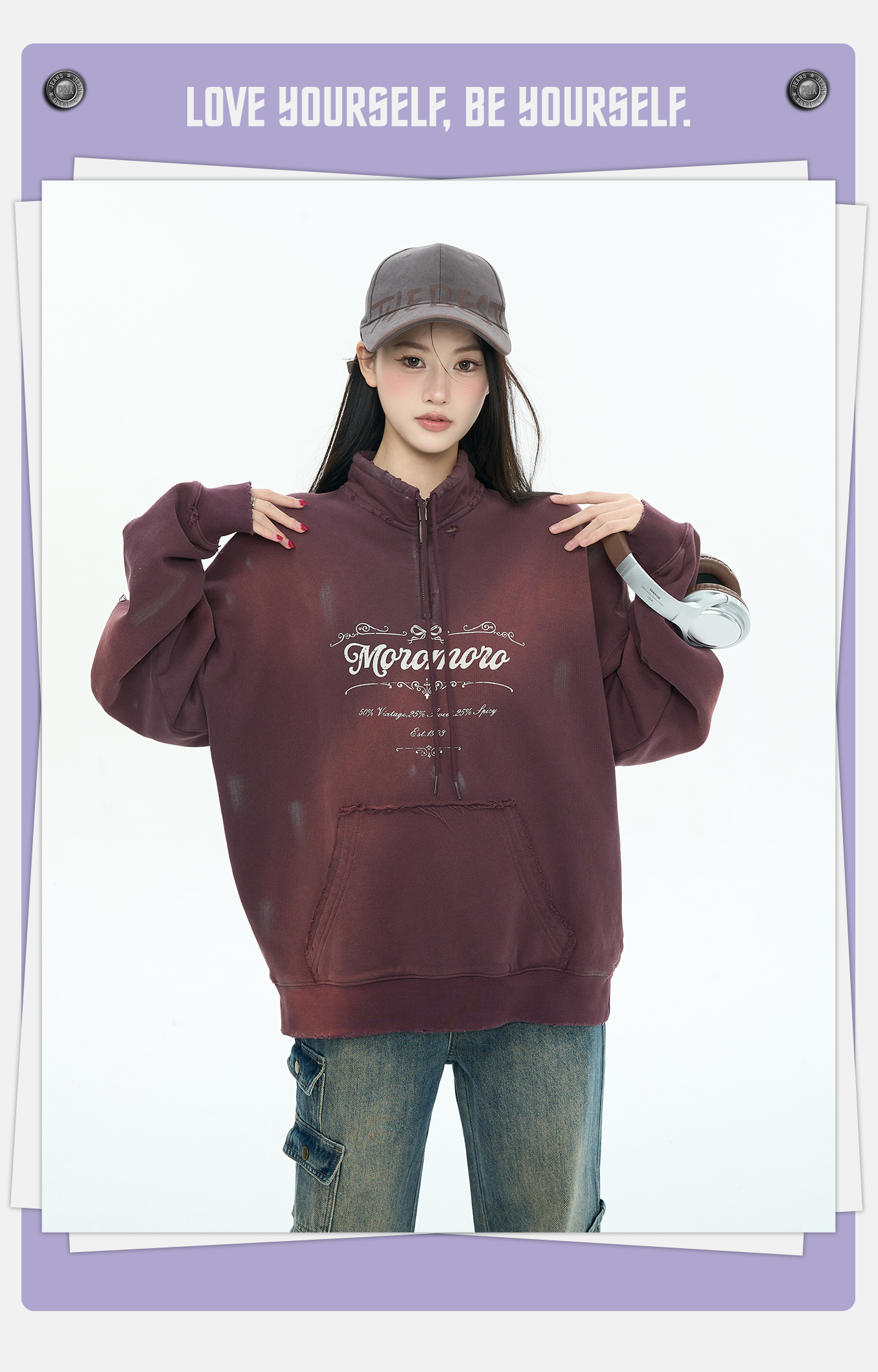 P&X设计师女装2025秋季长袖宽松卫衣翻领做旧字母 825317147 紫色