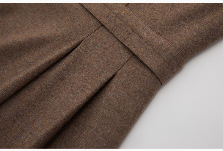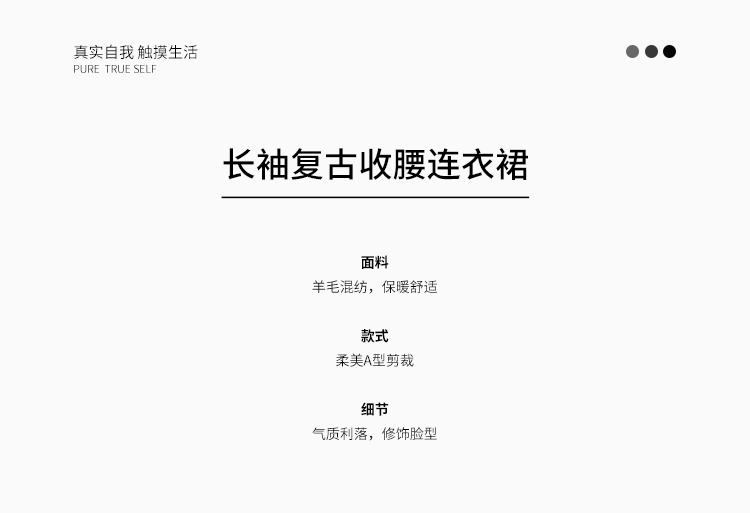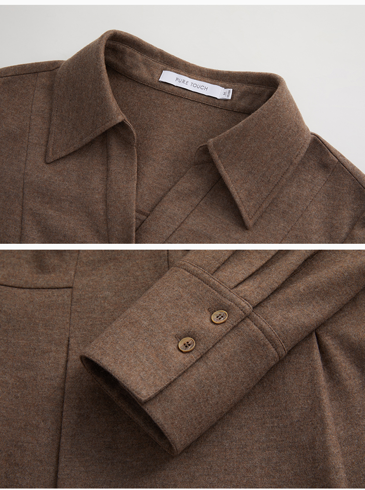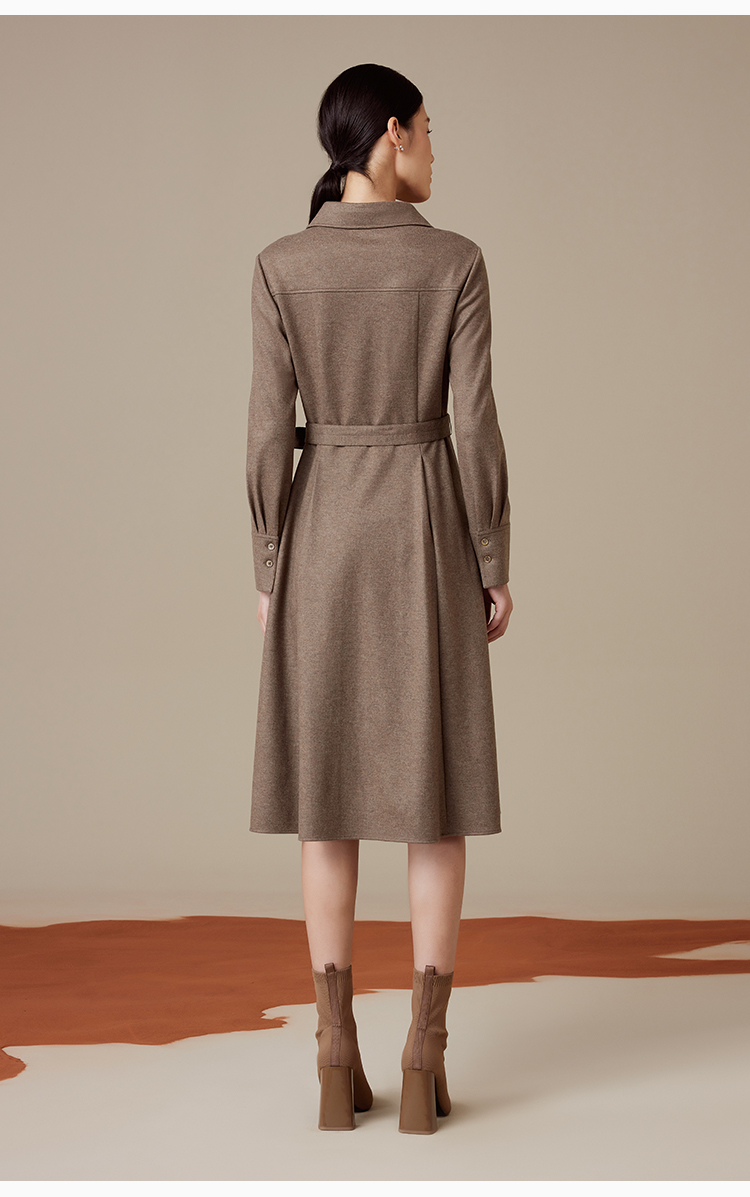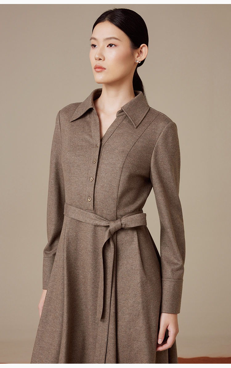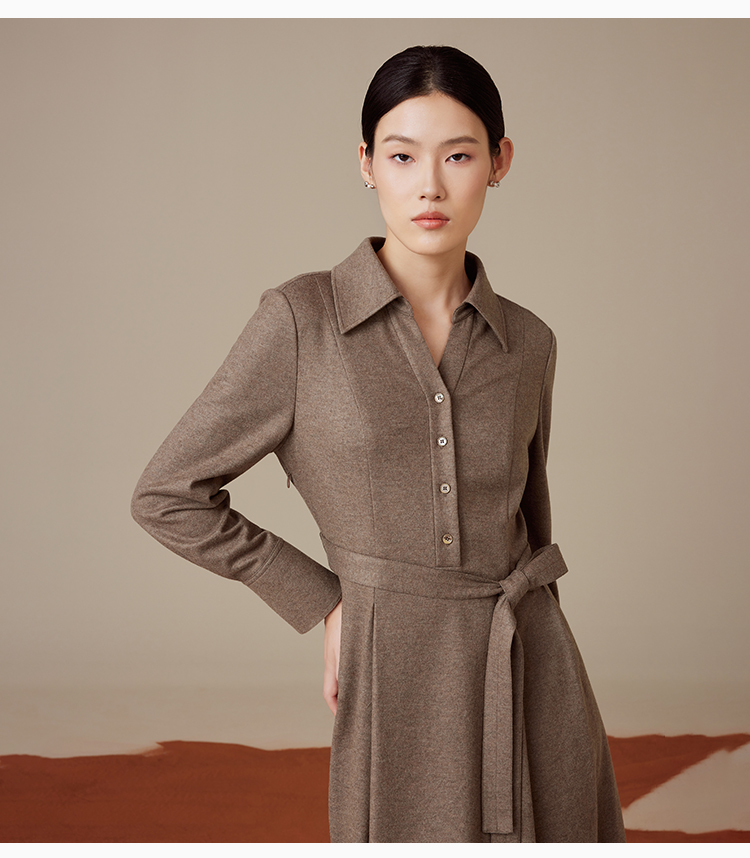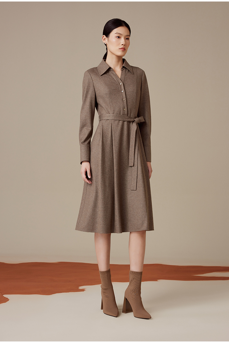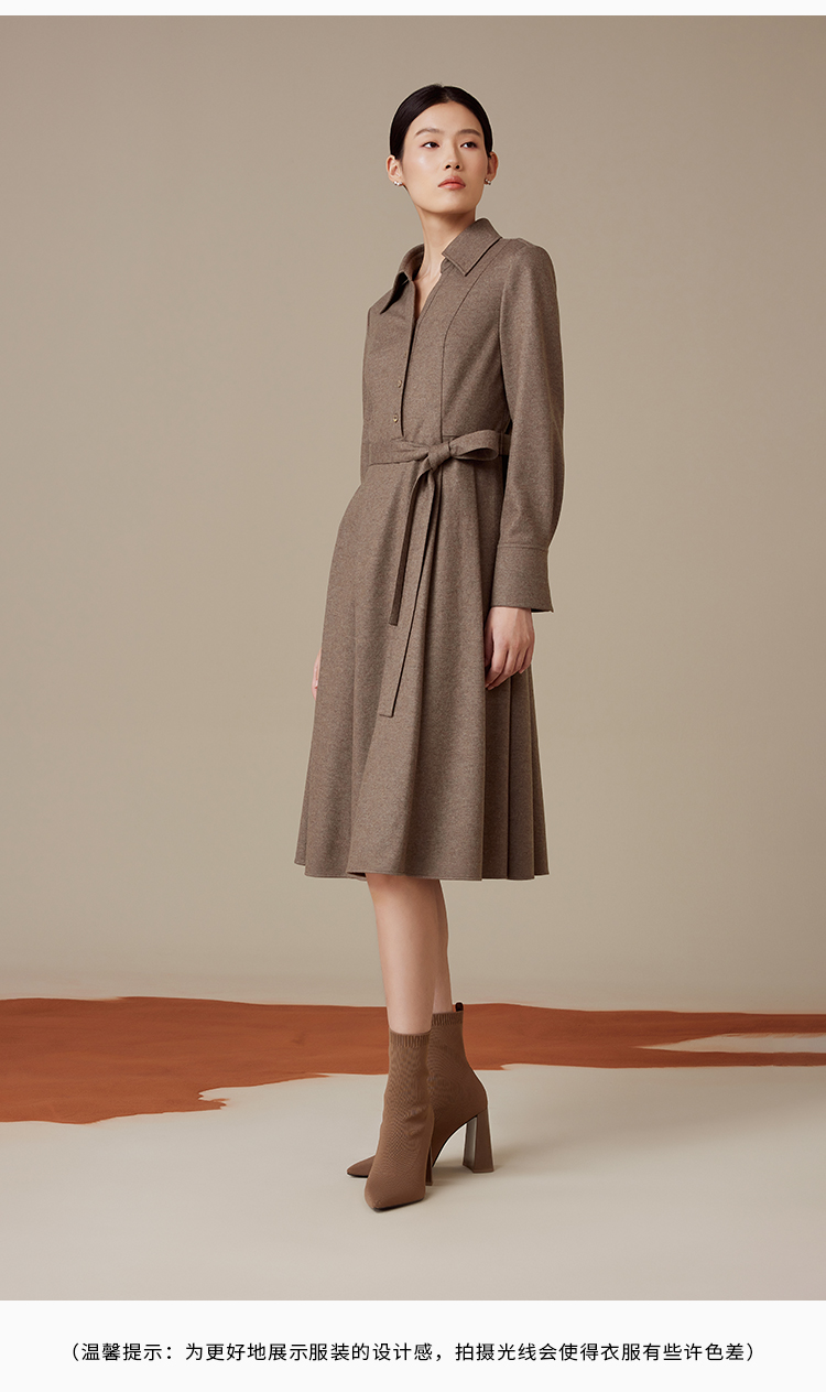puretouch女士流沙色绵羊毛V领腰带中长款连衣裙通勤简约百搭显瘦1349244422