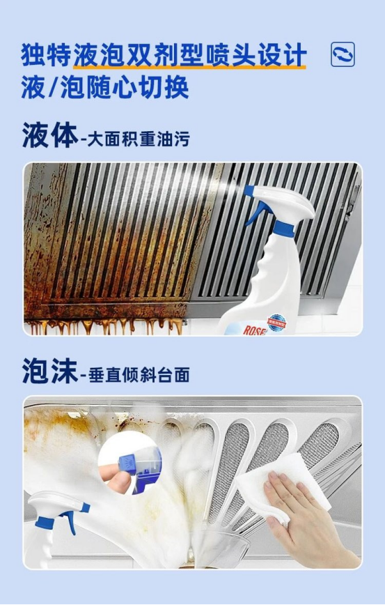 🔺喷雾+泡沫 两种清洁模式随意切换 🔺泡沫不滴落 可持续挂壁分解油污 🔺天然植物配方 淡淡的果味清香很好闻