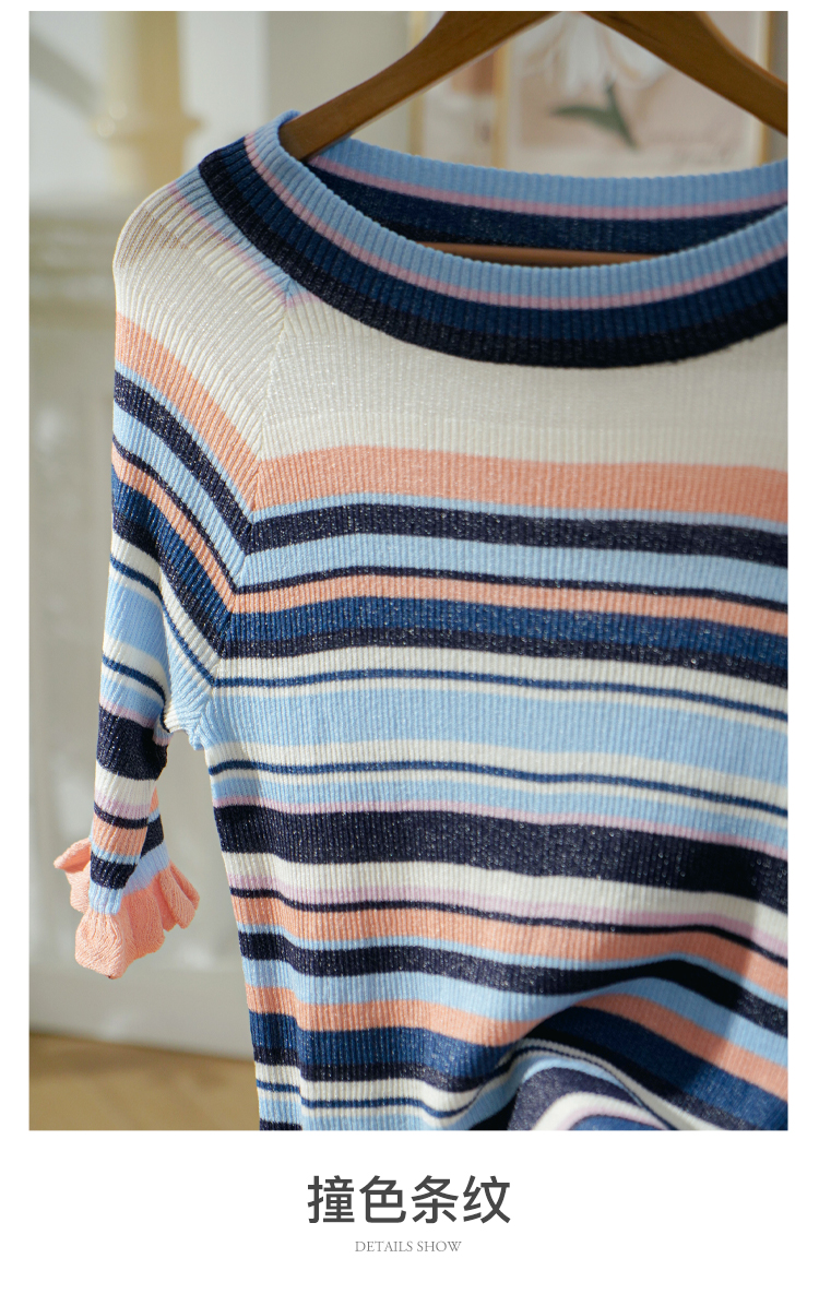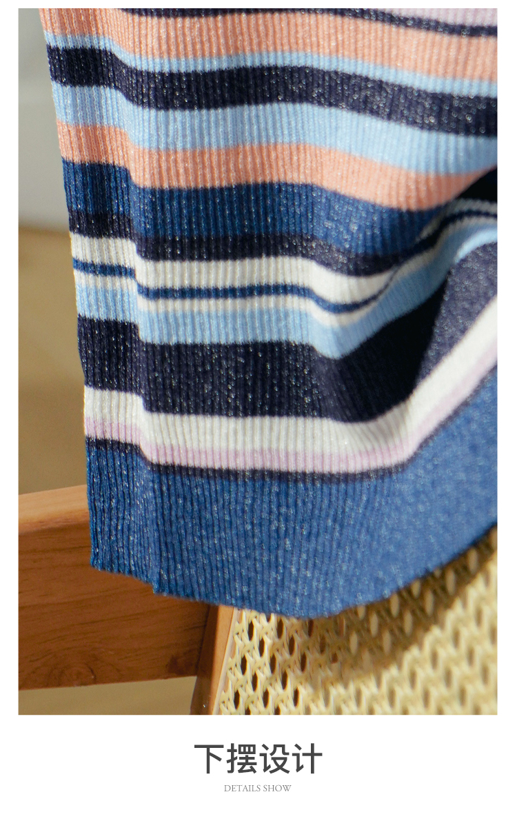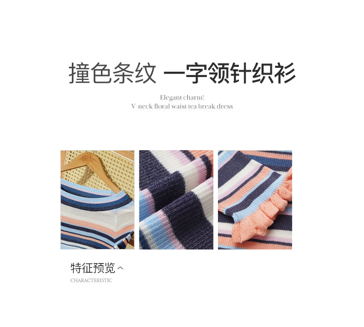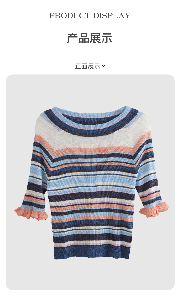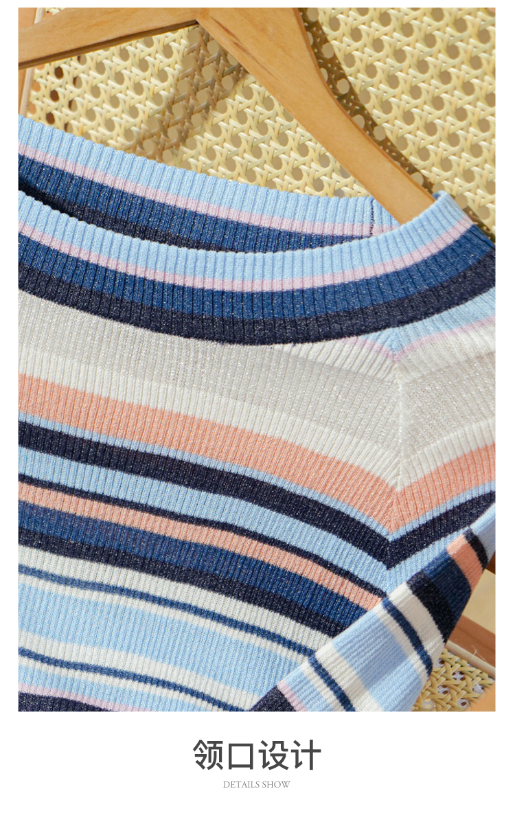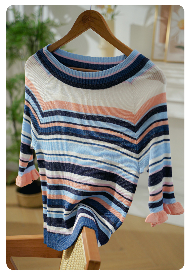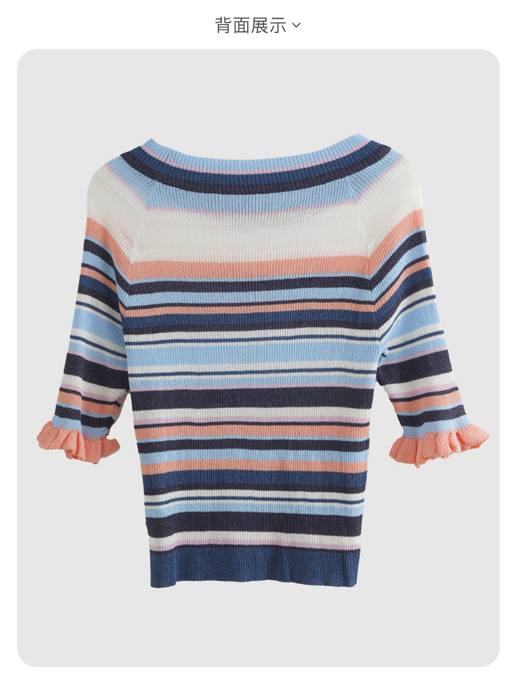 欧芮儿年新款七分袖一字领彩虹毛针织衫女套头修身上衣