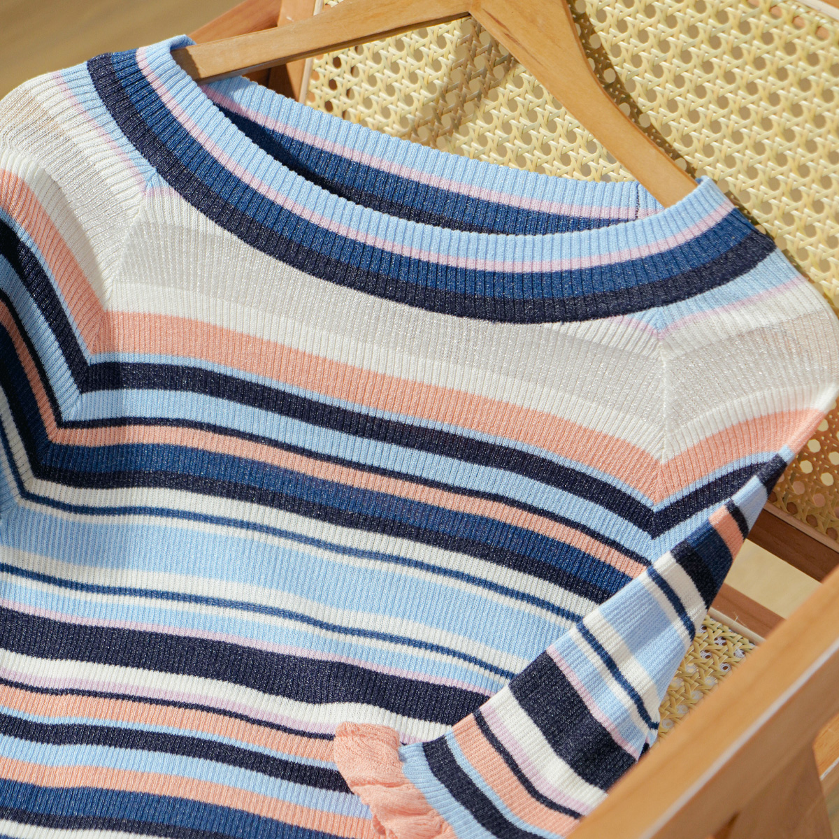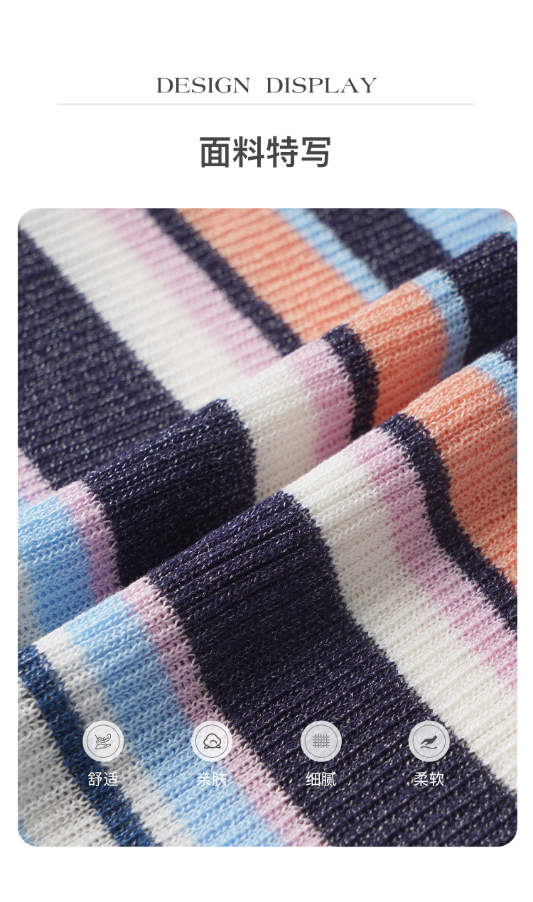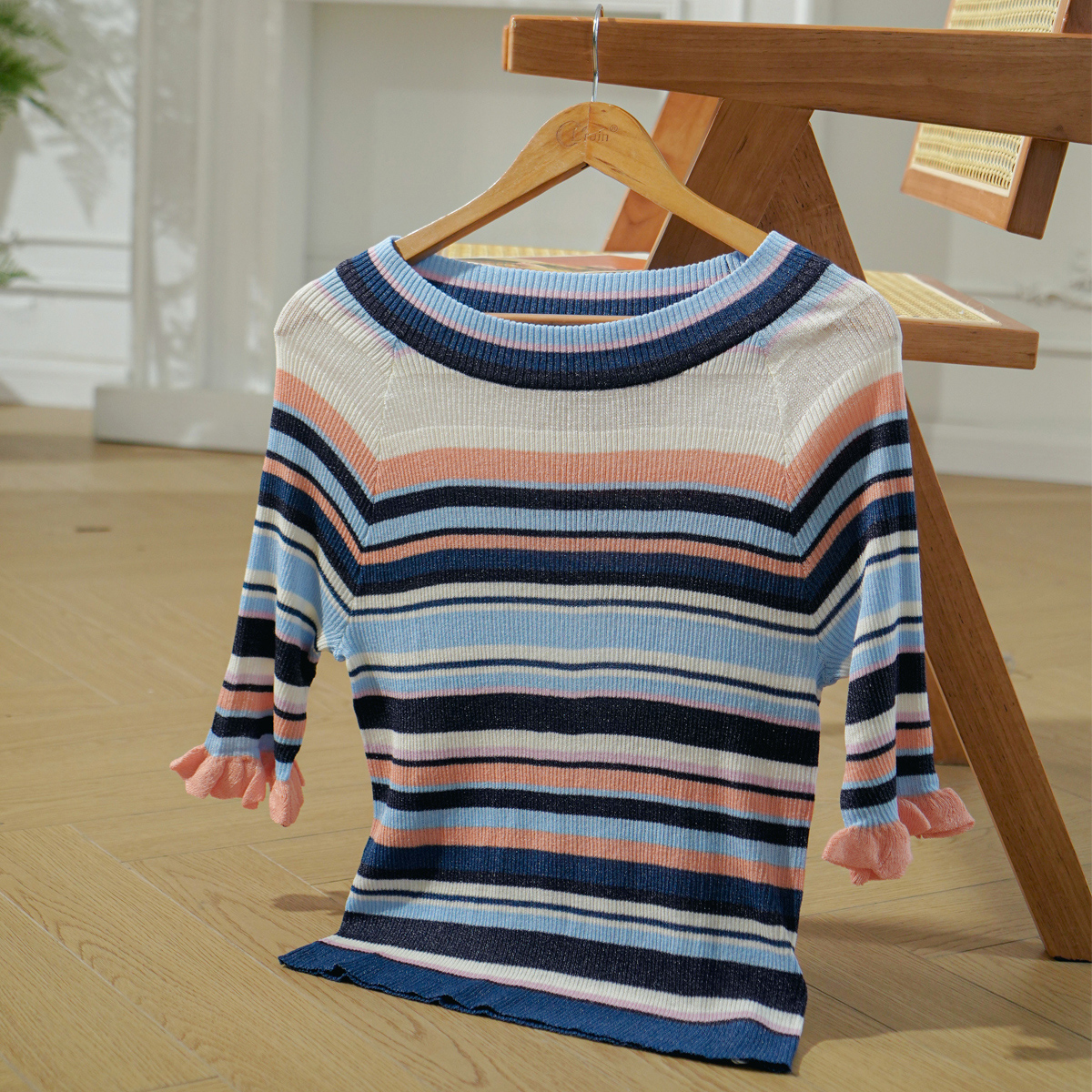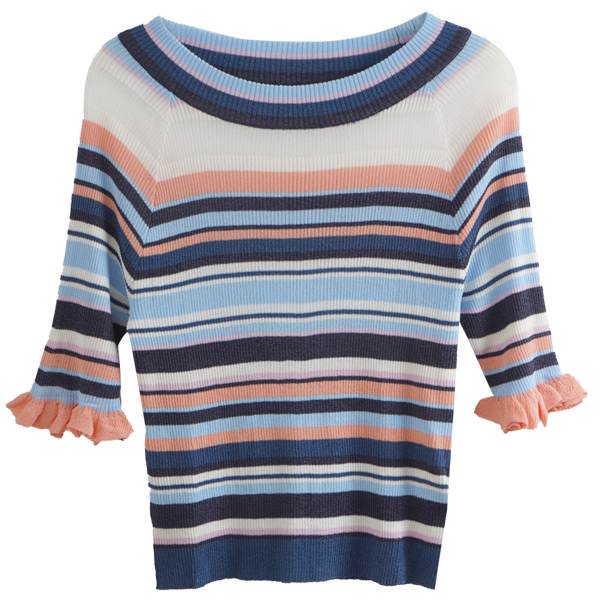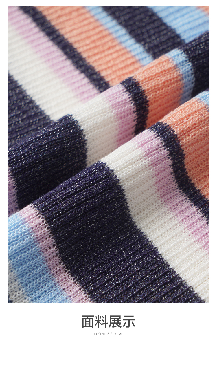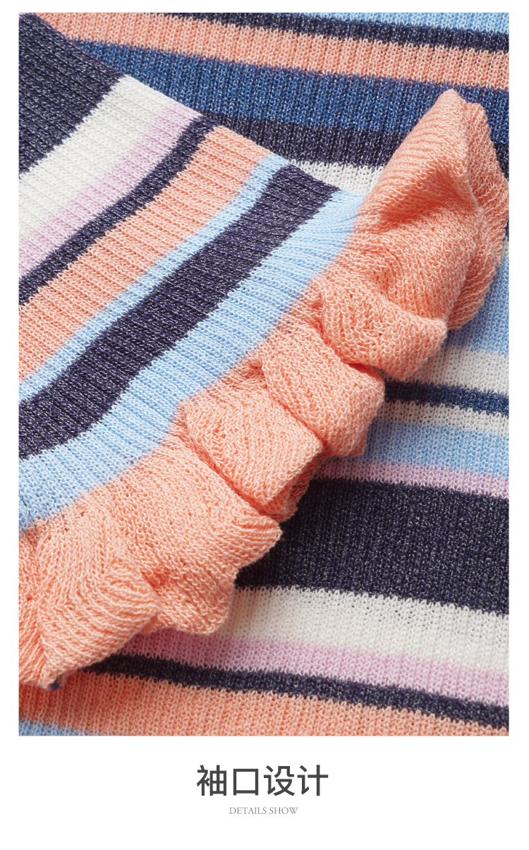 欧芮儿年新款七分袖一字领彩虹毛针织衫女套头修身上衣