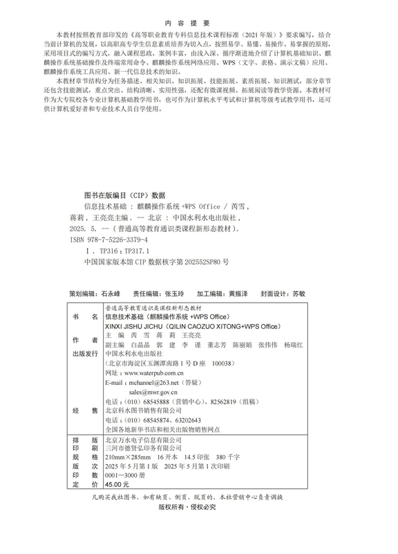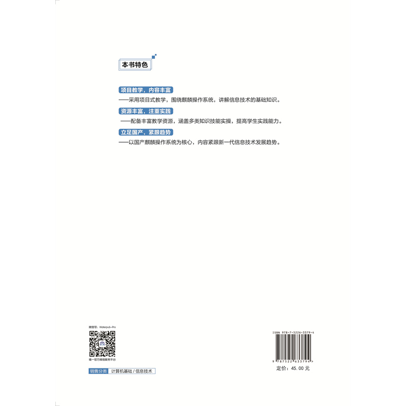 本教材按照教育部印发的《高等职业教育专科信息技术课程标准(2021年版)》要求编写,结合当前计算机的发展,以高职高专学生信息素质培养为切入点,按照易学、易懂、易操作、易掌握的原则,采用项目式的编写方式,融入课程思政,案例丰富,由浅入深、循序渐进地介绍了计算机基础知识、麒麟操作 系统基础操作及终端常用命令、麒麟操作系统网络应用、WPS(文字、表格、演示文稿)、麒麟操作系统基础操作及终端常用命令、麒麟操作系统网络应用、WPS(文字、表格、演示文稿)应用、麒麟操作系统工具应用、新一代信息技术的知识。 本教材章节结构分为任务描述、相关知识、知识拓展,部分章节还包含技能拓展、素质拓展、知识测试、技能测试, 重点突出、结构清晰、实用性强,还配有微课视频、拓展阅读等教学资源。本教材可作为大专院校各专业 计算机基础教学用书,也可作为计算机水平考试和计算机等级考试教学用书,还可供计算机爱好者和专 业技术人员自学使用。