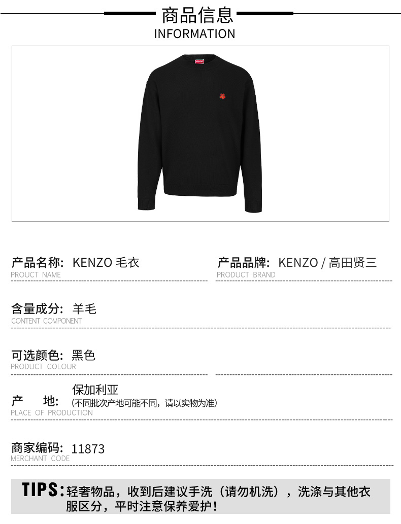 【超惠秒】KENZO 高田贤三 男士全羊毛海棠花刺绣logo百搭套头毛衣/卫衣外套11873