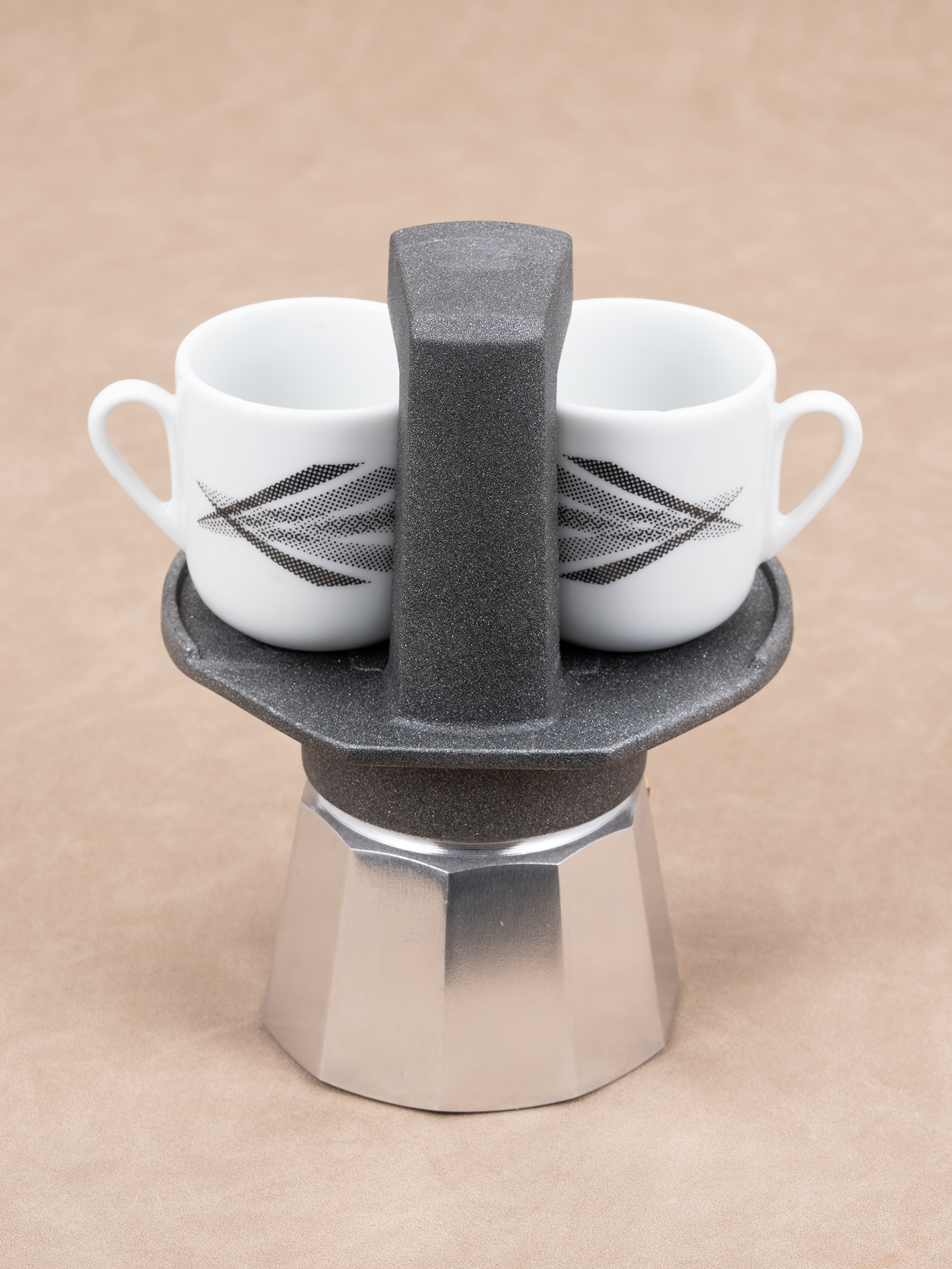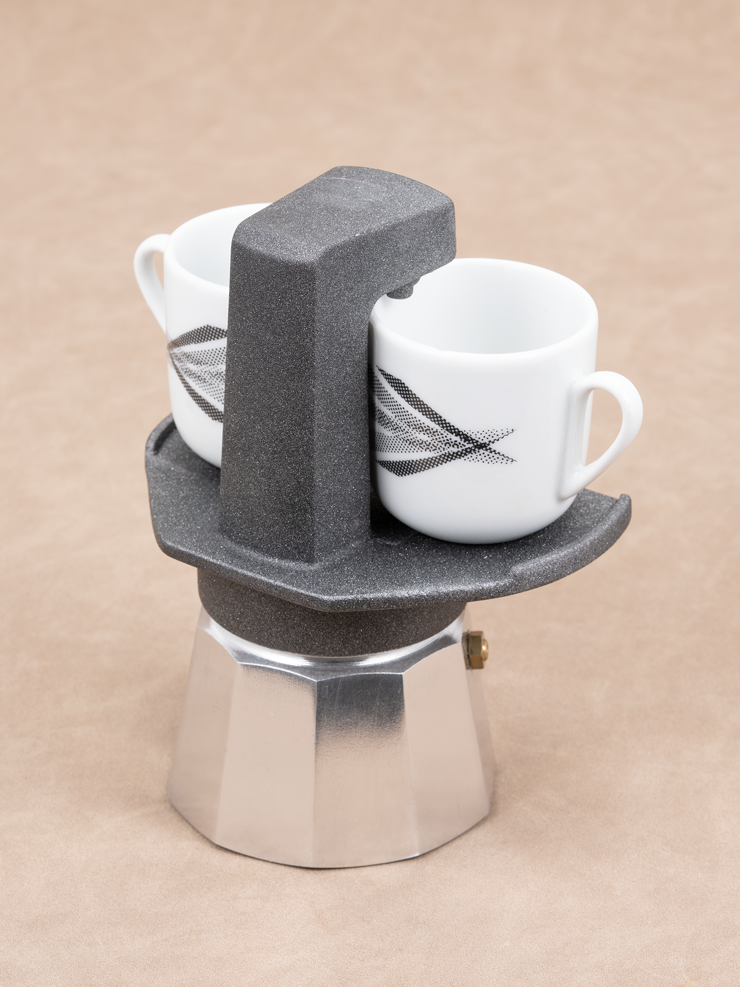 该壶的设计是最大的特色,也正因为此,被现代艺术博物馆 MOMA 收录。它的上壶被设计成一个可以放两个杯子的台面,与一个一次出两杯的宽面双头壶。下壶有两种款式:铝制款和不锈钢款。有没有发现,有台面的咖啡壶,显得特别有仪式感。