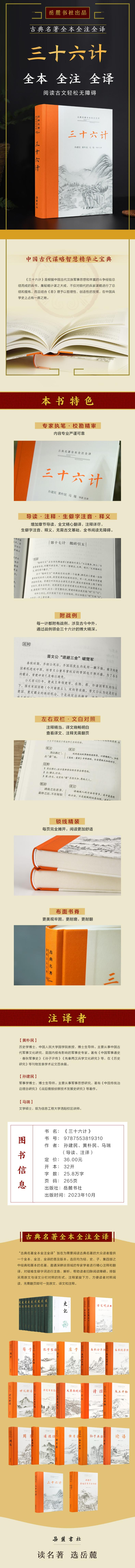 《三十六计》或称三十六策,是指中国古代三十六个兵法策略,是一部集历代兵家诡道之大成的兵书,总结了以往战争中施计用诈的实践经验,包含有朴素的军事辩证法思想,有较高的参考价值。时至今日,它已经突破了军事领域,广泛运用于政治、经济、外交、生活等各个领域,成为人们克敌制胜的法宝和国内外家喻户晓的著作。本书为“古典名著全本全注全译”之一种,以“原文+导读+注释+译文+战例”方式诠释传统兵书经典,帮助普通读者学习军事思想。