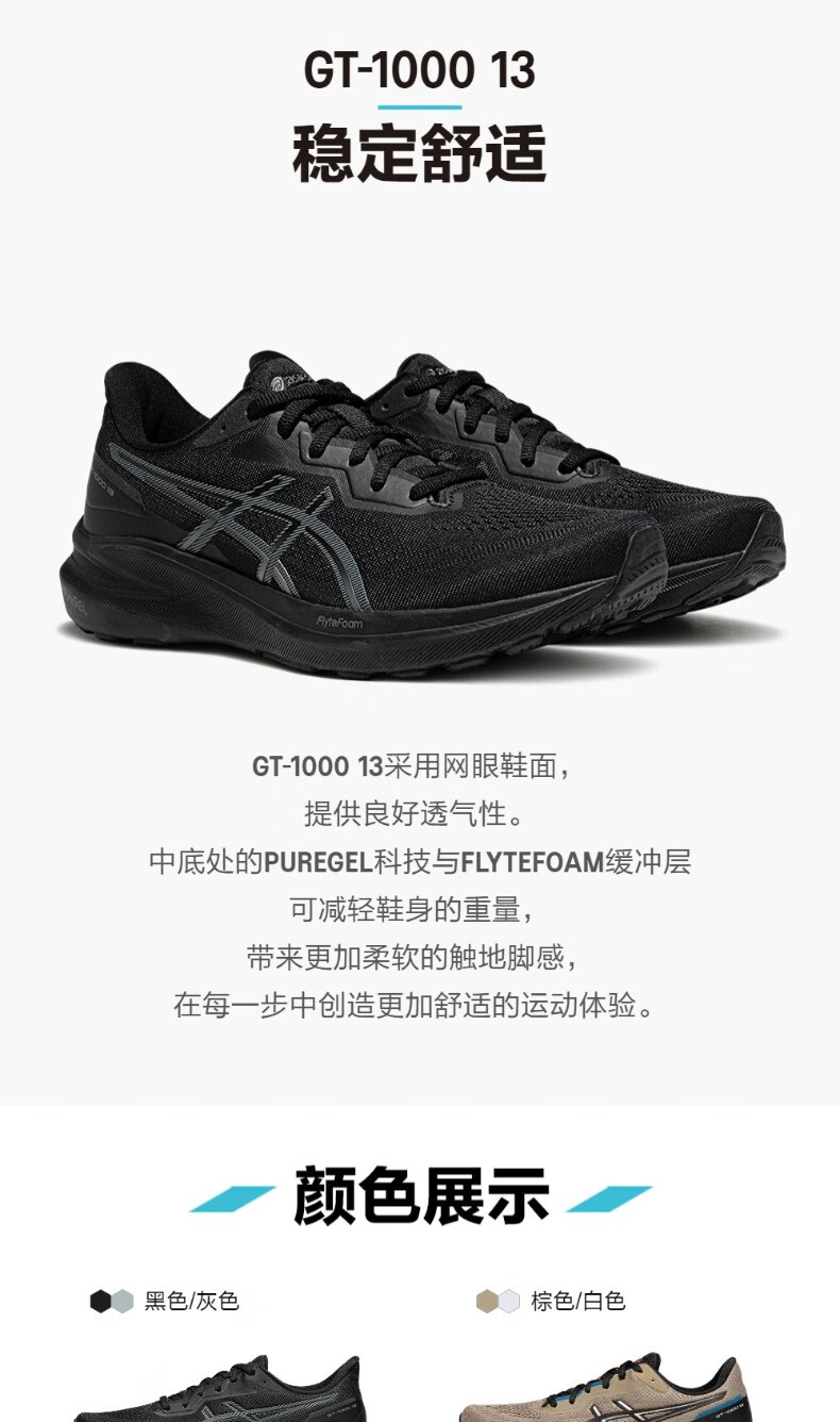 ASICS亚瑟士 GT1000 13 男女款 跑步鞋黑武士稳定支撑缓震透气运动鞋