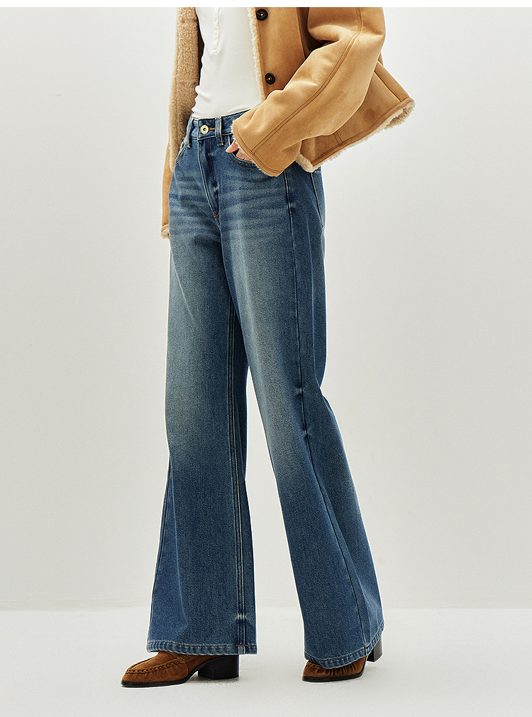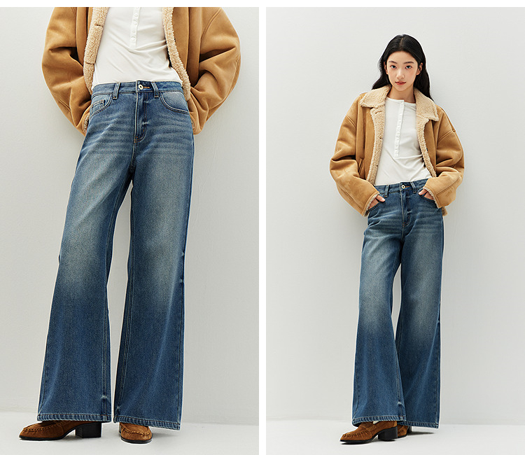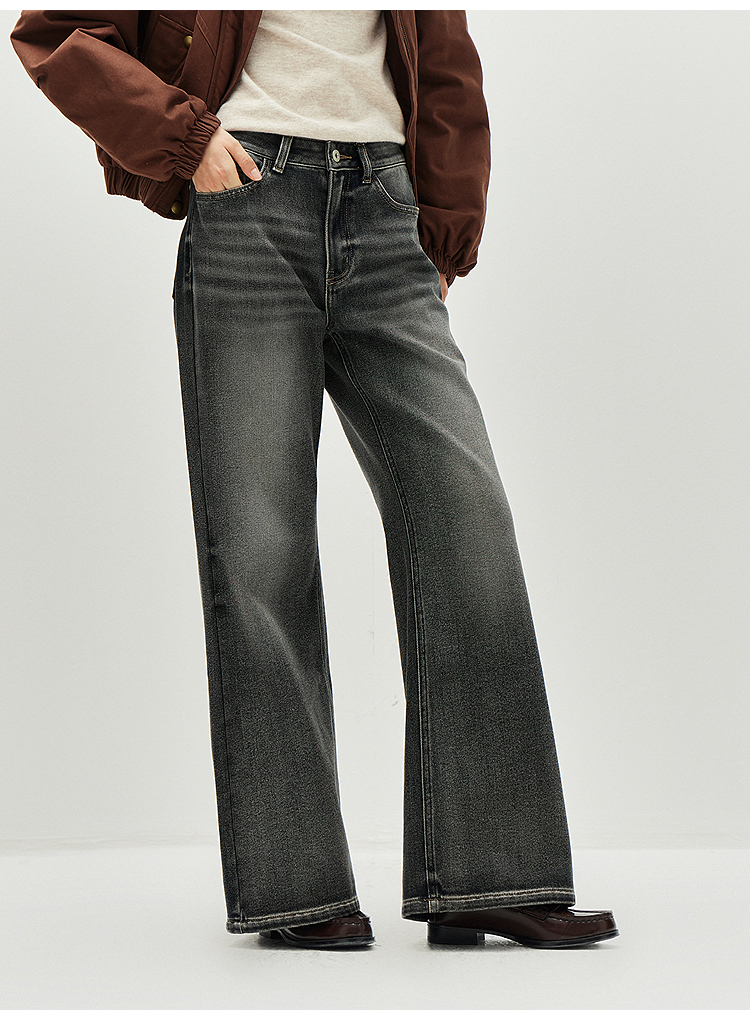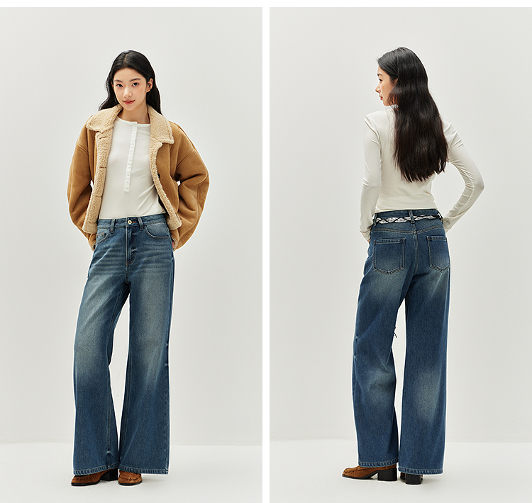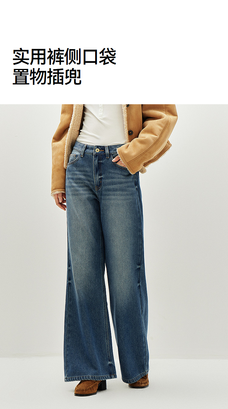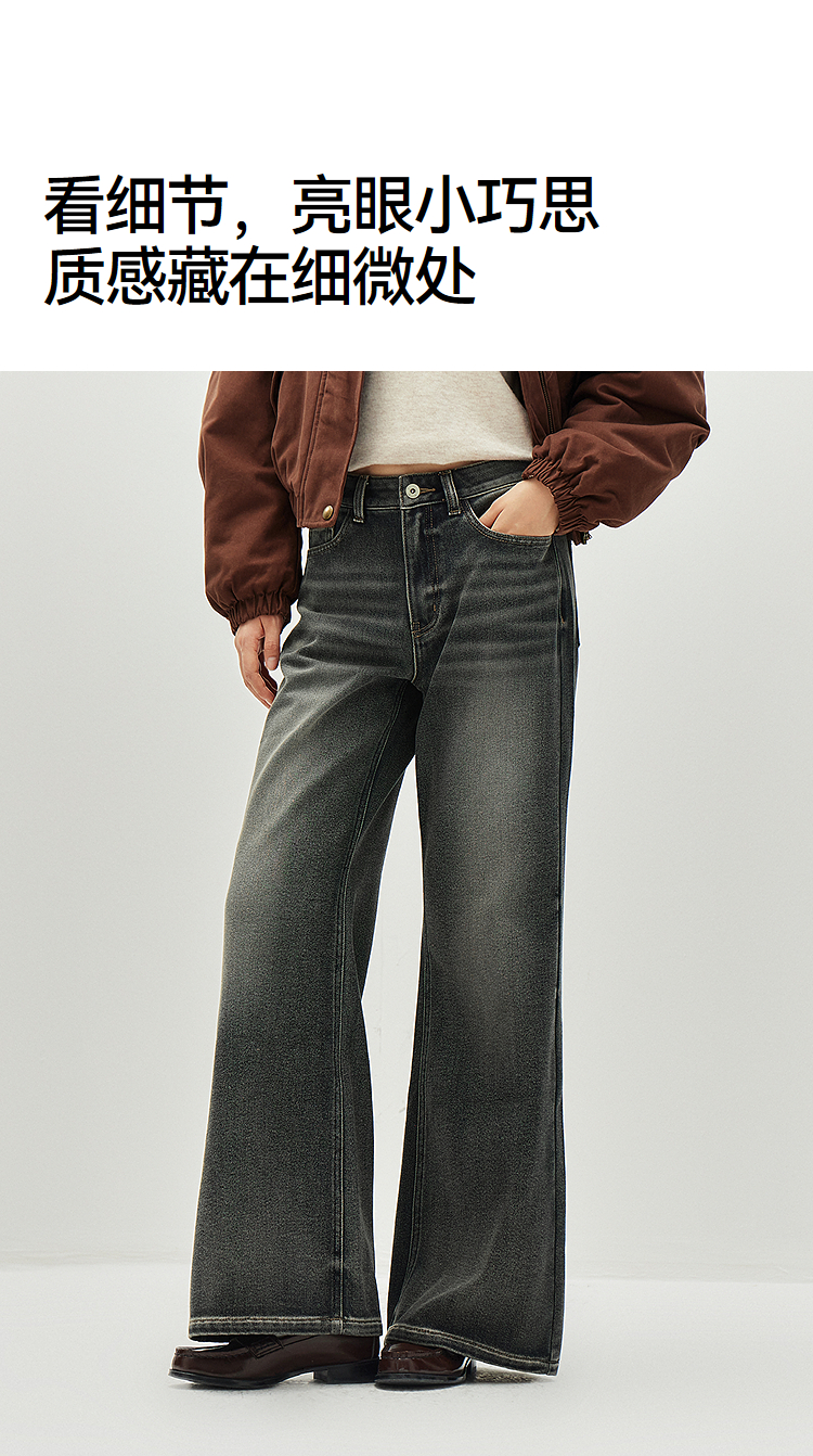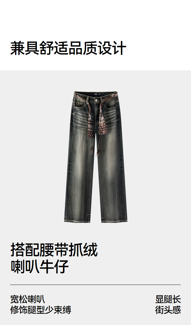 森马牛仔裤女冬腰带抓绒宽松喇叭裤做旧2025新款高街港风街头长裤