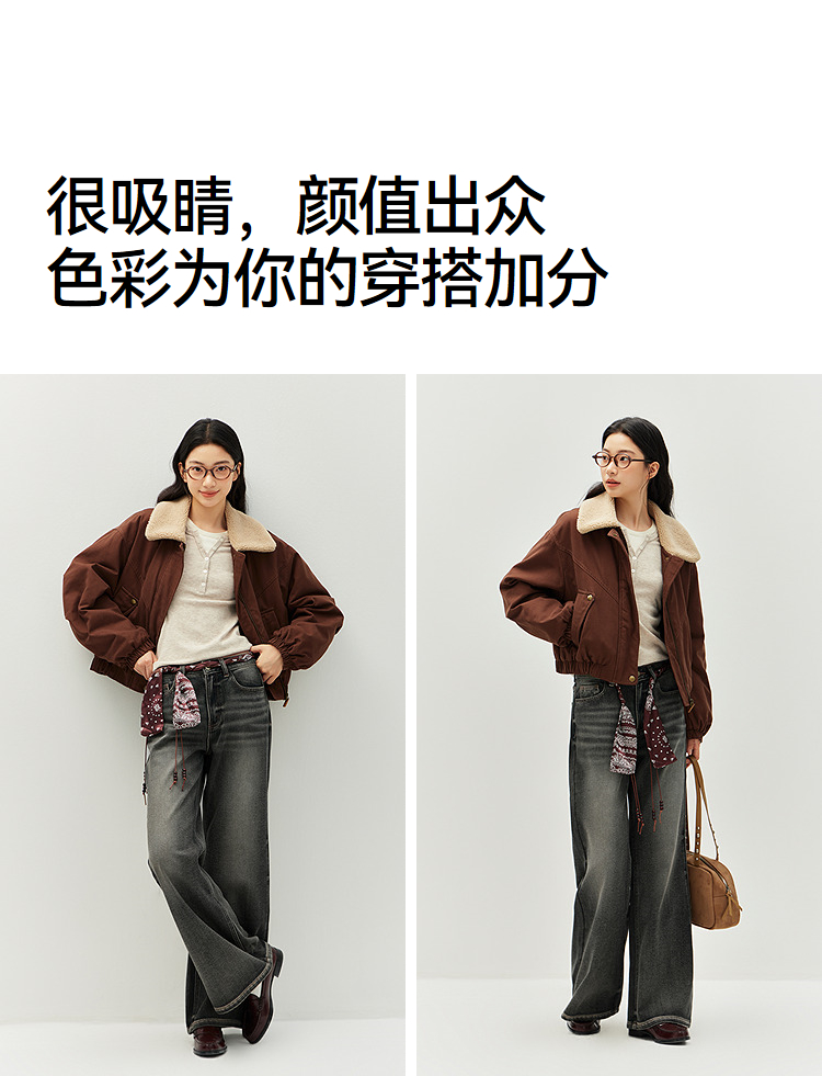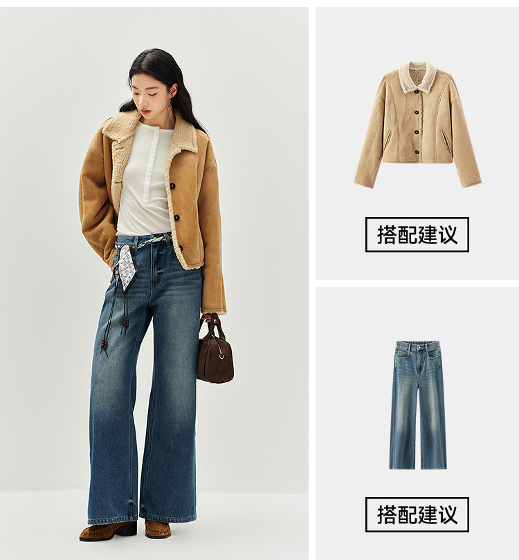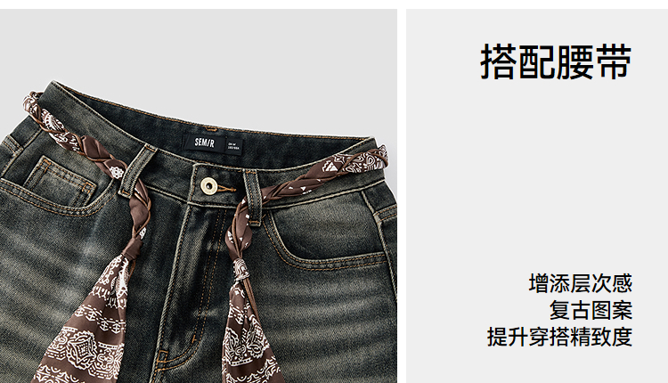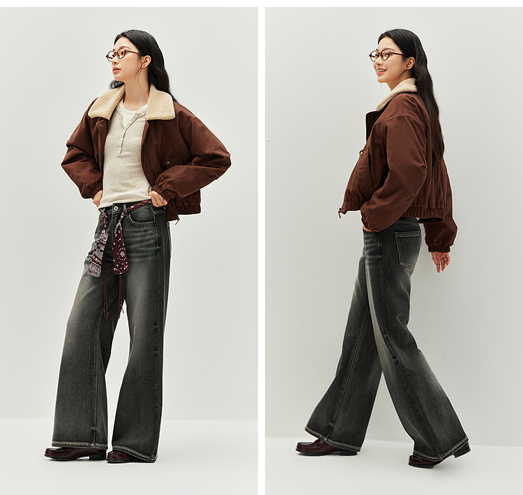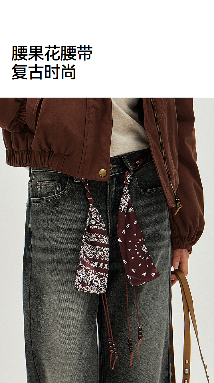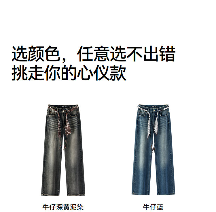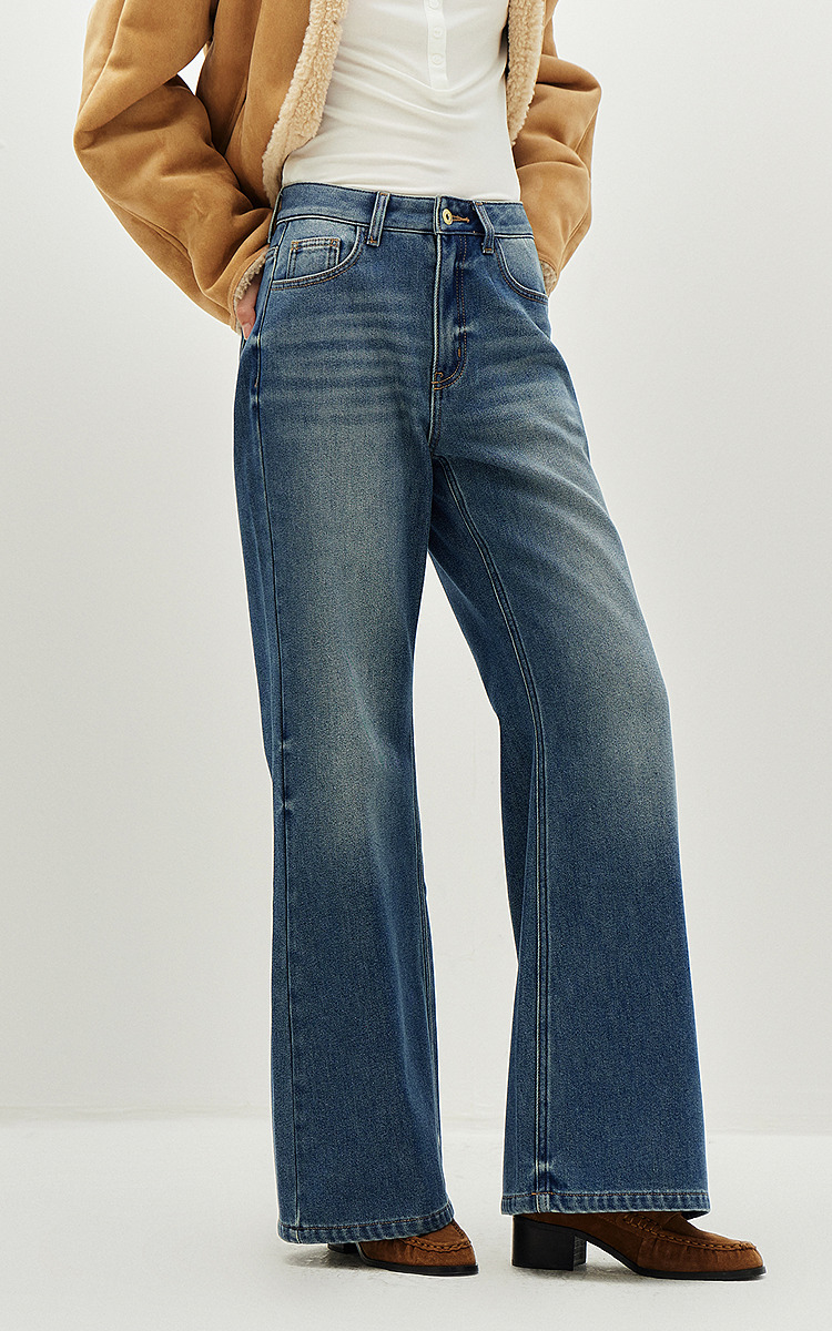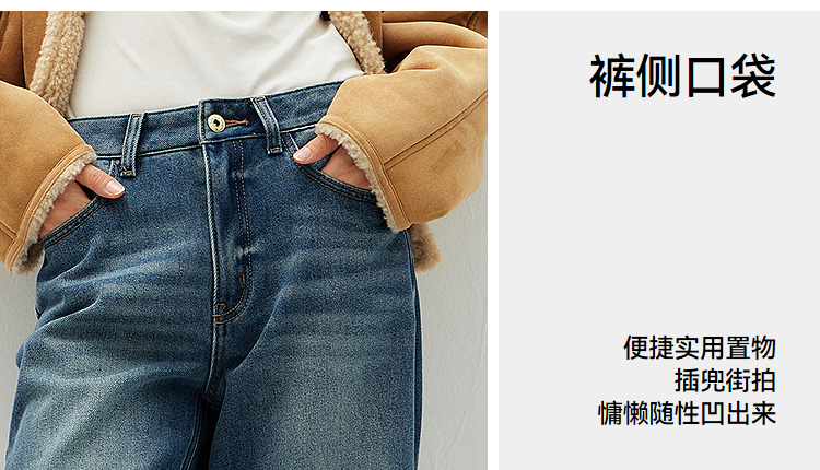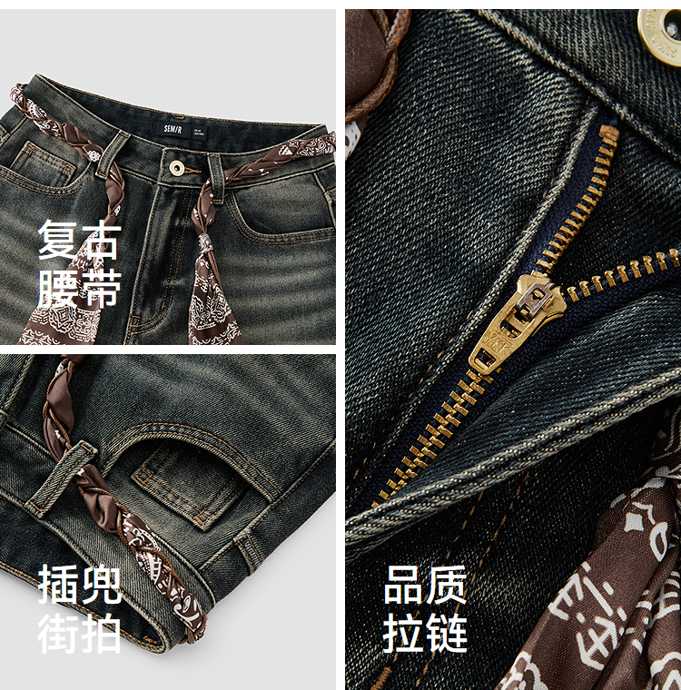 森马牛仔裤女冬腰带抓绒宽松喇叭裤做旧2025新款高街港风街头长裤