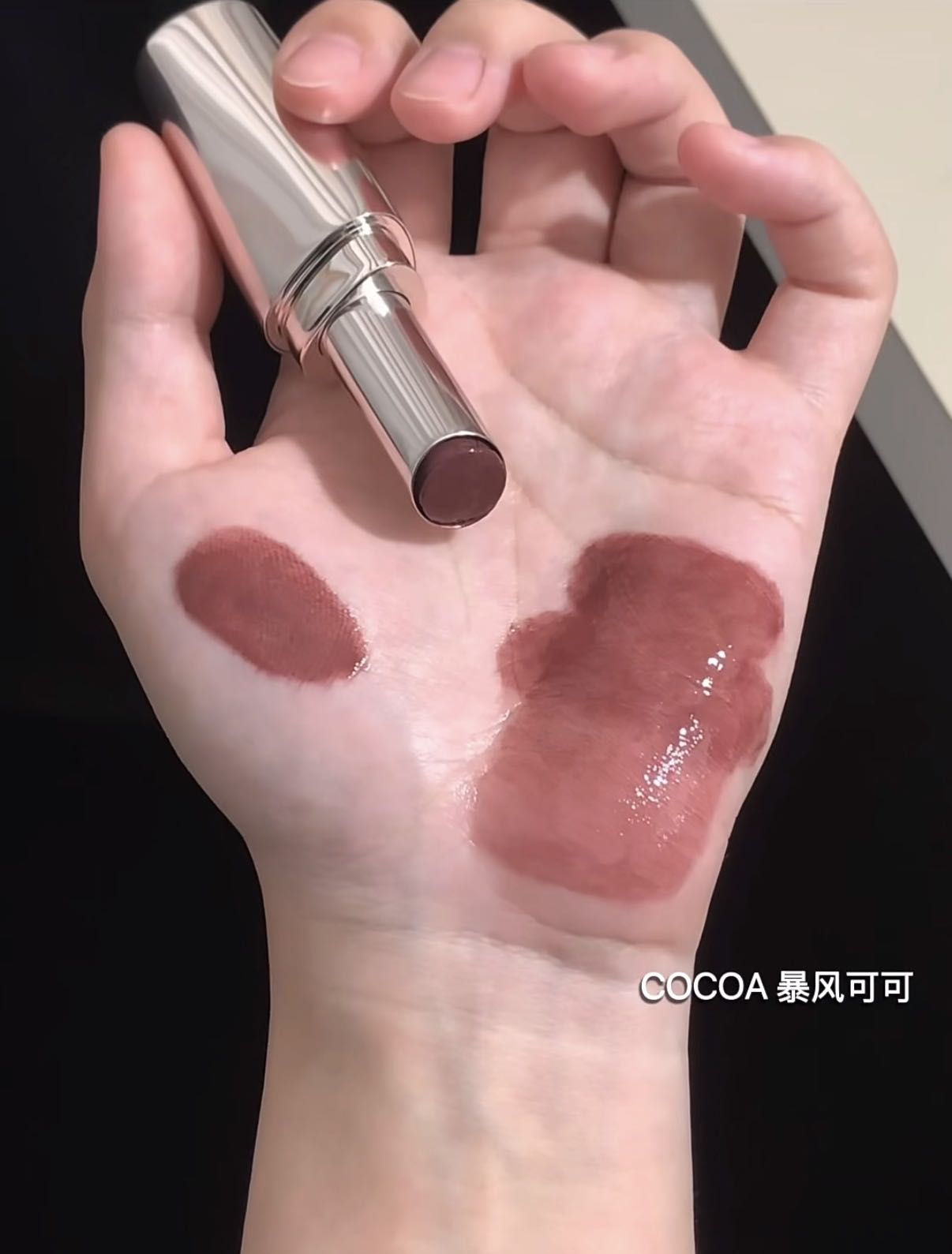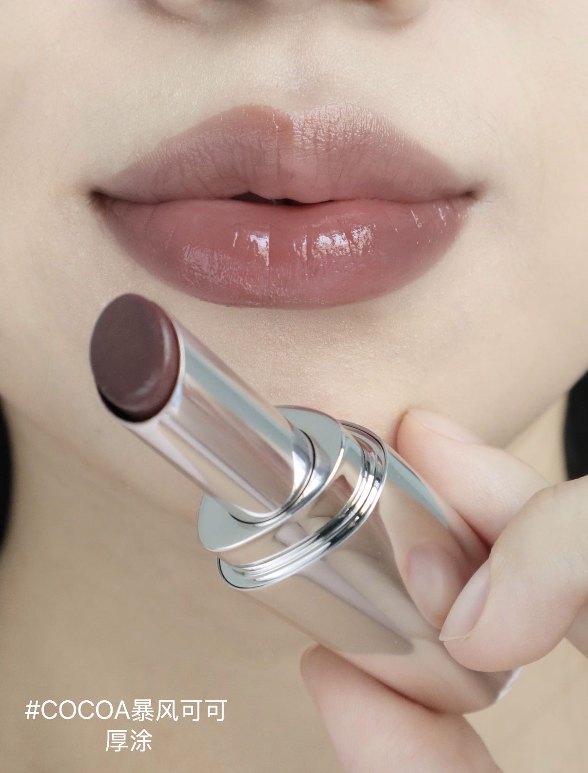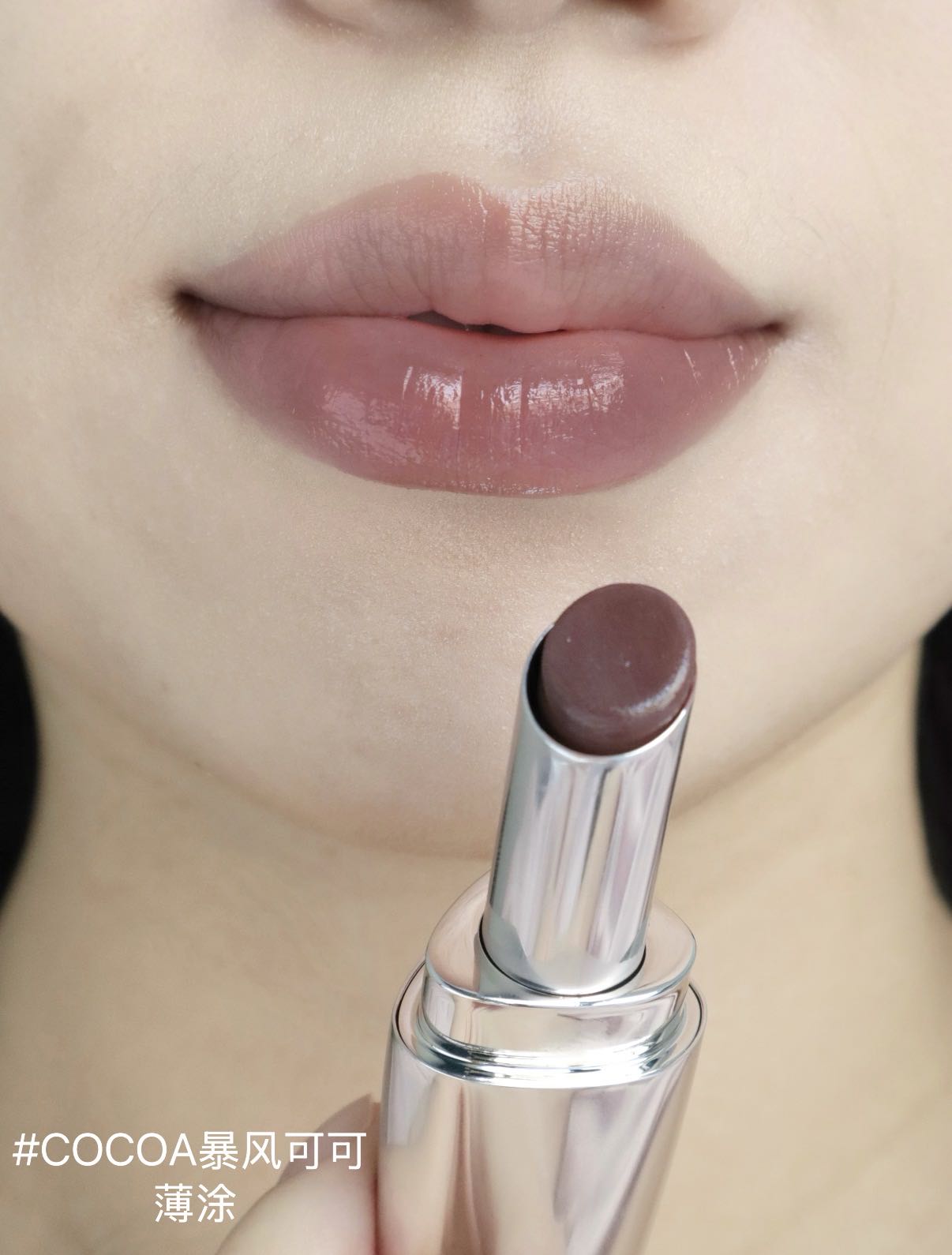 薄透的可可咖啡,颜色覆盖力低,更适合浅唇宝宝,不经意间显现的小清冷感