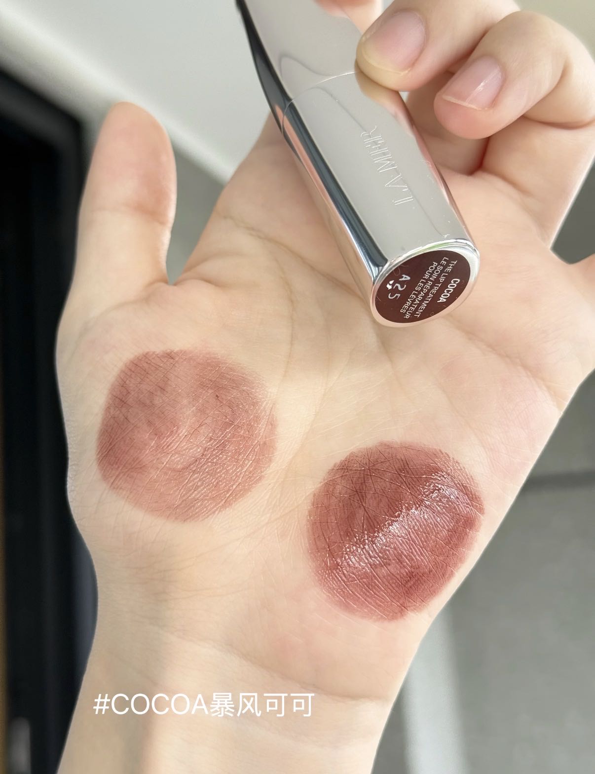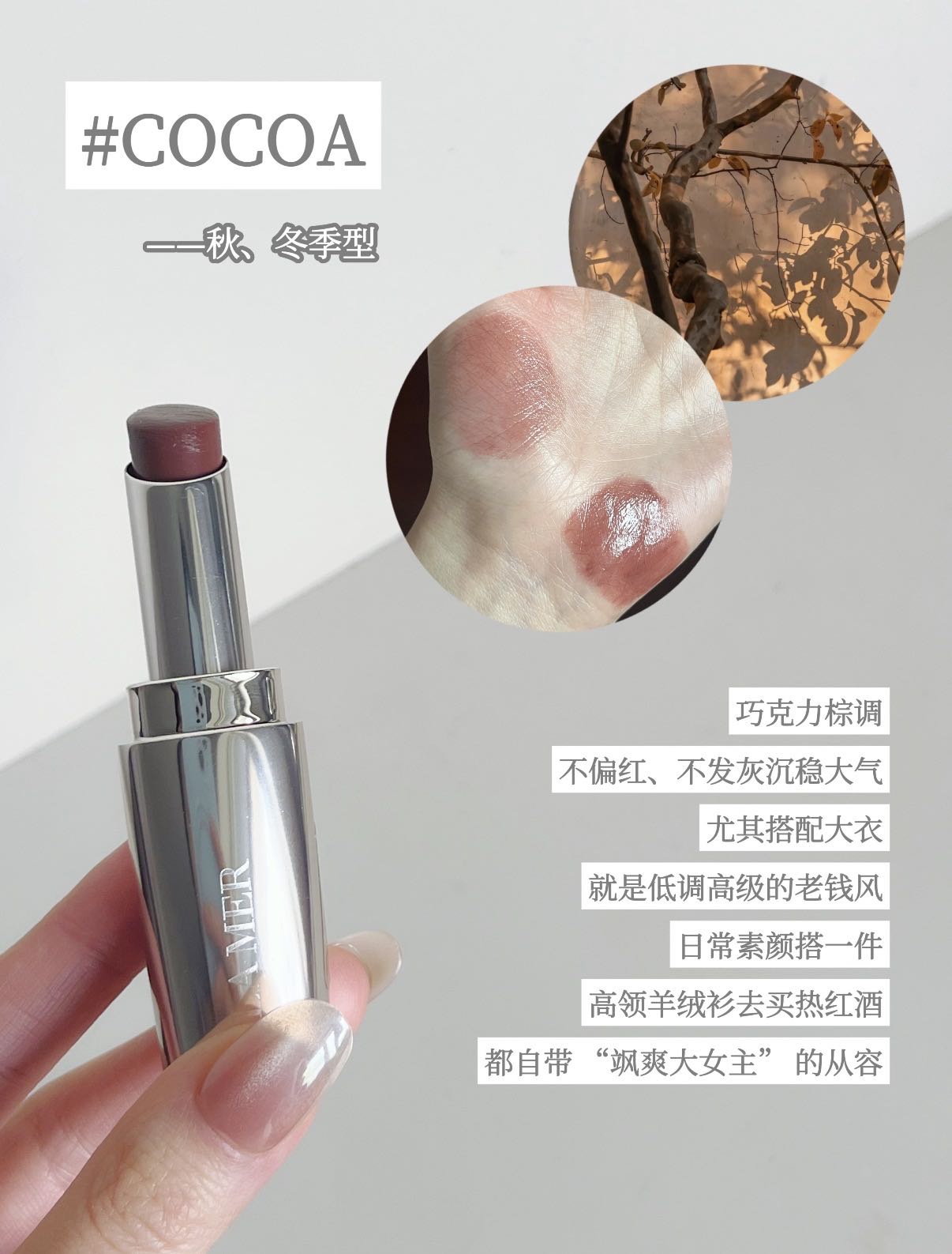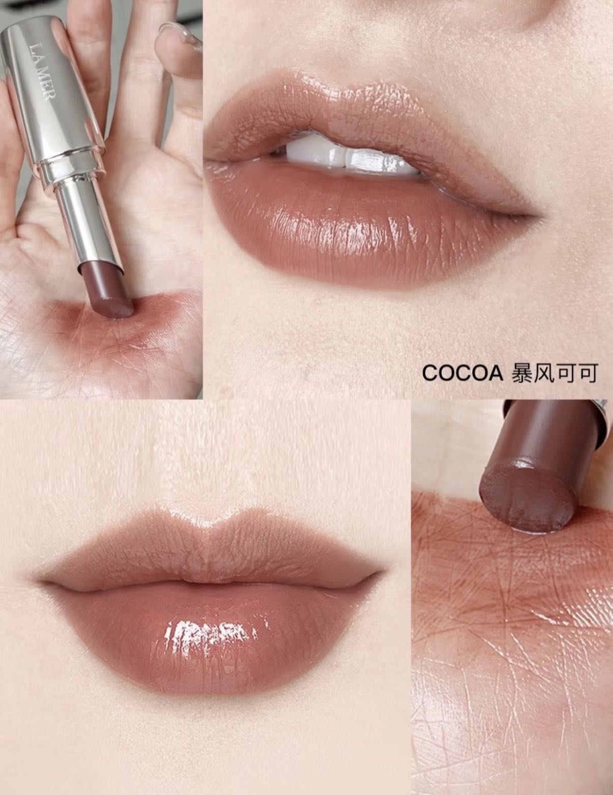 薄透的可可咖啡,颜色覆盖力低,更适合浅唇宝宝,不经意间显现的小清冷感
