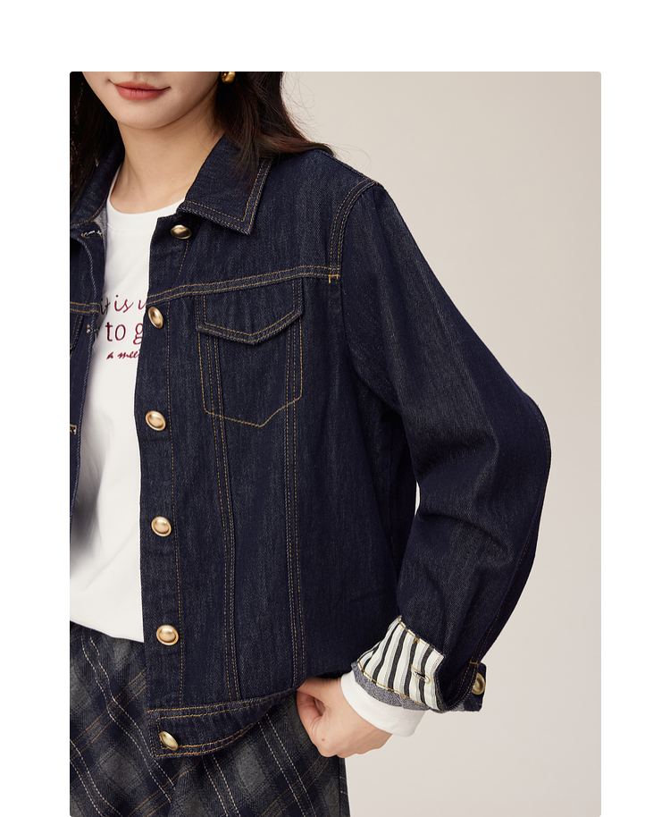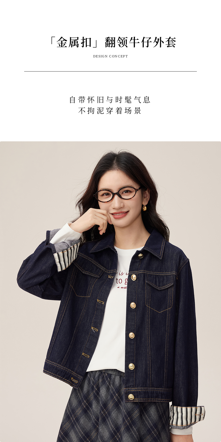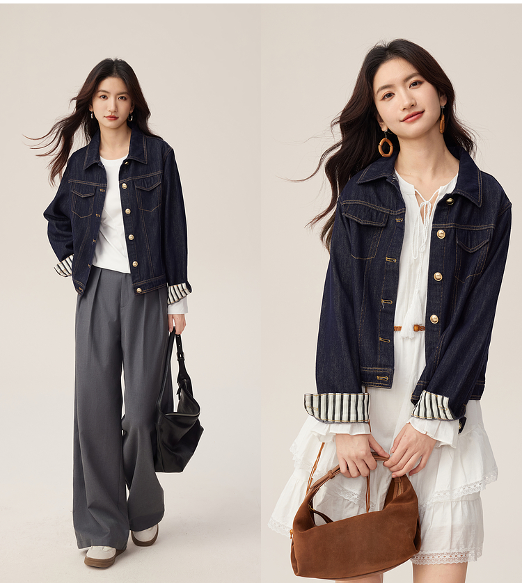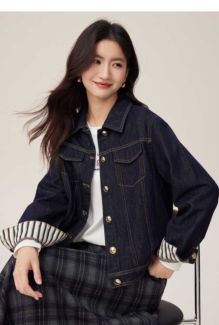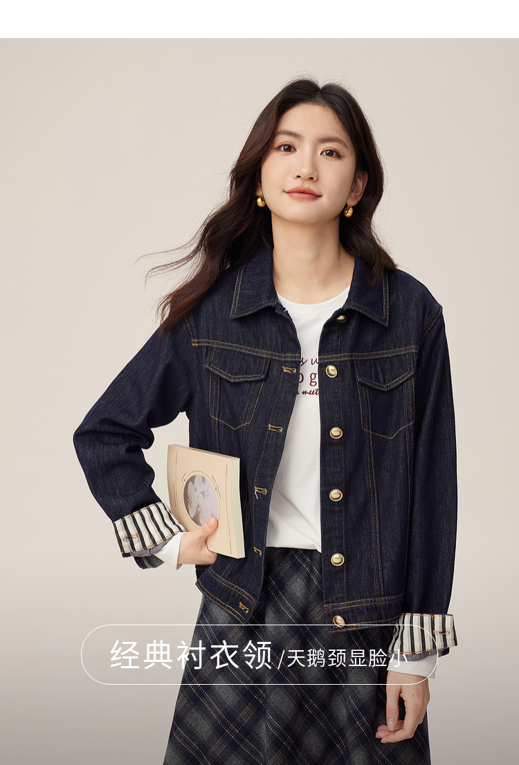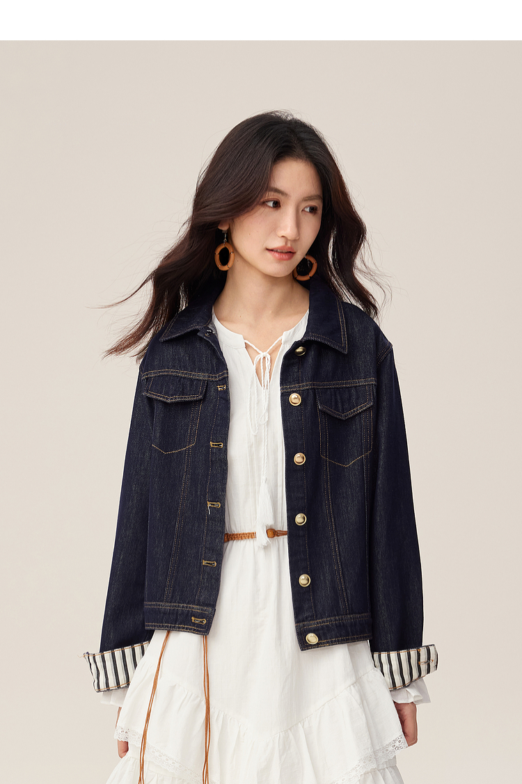 【08/27新品】熙世界原色牛仔外套女秋季2025新款设计感撞色翻边袖牛仔开衫上衣